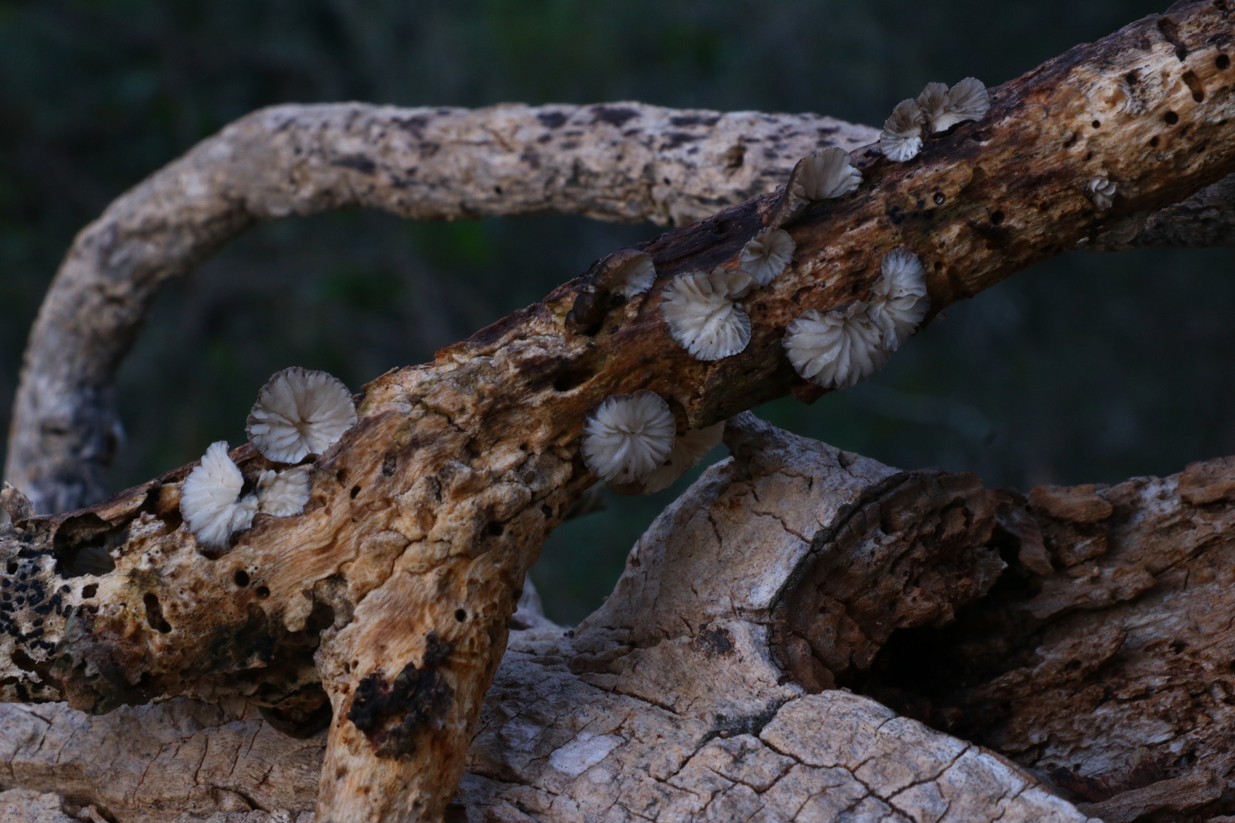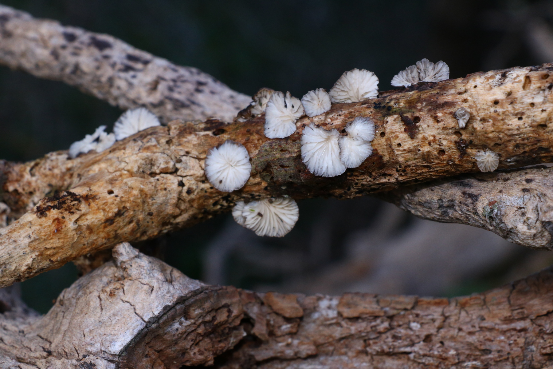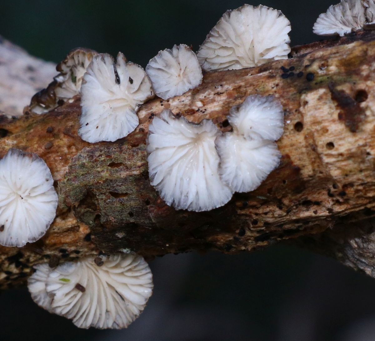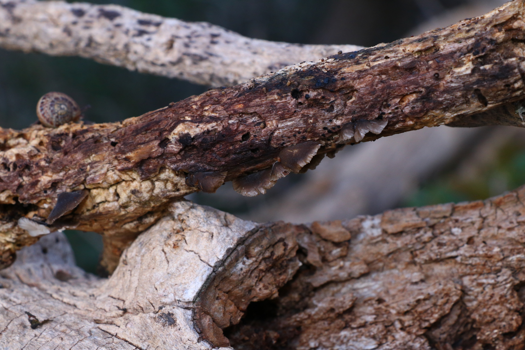 In my archives I have this small fan-shaped bracket fungi, about 2 cm across, growing on fallen branches of Ficus carica (Fig tree). The hymenium is waxy white, very spaced up and turning beige. I was thinking about Panellus (serotinus maybe) but could be other fleshy species. Help is appreciated