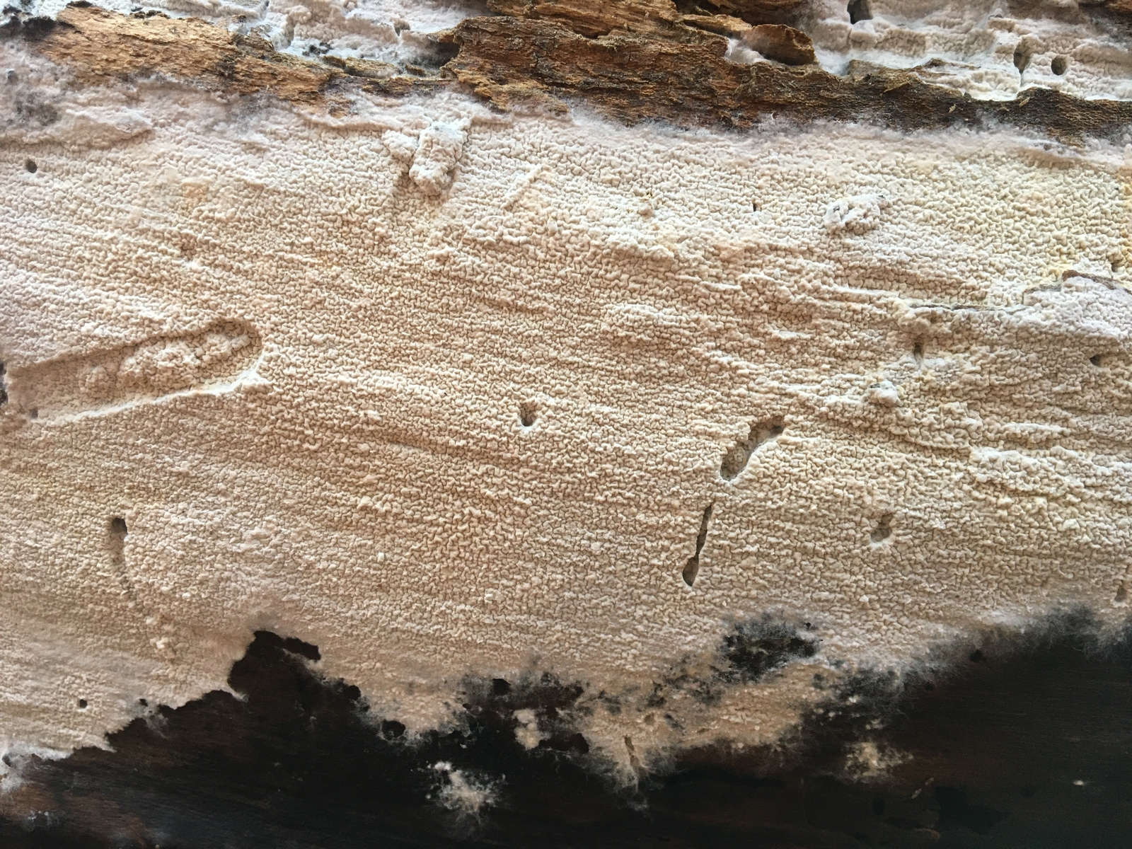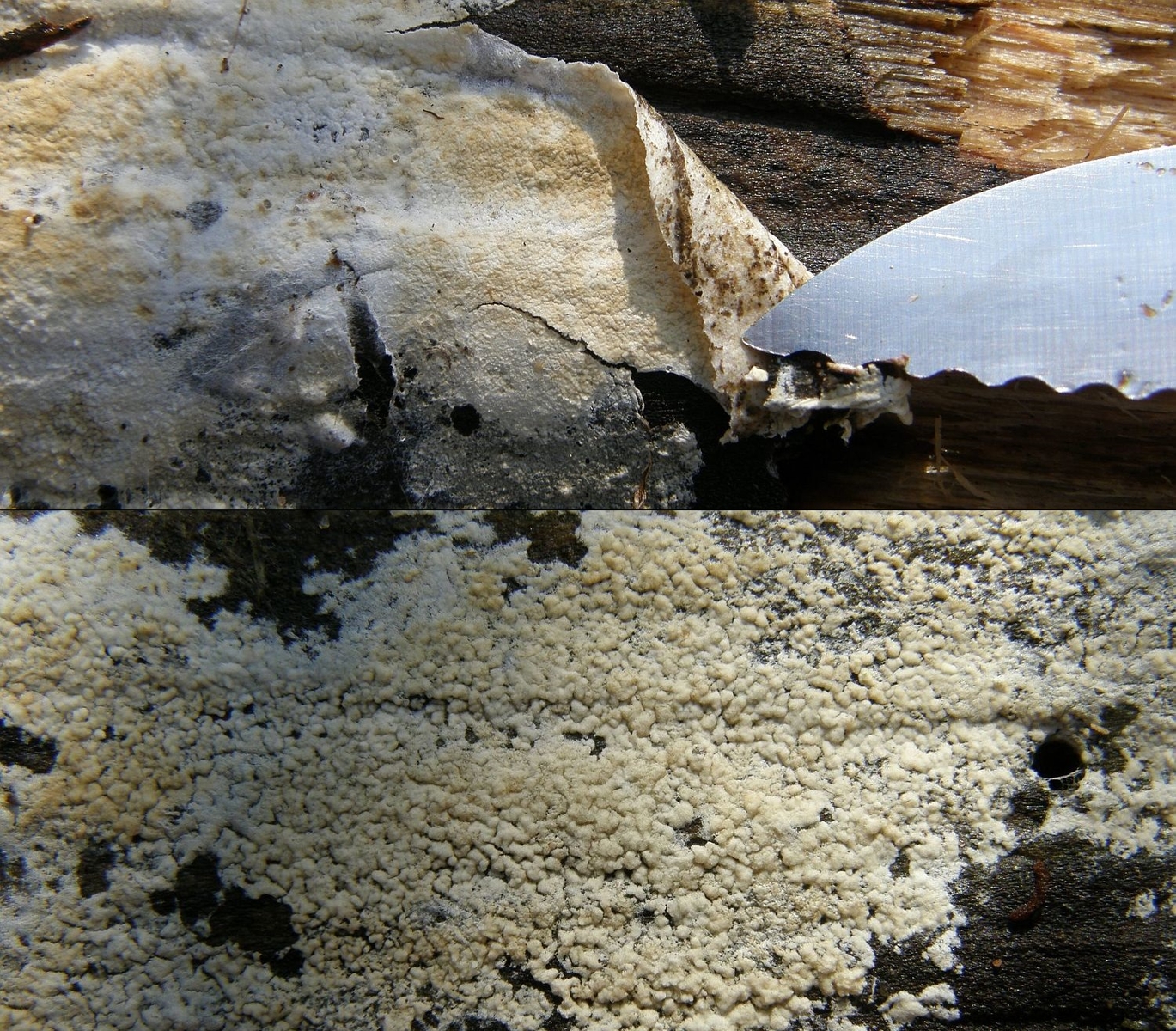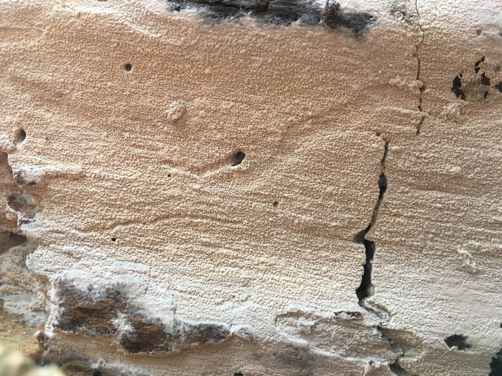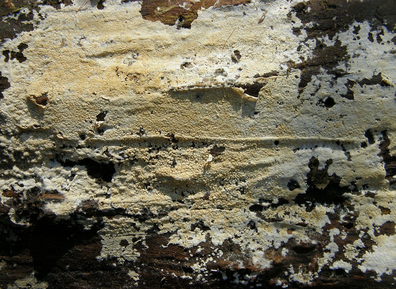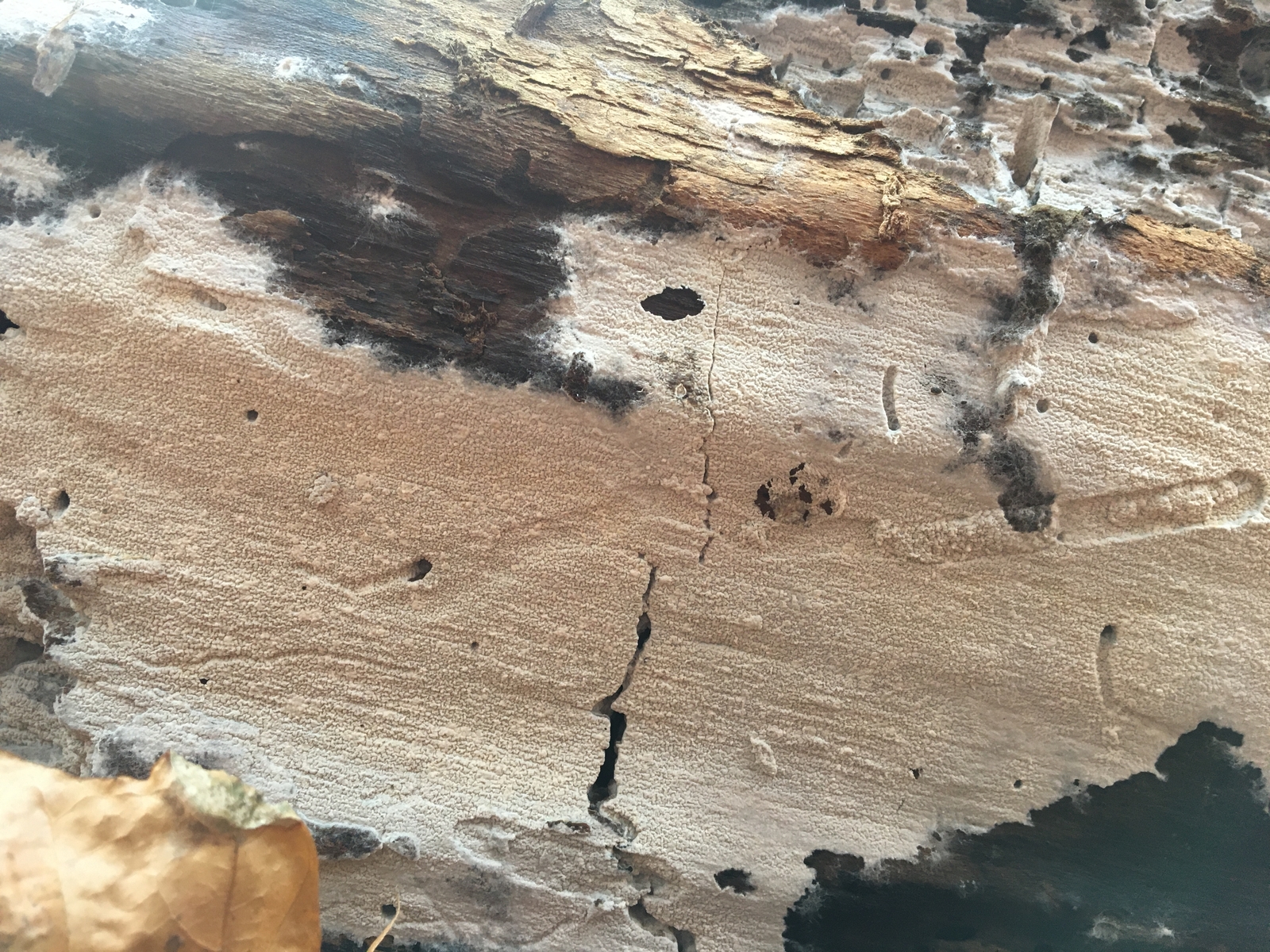 heute hab ich im Wiener Prater an Esche einen Rindenpilz gefunden, der ein hübsches meruloides Hymenium hat. Er ist weiß mit stellenweise ganz leicht ockerlichem Farbton.
