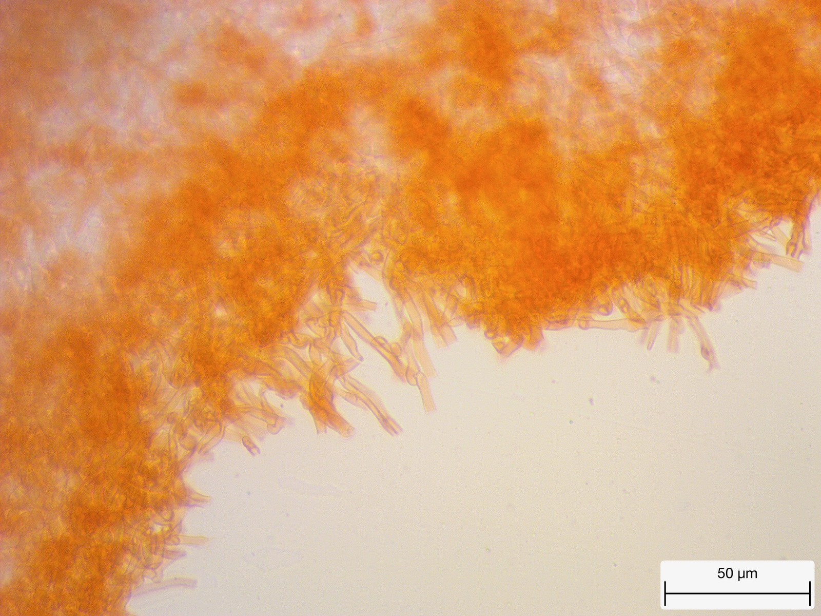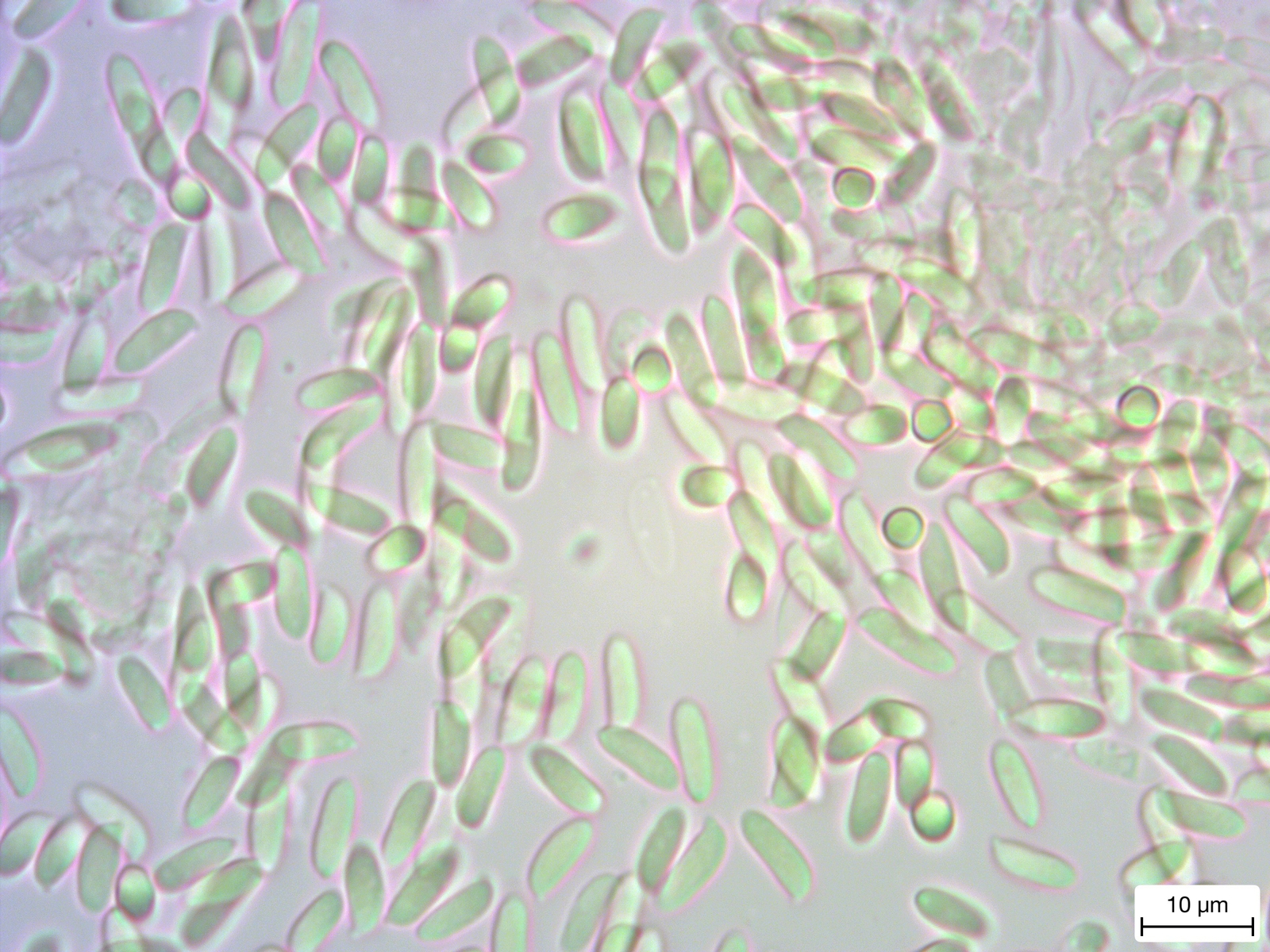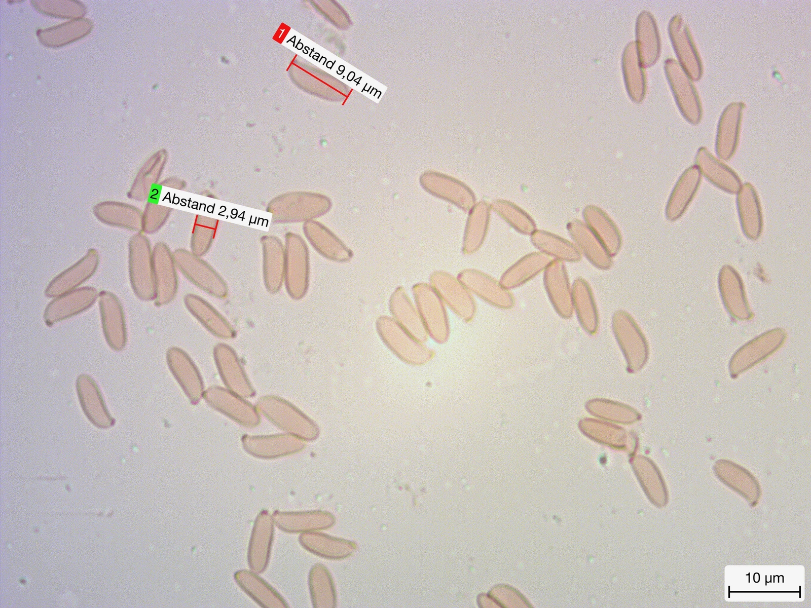 Die kleine Pilzgruppe wuchs auf einem völlig bemoosten Baumstumpf. Ob das ein Buchen- oder Fichtenholzstumpf war, kann ich nicht sagen. Die Pilze waren klein und festfleischig. Nach dem Transport waren die Hüte an der Oberfläche dunkel rotbräunlich verfärbt. Im WQuewrschnitt verfärbt das Pilzfleisch rosa. Der größte hatte einen Hutdurchmesser von 3 cm. Geschmack und Geruch waren nicht wahrnehmbar. Die Sporen sind ca. 3x9 µ und inamyloid. Hier sind die Bilder: