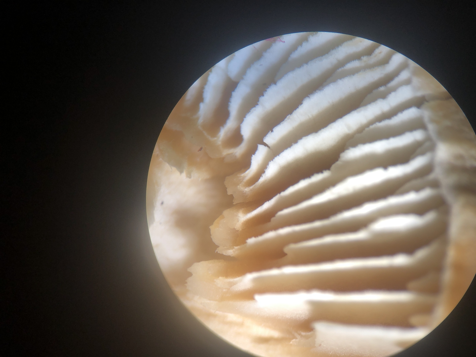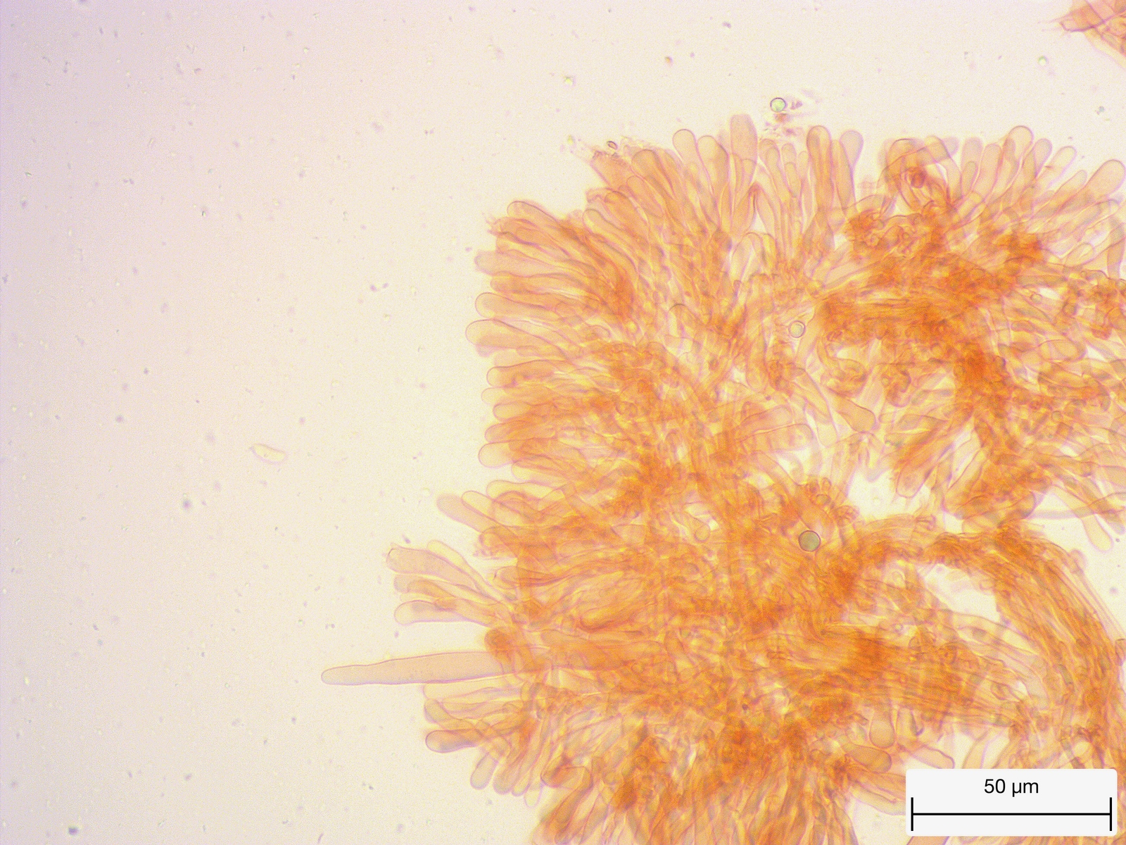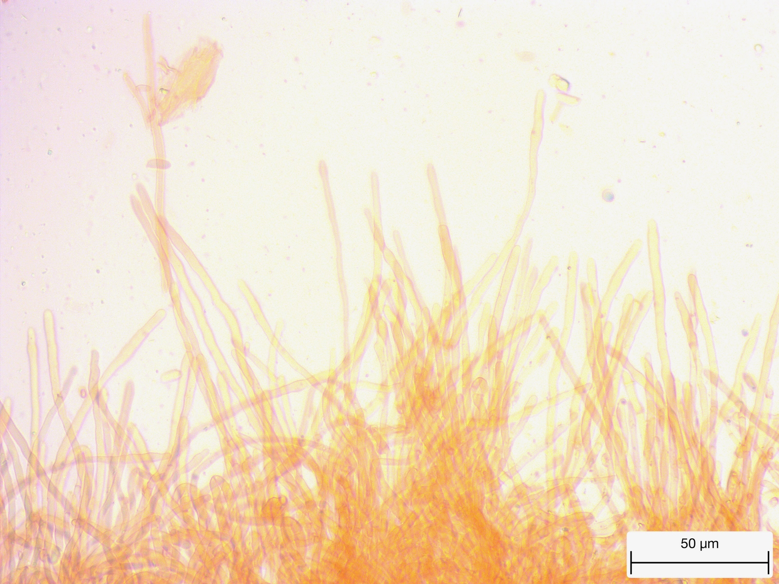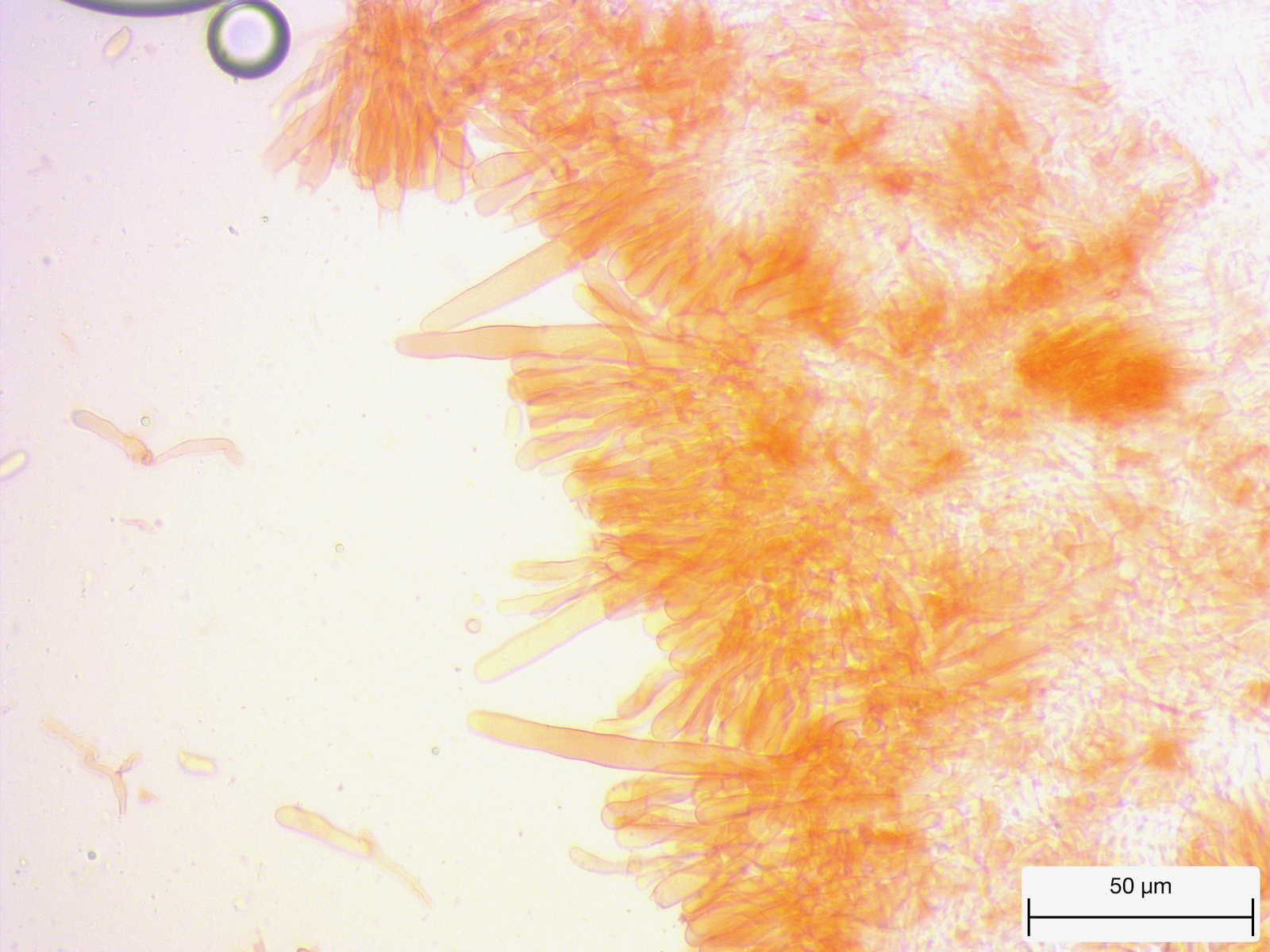 Die kleine Pilzgruppe wuchs auf einem völlig bemoosten Baumstumpf. Ob das ein Buchen- oder Fichtenholzstumpf war, kann ich nicht sagen. Die Pilze waren klein und festfleischig. Nach dem Transport waren die Hüte an der Oberfläche dunkel rotbräunlich verfärbt. Im WQuewrschnitt verfärbt das Pilzfleisch rosa. Der größte hatte einen Hutdurchmesser von 3 cm. Geschmack und Geruch waren nicht wahrnehmbar. Die Sporen sind ca. 3x9 µ und inamyloid. Hier sind die Bilder: