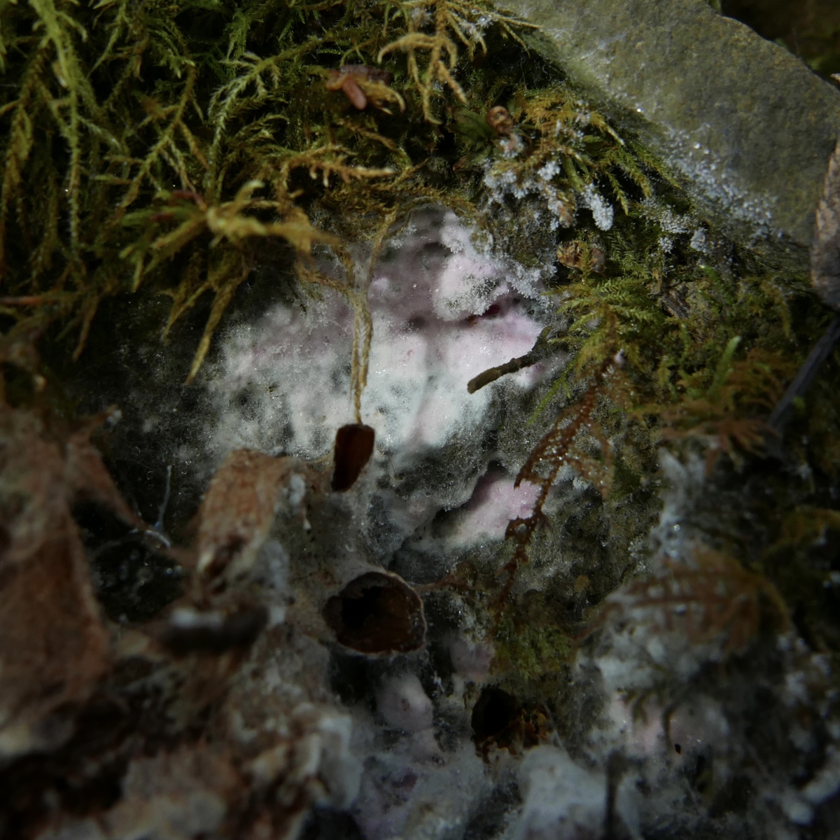 Völlig vergangene Hallimasch boten Nahrung für weiß-rosa Schimmel