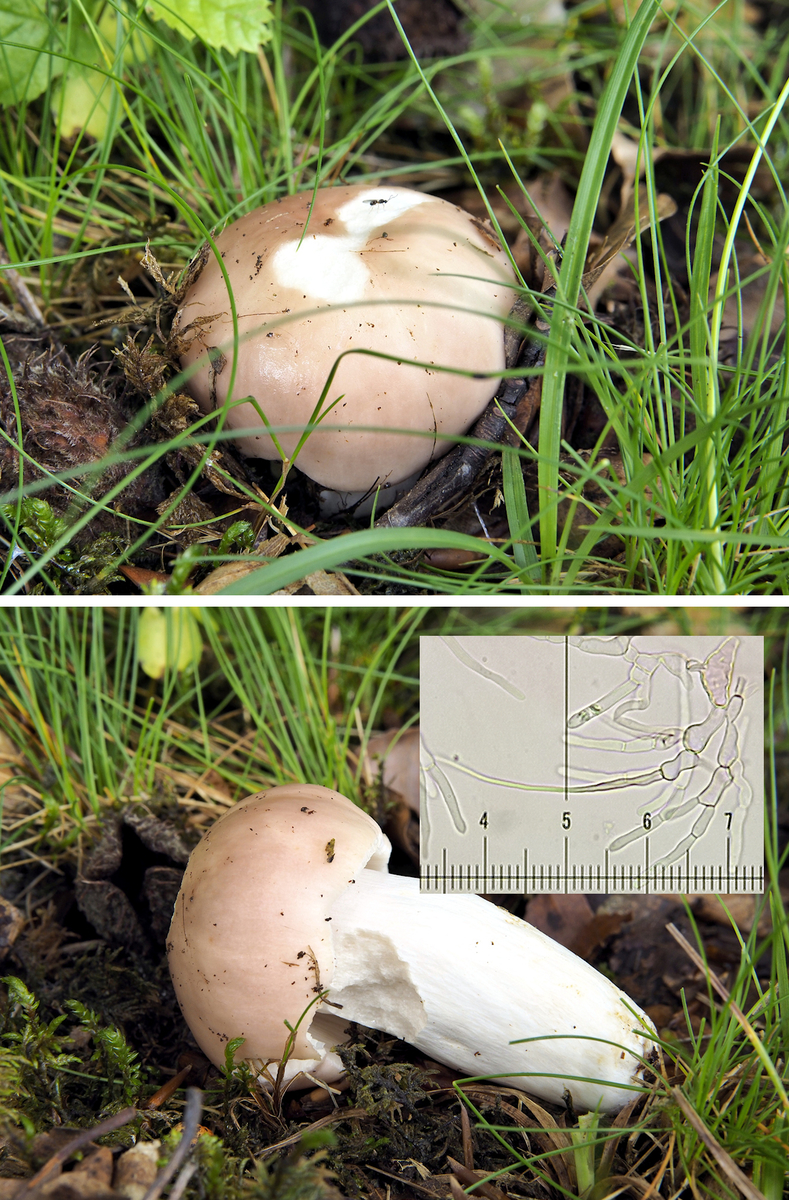 SpP Ia, mild, Buche/Eiche, Gras, Waldrand, Hut bleich, sehr schwach rosalich, körnig bereift und im Mikro als büschelig inkrustierte Primordialhyphen auffallend