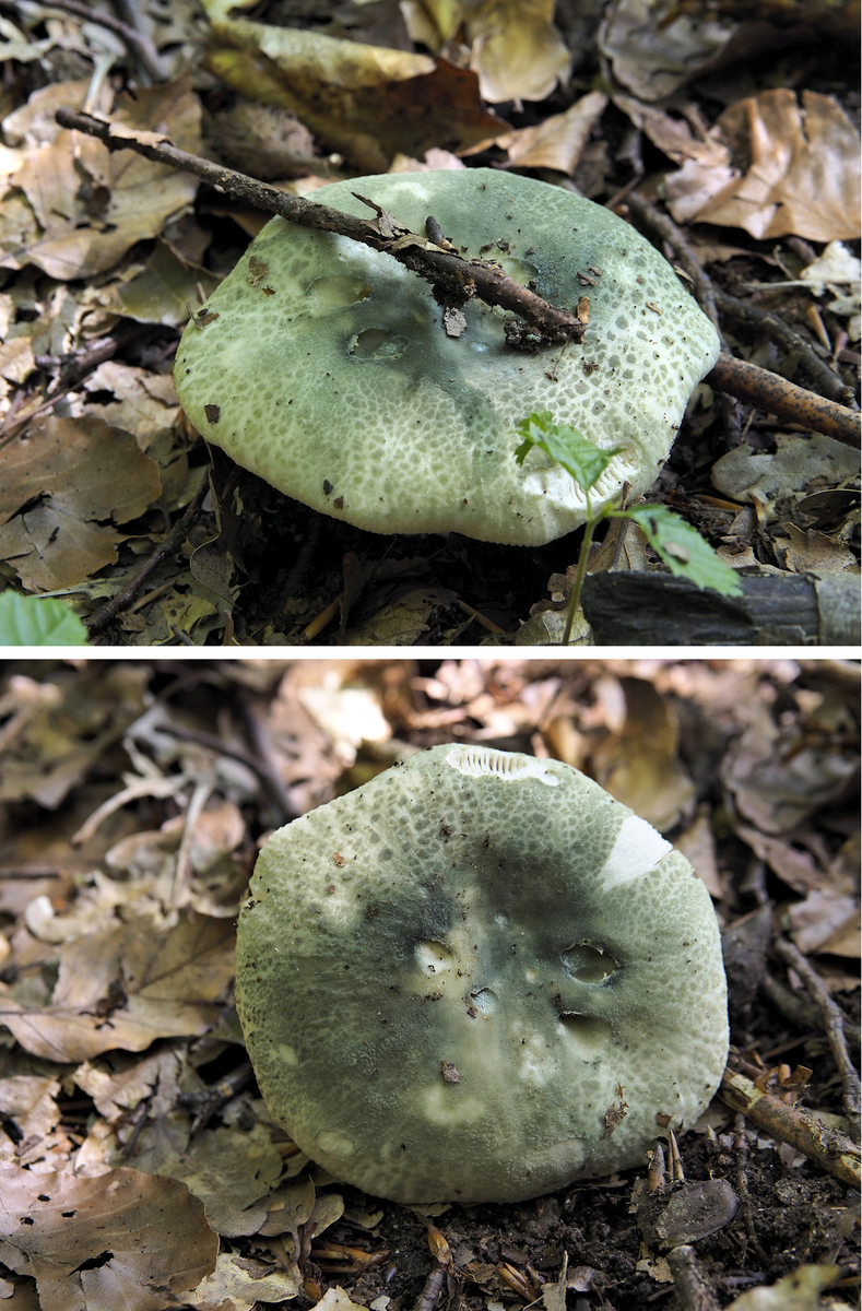 SpP IVa, mild, Geruch Hering/Fisch, Laubwald, Buche, Birke, stattlicher Pilz, fest matt rau/körnig, Stiel mit FeSo4 grünlich (Bild) und färbt bei Berührung gelblich-braun, Mikro: Dz vorhanden, Sporenornament fein teilnetzig wirkend, Spitzstachelig bis zu 1,3mü Höhe