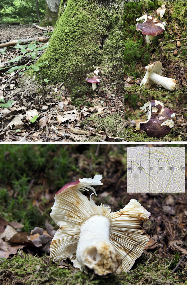 SpP IId-IIIa, mild, Geruch fischig, FeSo4 grün, Buche/Eiche, Gras, Waldrand, Huthaut körnig-matt, Stiel mit rötlichem Fleck, Stiel bräunend. Bis zur Geschmacksprobe optisch für eine R. fragilis gehalten, der Eisensulfat Test und der Fischgeruch bestätigte den Heringstäubling. Dz zylindrisch, sehr lang, gleichmässig um 5mü, Divertikel, weit septiert. Ob ich den hier als var purpurata aufführen kann entzieht sich meiner Recherche.