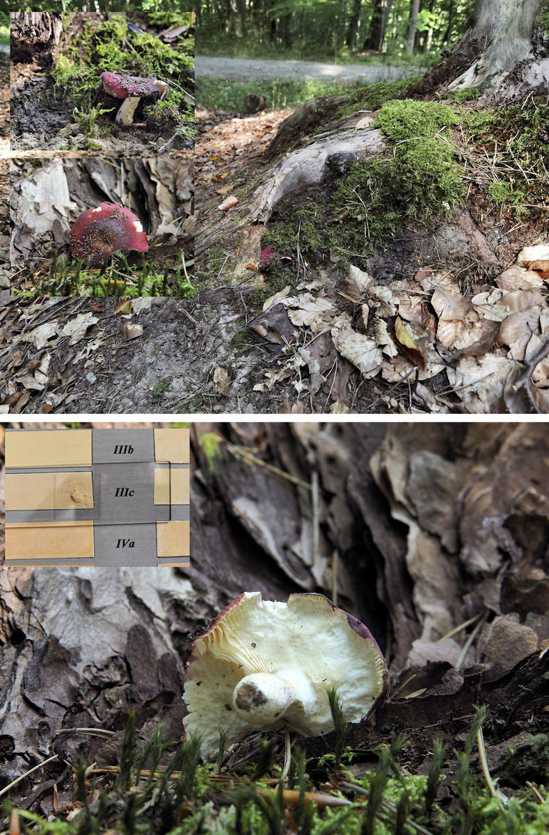 SpP Ia, sehr scharf/brennend, Geruch: Brot/Gebäck am Exsikkat nach Honig, Guajak St ++ / La ++, Mischwald Buche, Kiefer, Lärche und vereinzelt Eiche. Im Moos an einer verrottenden Stubbe (Lärche?) neben einer Lärche. Hut irgendwie purpurrot, rau körnig, seidig matt, Rand fast ungerieft runzlig, Mitte schwärzlich purpur/rot, unter Hh rötlich, Frasstellen rötlich, Peeling ½+, Stiel fest, stark gerunzelt, Lamellenschneide nicht gesägt, nicht gefärbt, an natürlichen Druckstellen stark bräunlich wie zergehend.