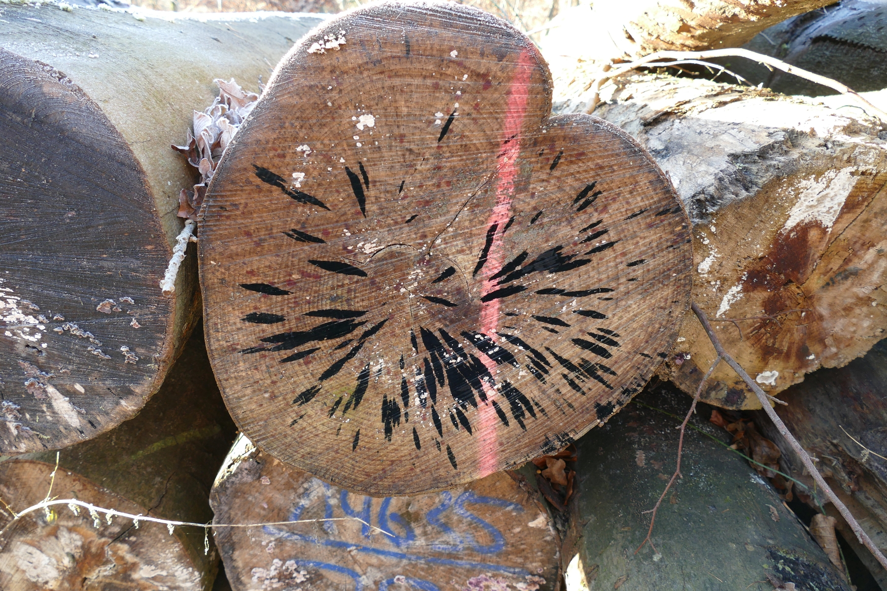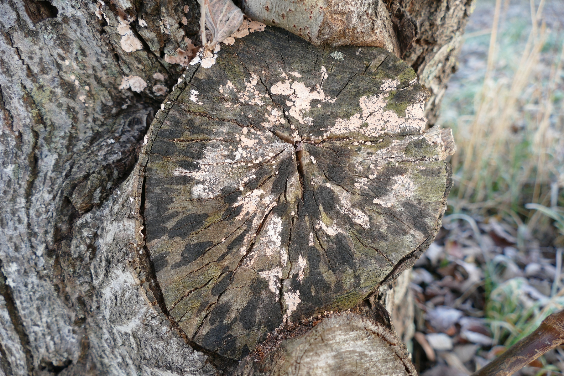Bild 2: Hier an einem Haselbusch. Die nasse Schnittfläche zeigt grün-schwärzliche Strukturen in radialer Ausrichtung.