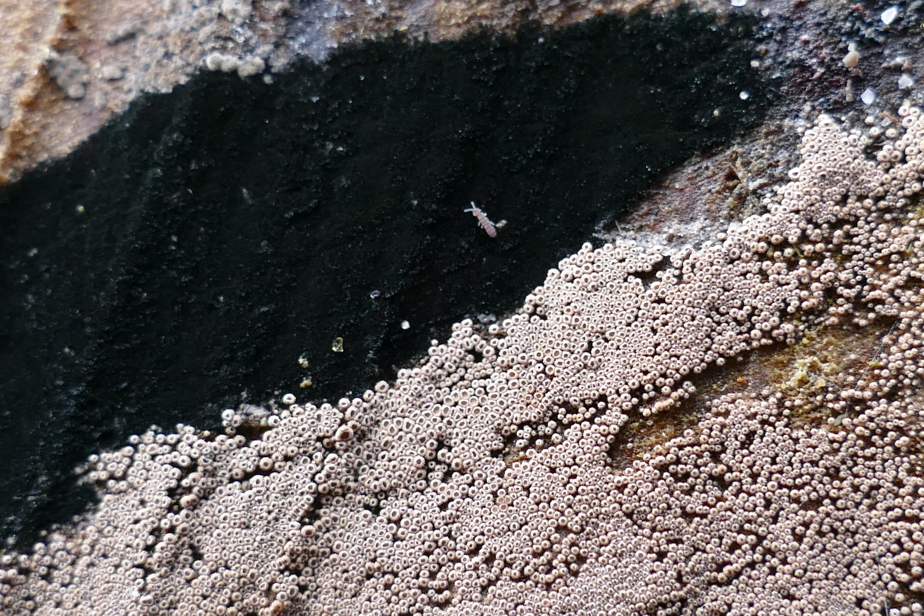 Bild 1b: Vergrößerter Ausschnitt mit schönem Kontrast zwischen Resupinatus poriaeformis und dem schwarzen Zeugs. Dem Schpringschwanz gefällt der schwarze Teppich.