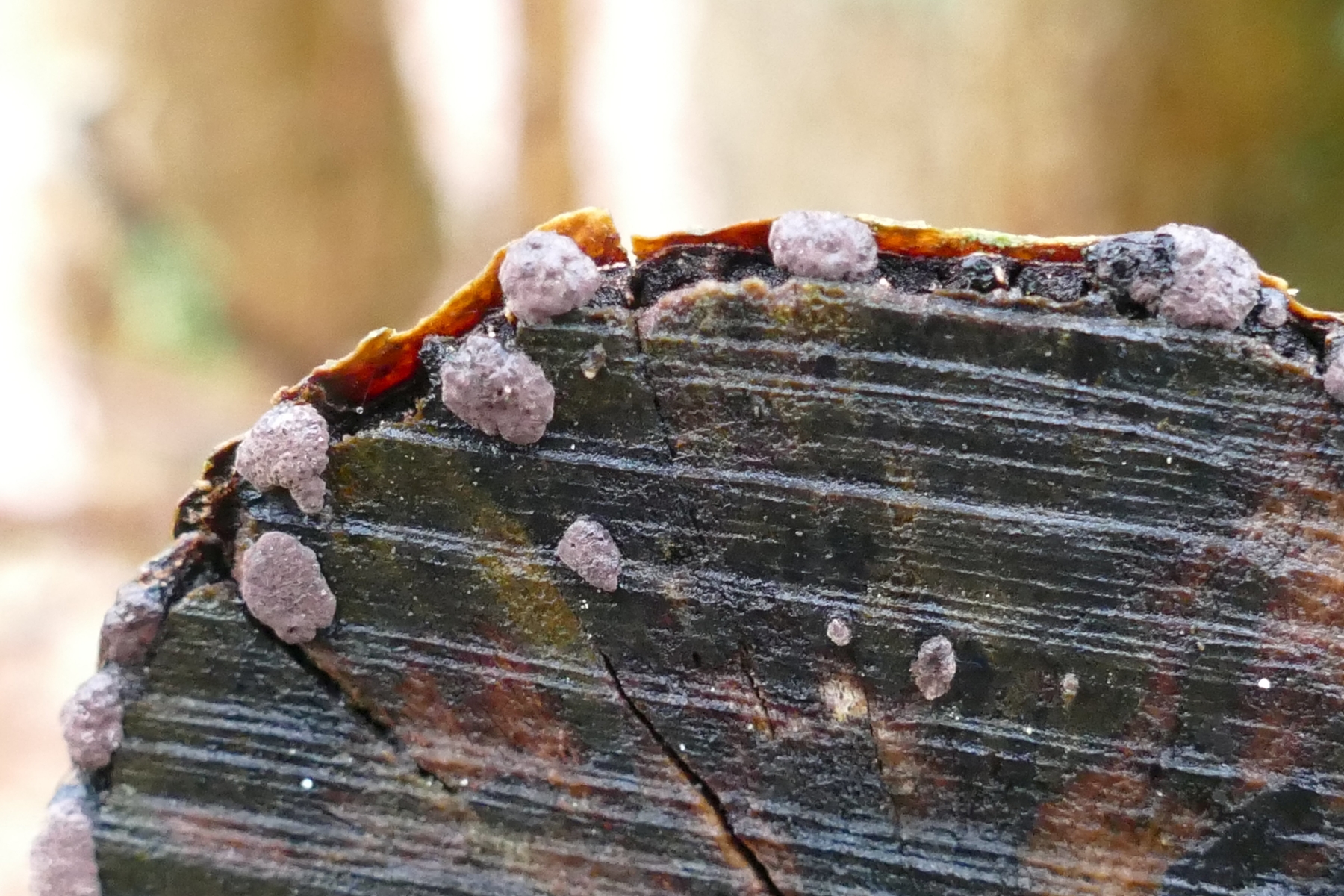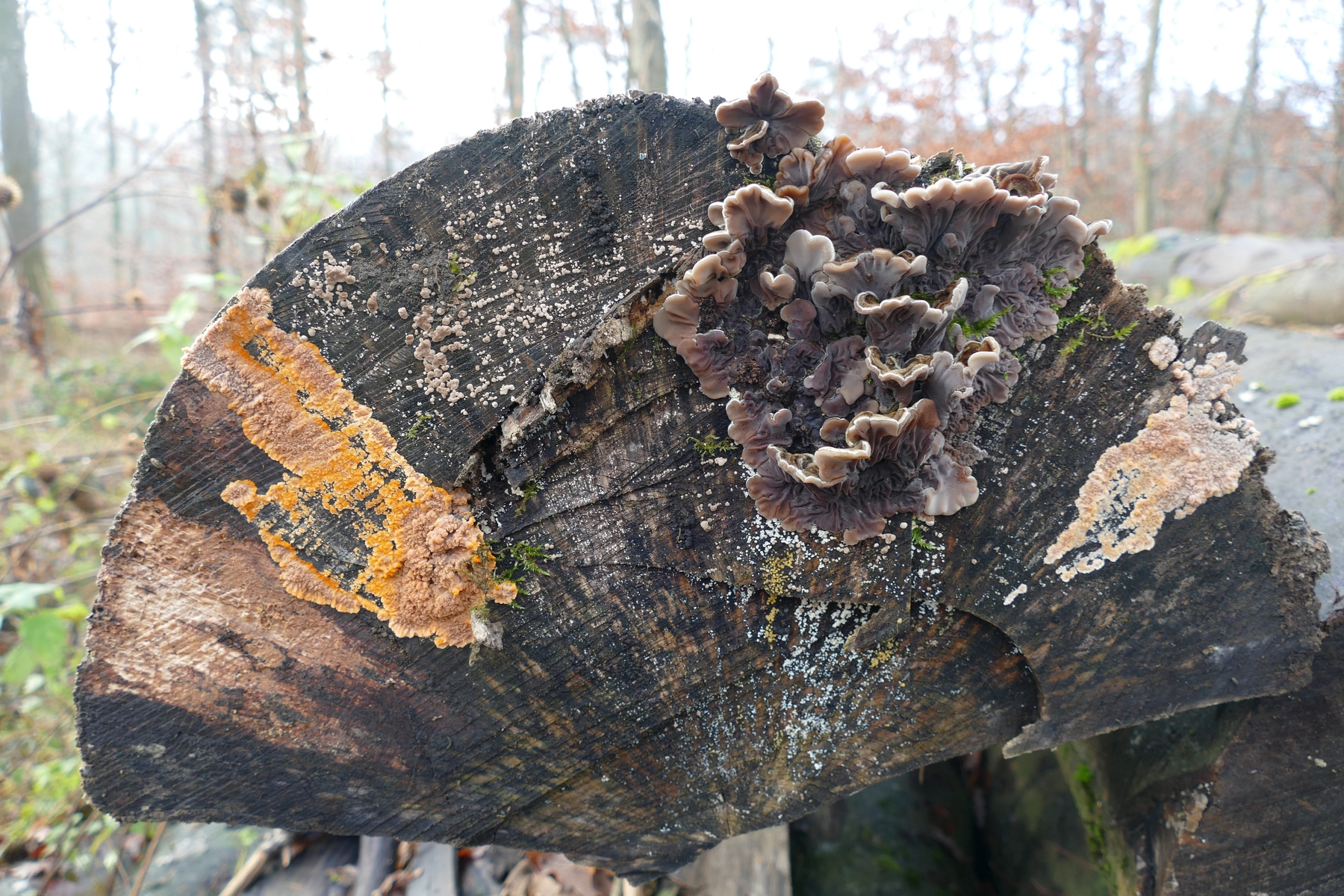 Bild 4: Auch hier neben diversen blickfangenden Pilzen (Phlebia radiata, Auricularia mesenterica, Cylindrobasidium evolvens etc.) unauffällig im Hintergrund die schwarzen, radialen Strukturen.