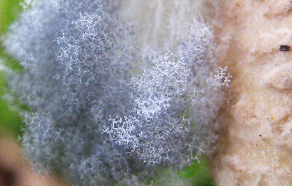 Grau, wollig, wächst schleierartig von einem Pilz.