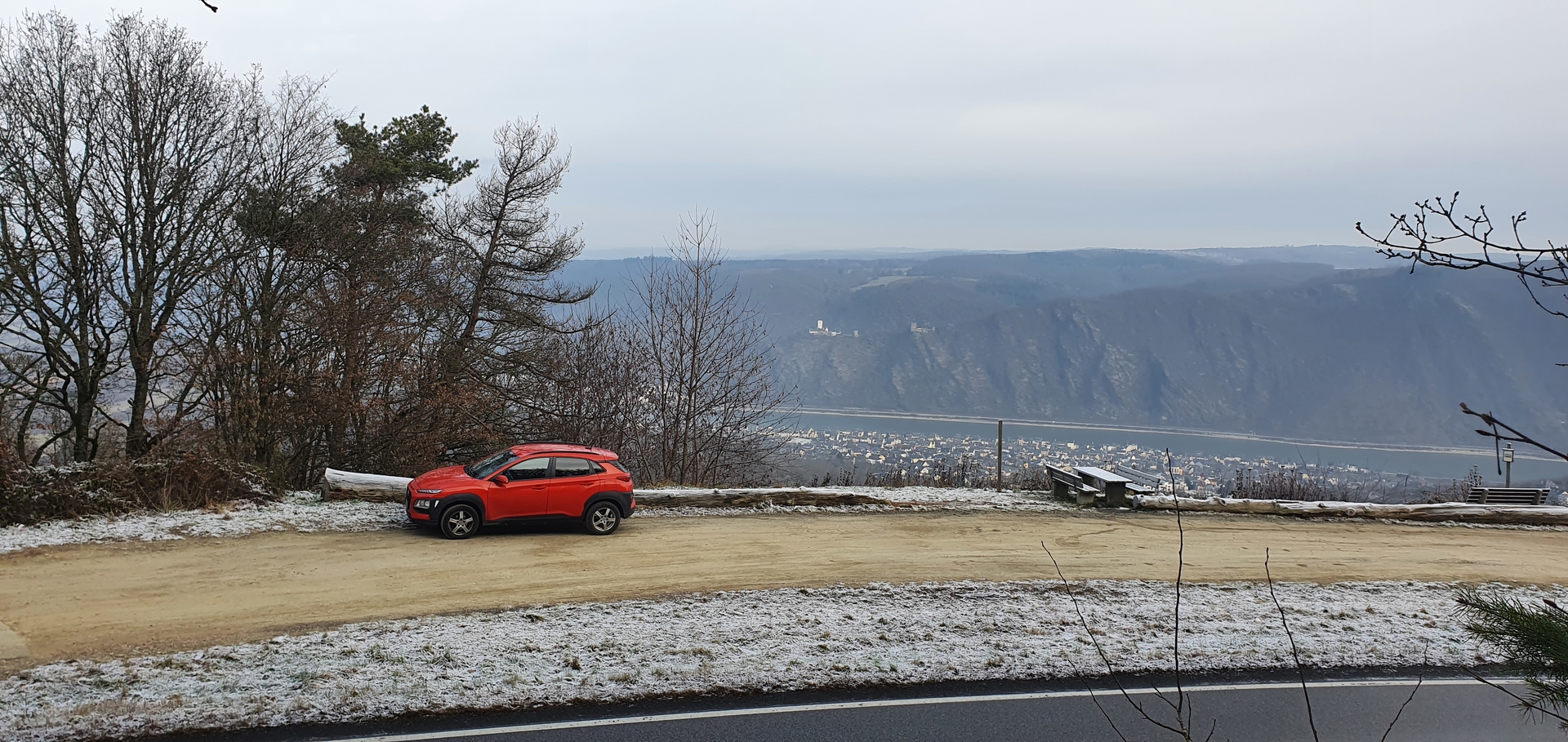 Von der A61 kommend folgte ich dem Zubringer zur Rheingoldstraße Richtung Rheintal. Bevor es aber ins Tal hineinging, wurde ich auf einen Wanderparkplatz mit Aussicht auf Bad Salzig aufmerksam. Zudem stand dort keine 200m entfernt ein großer Aussichtsturm (21m hoch). Der Aussichtsturm "5-Seenblick", wie sich herausstellen sollte. Kurzerhand hatte ich nämlich angehalten, um die Aussicht zu genießen: