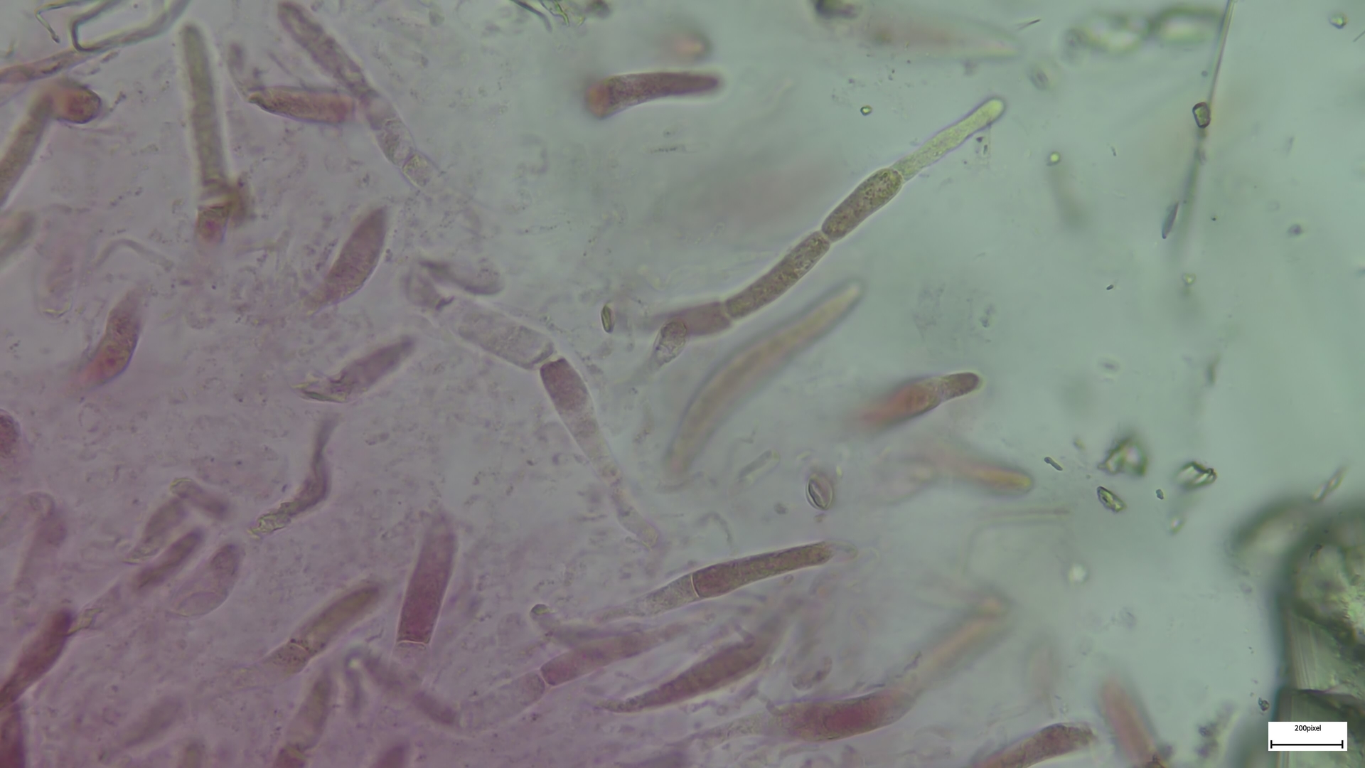 Auch hier gabs dann noch einiges zu entdecken, zuerst unter Fichten 16 Inocybe pudica - der weisrote Risspilz: gut zu erkennen an den roten Flecken, gerne bei Nadelbäumen. Der Fruchtkörper hat dann nochmal arg nachgerötet beim Trocknen, was auch nicht untypisch ist. Zudem passen auch die Zystiden und die schlanken Sporen bis 11µm: