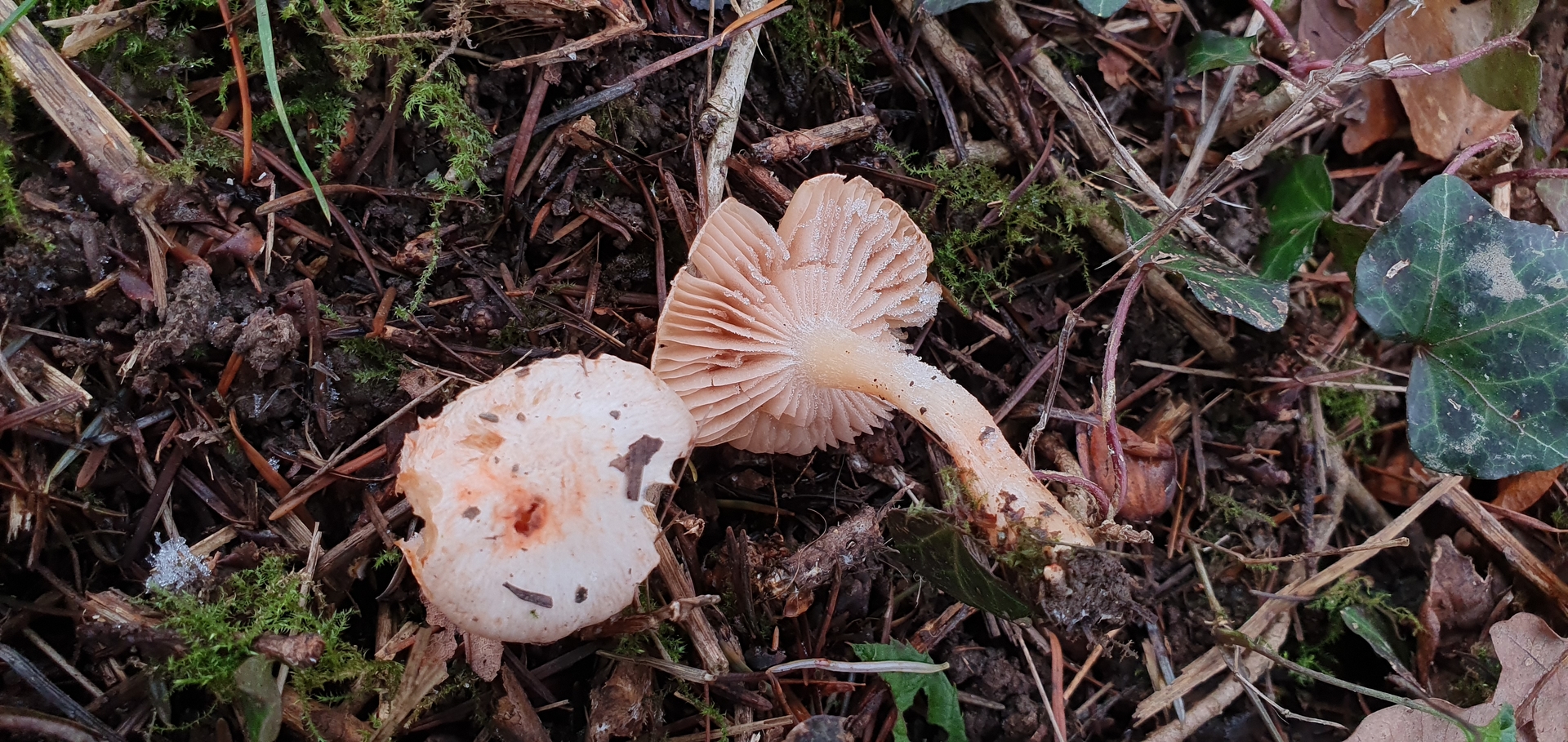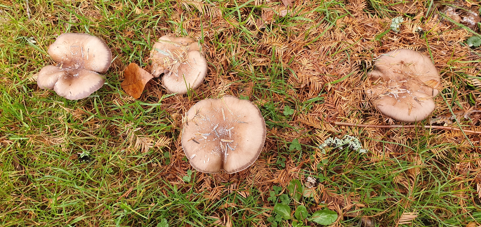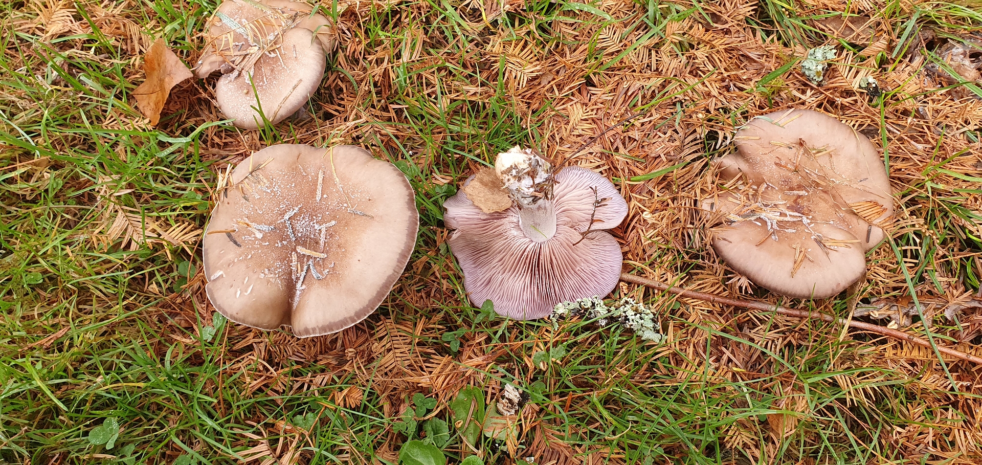 Etwas entfernt an anderer Stelle dann diese Exemplare mit einem auffällig kräftig lilalichem Stiel. Hier habe ich mich gefragt, ob es ggf. 20a Lepista personata sein könnte? Naja, da traue ich mir kein Urteil zu, zumal alle Fruchtkörper nicht frisch 20a Lepista nuda (siehe Diskussion und Hinweise unterhalb)