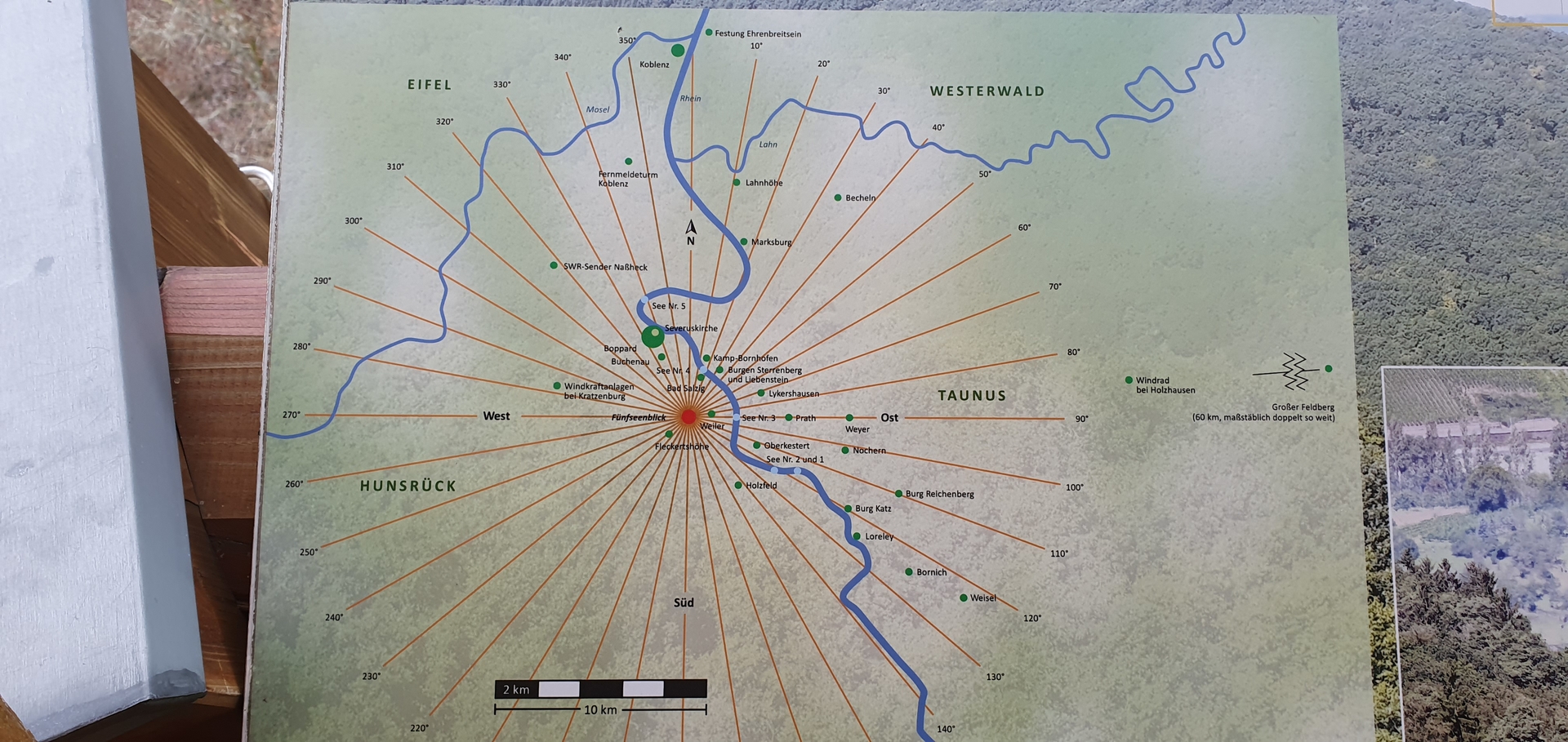 Von der A61 kommend folgte ich dem Zubringer zur Rheingoldstraße Richtung Rheintal. Bevor es aber ins Tal hineinging, wurde ich auf einen Wanderparkplatz mit Aussicht auf Bad Salzig aufmerksam. Zudem stand dort keine 200m entfernt ein großer Aussichtsturm (21m hoch). Der Aussichtsturm "5-Seenblick", wie sich herausstellen sollte. Kurzerhand hatte ich nämlich angehalten, um die Aussicht zu genießen: