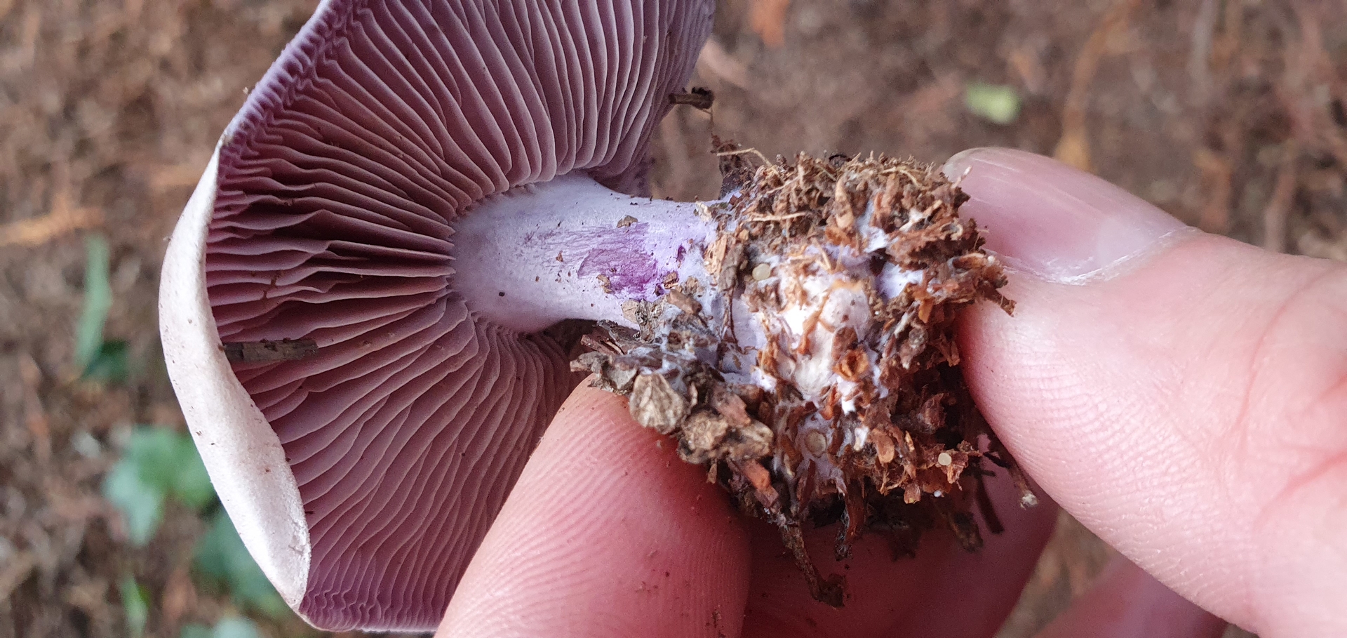 Etwas entfernt an anderer Stelle dann diese Exemplare mit einem auffällig kräftig lilalichem Stiel. Hier habe ich mich gefragt, ob es ggf. 20a Lepista personata sein könnte? Naja, da traue ich mir kein Urteil zu, zumal alle Fruchtkörper nicht frisch 20a Lepista nuda (siehe Diskussion und Hinweise unterhalb)