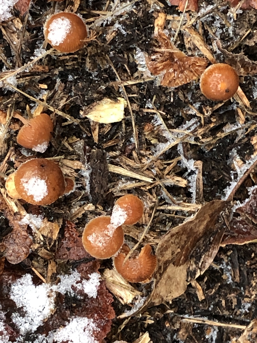 1. Dieser kleine Pilz ist auf meinen mit Holzhäckseln bedeckten Beetwegen beim ersten Frost erschienen…und das gleich in rauhen Mengen ( Bild 1 und 2)