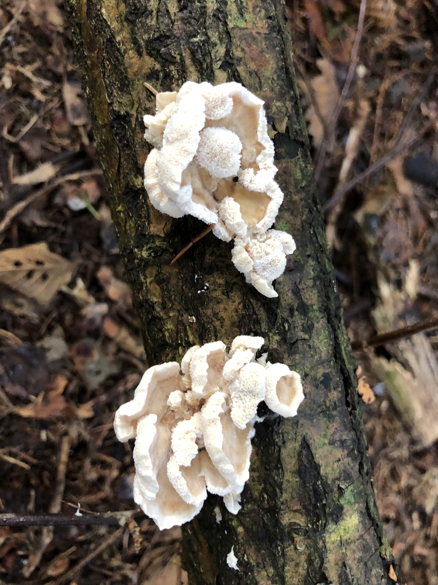3. Und noch ein Pilz in unserem kleinen Wäldchen (Tannen und Fichten, Birken und Holunder) auf unserem Grundstück, an einem Windwurf-Ast