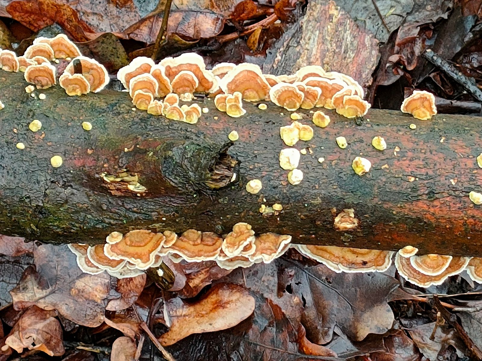 Ich bin ziemlich sicher, daß -2- Schmetterlingstrameten sind... Und beide Bilder die Unterseite zeigen. In der Vergrößerung sind die Poren zu sehen. :gzwinkern: