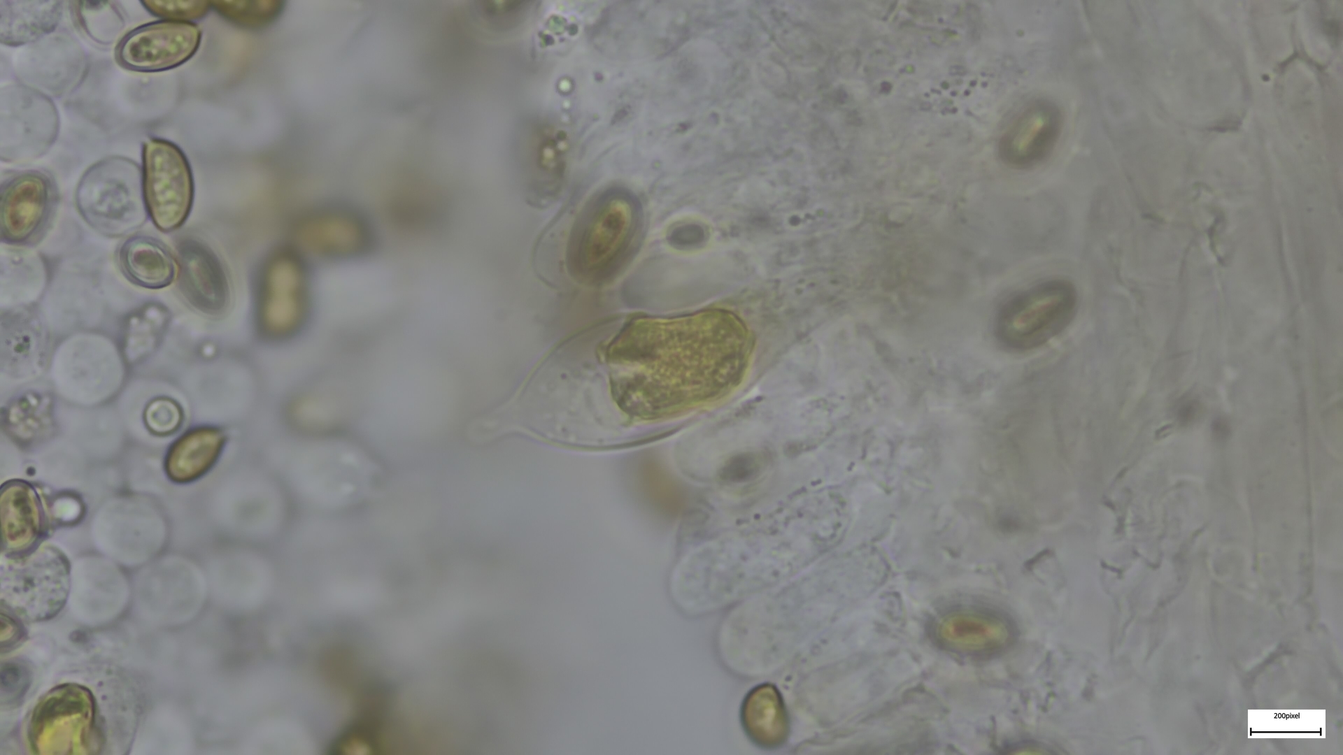 Weil die Sporen passen dazu ja auch, ebenso die Chrysozystiden, und makroskopisch deucht mir das eher in die Richtung, als wie Pholiota gummosa...