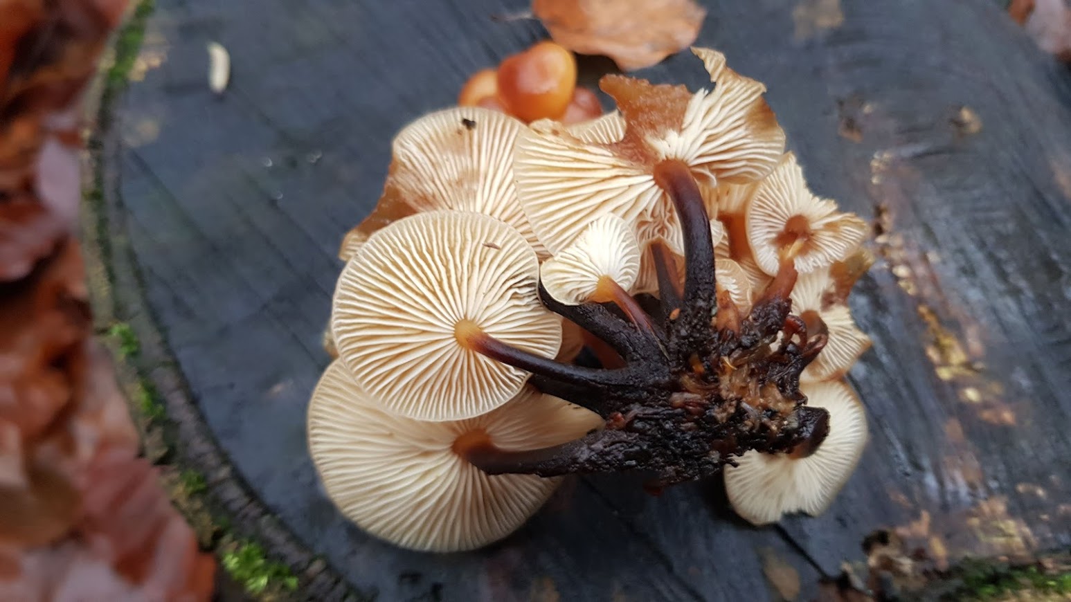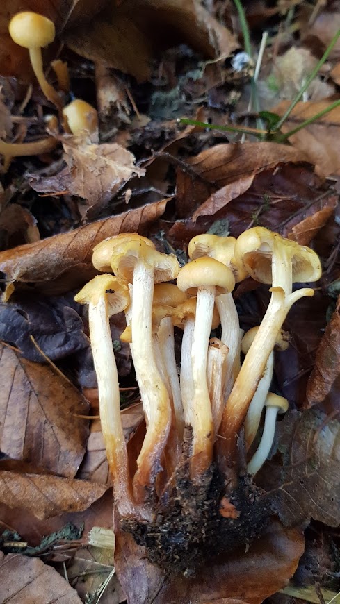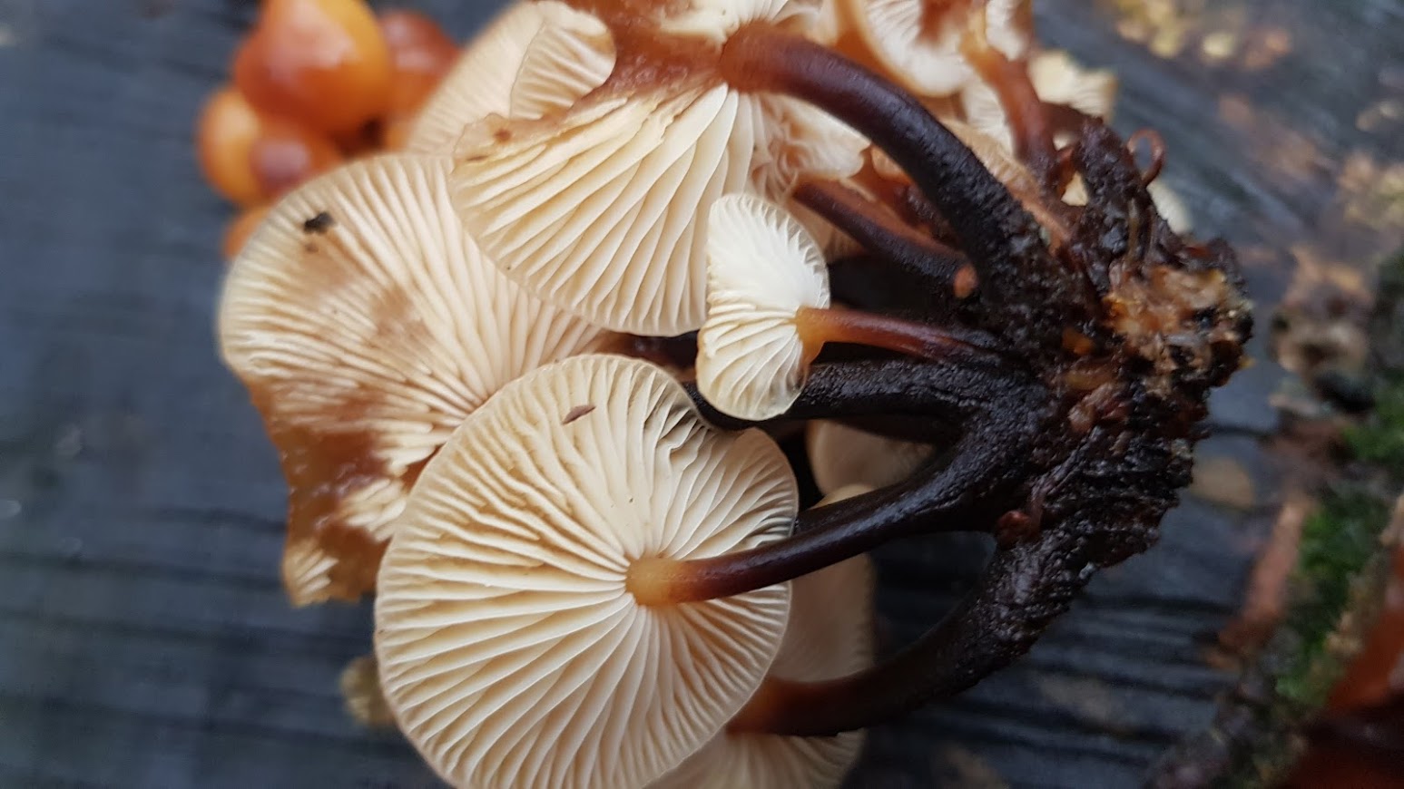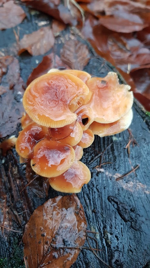 1. Hier vermute ich, dass es sich um Samtfußrüblinge handeln müsste, auch wenn der Stiel eher nicht so samtig war. Gefunden habe ich sie an Laubholz, vermutlich Buche.