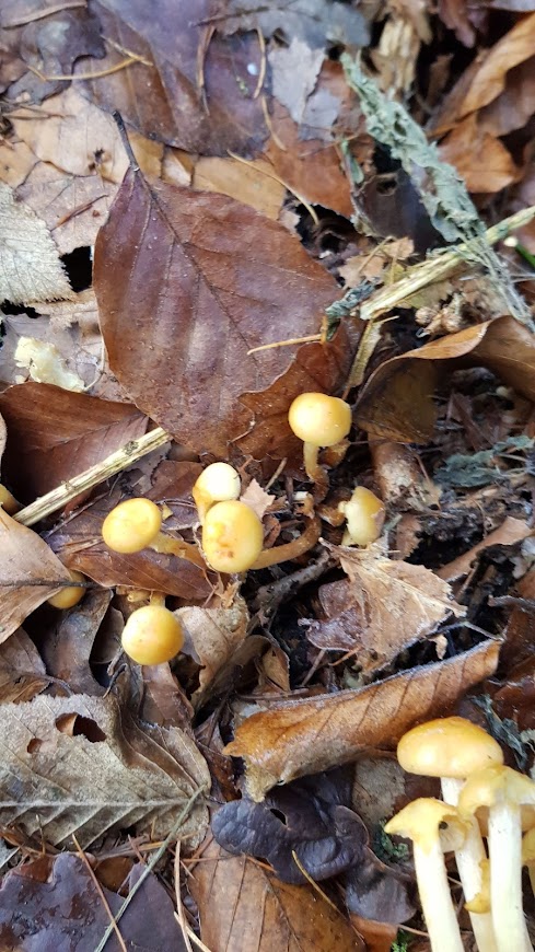 2. Den zweiten Pilz habe ich am ersten Weihnachtstag am Rand eines Fichtenwaldes an einem Fichtenstubben gefunden. Die Buchenblätter auf dem Bild täuschen. Die waren von der anderen Seite des Weges herübergeweht. Die Fruchtkörper waren relativ klein (Hutdurchmesser ca. 1 - 2 cm). Mir fiele da eigentlich nur der Graublättrige Schwefelkopf ein; keine Ahnung, ob ich da richtig liege.