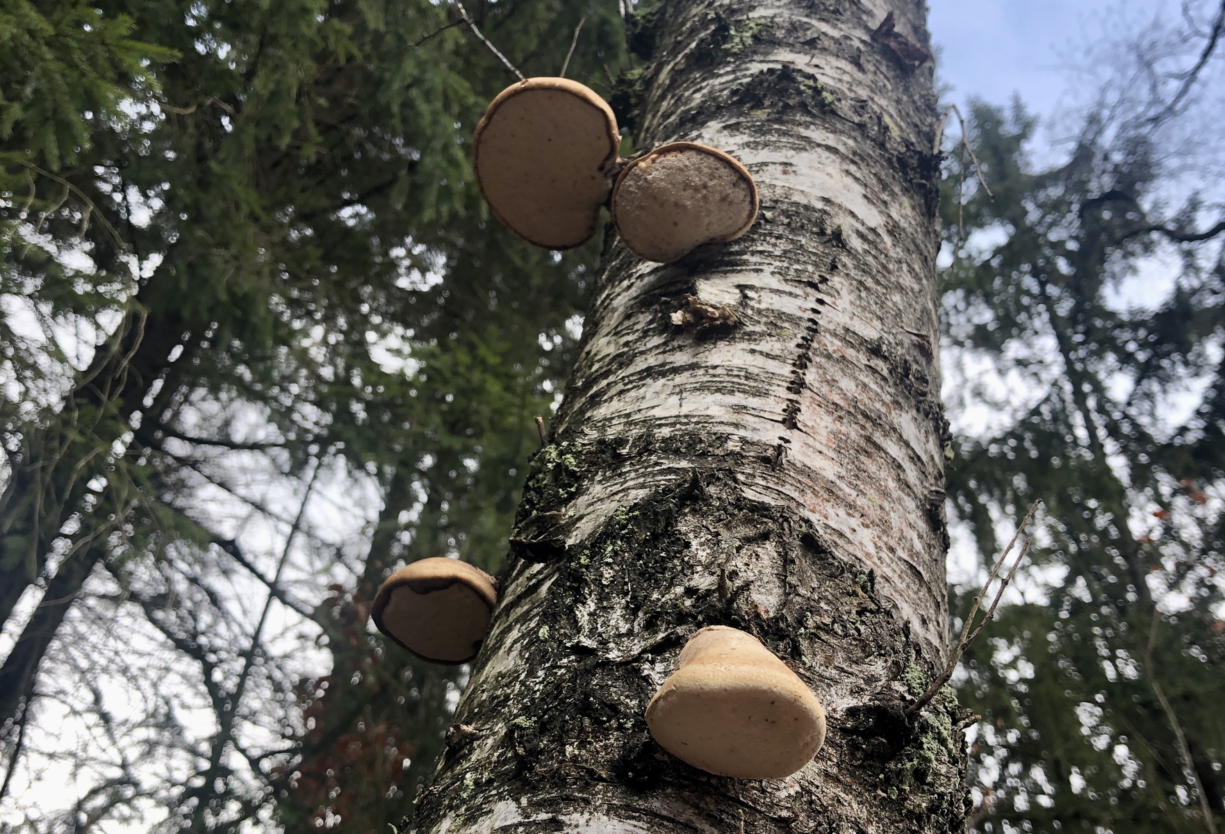 eigentlich sind das ja keine spektakulären Sachen, die das Vorzeigen lohnen, aber der Birkenstamm heute war doch nicht alltäglich, denn er hatte sich gedreht, während so Einiges an ihm wuchs.