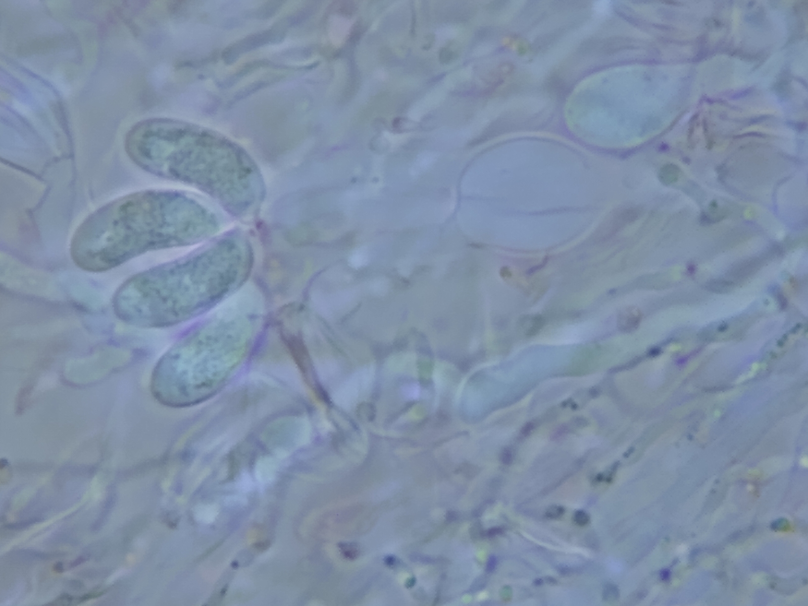 Tremella globispora ist das sicherlich nicht. Die hat nämlich rundliche Sporen. Mit den länglichen Sporen landet man am ehesten in den Gattungen Exidia oder Myxarium. In dem Kontext ist dann wichtig, ob die Basidien gestielt sind oder nicht.