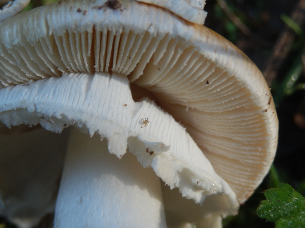 Lamellen: weiß, freistehend, engstehend, Schneide beflockt,