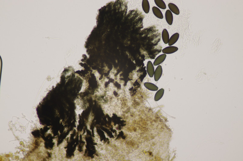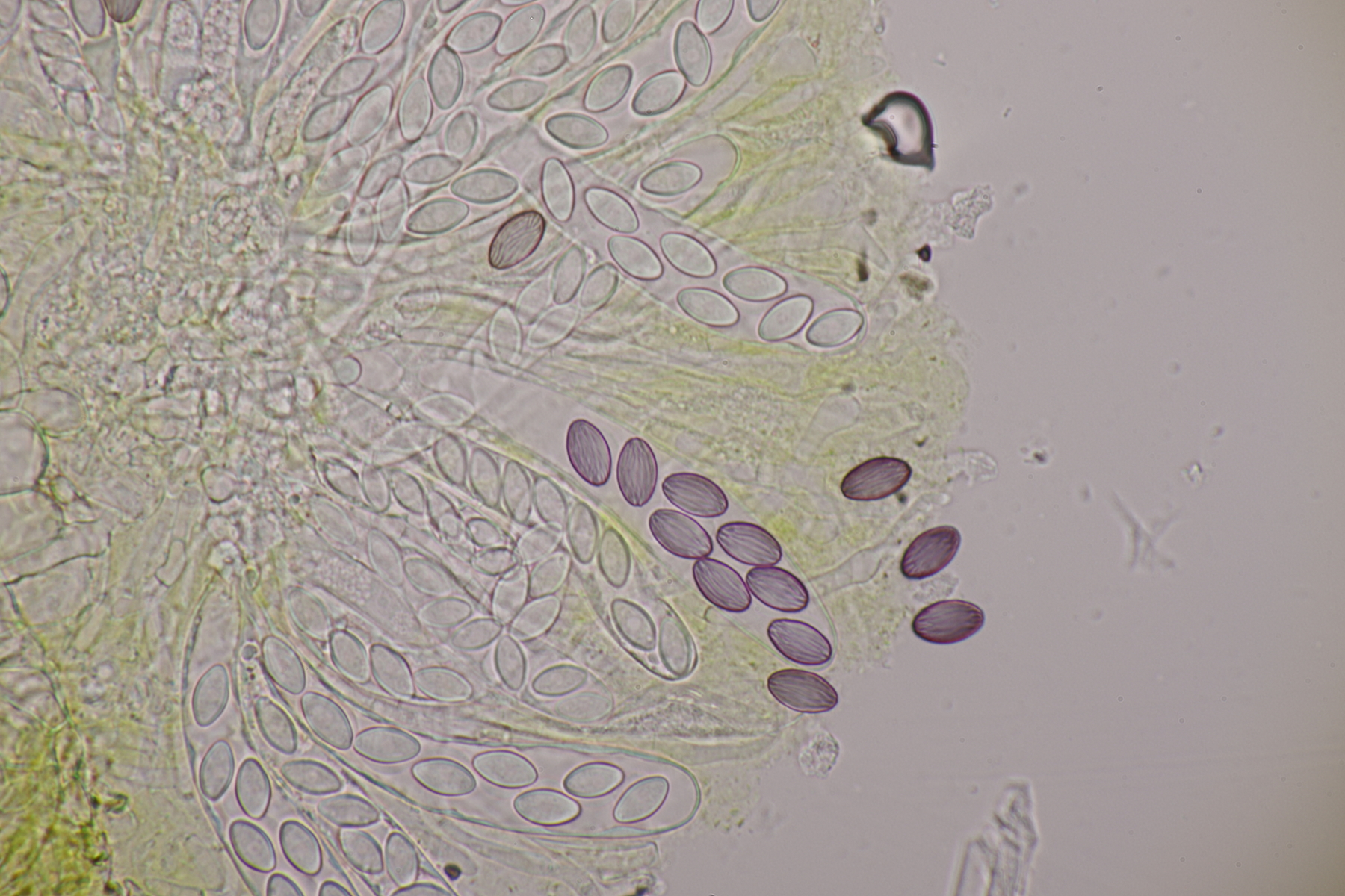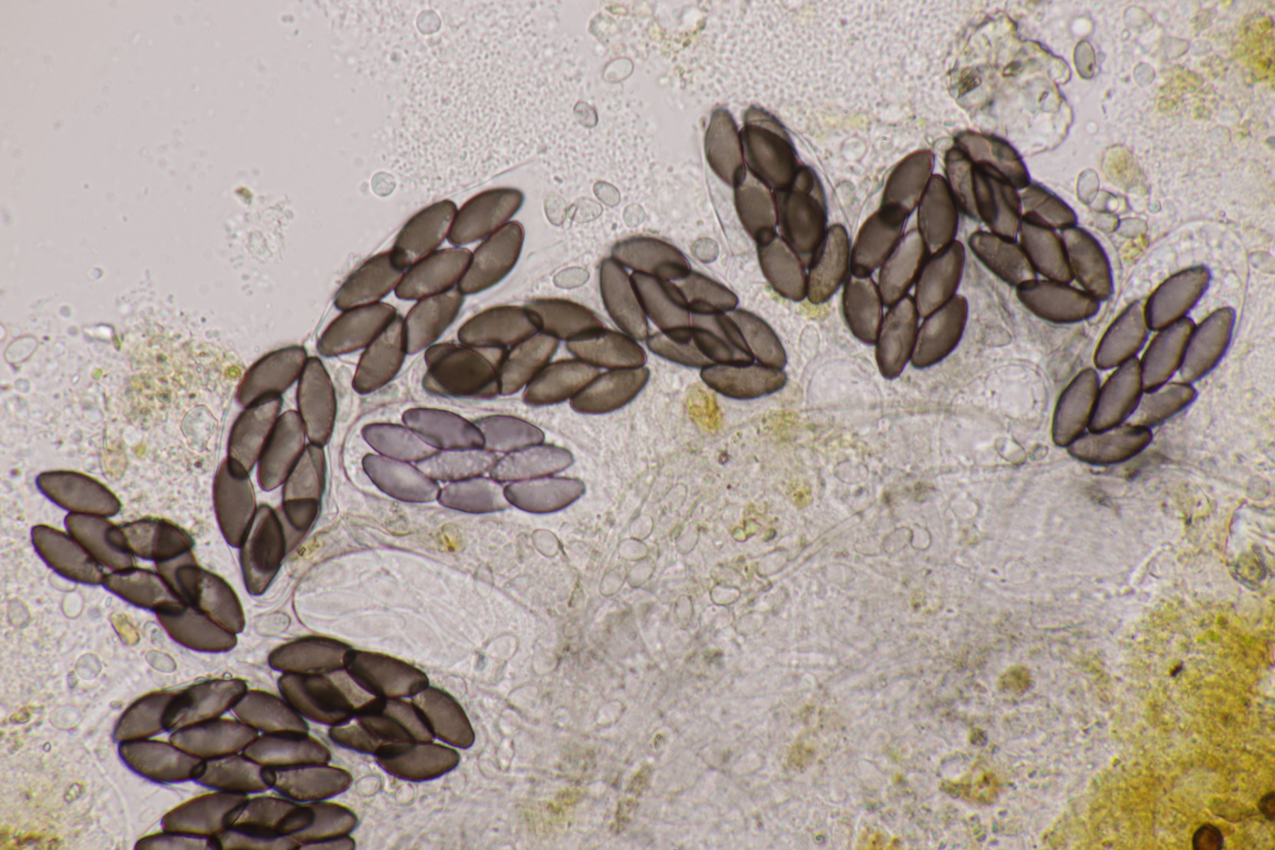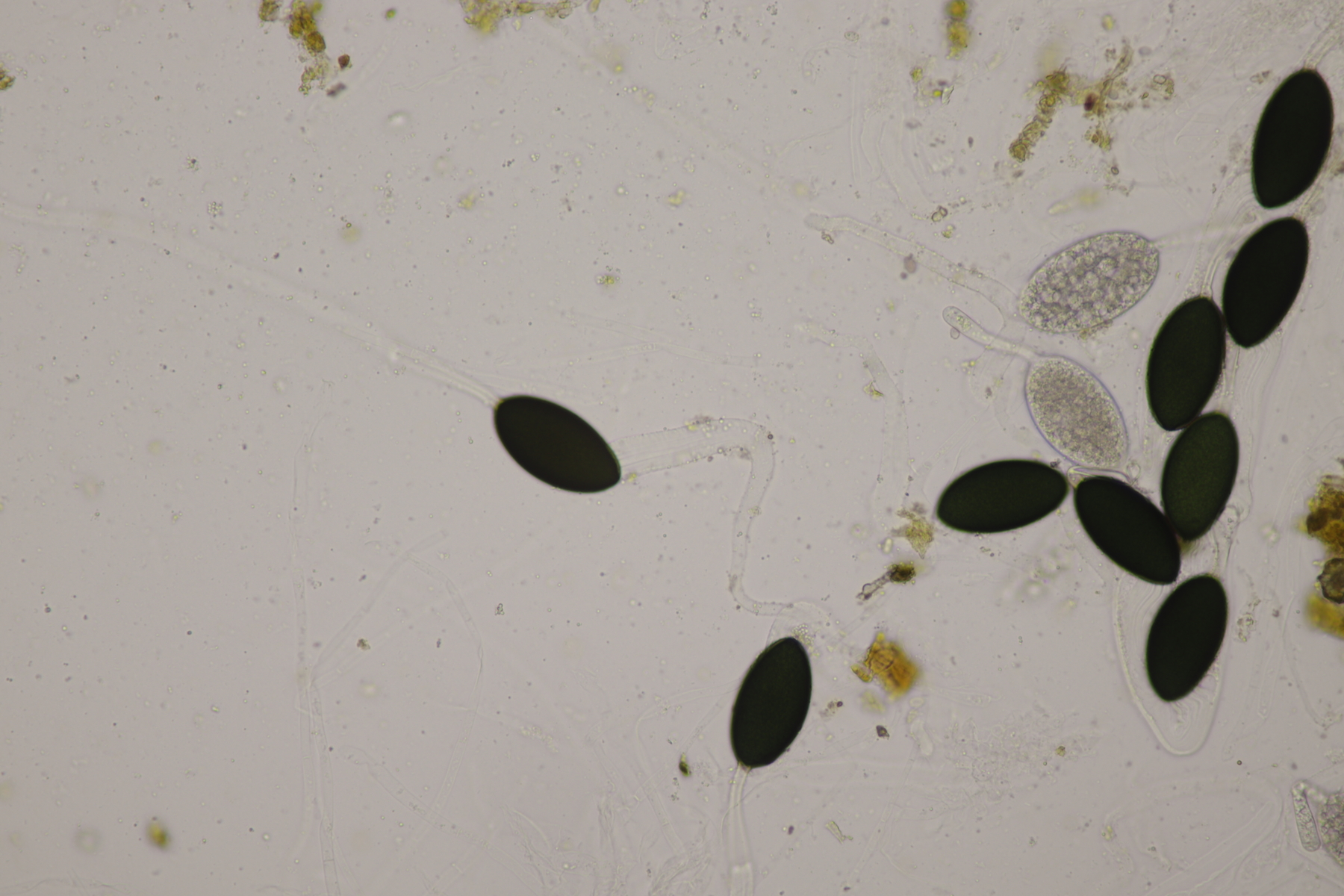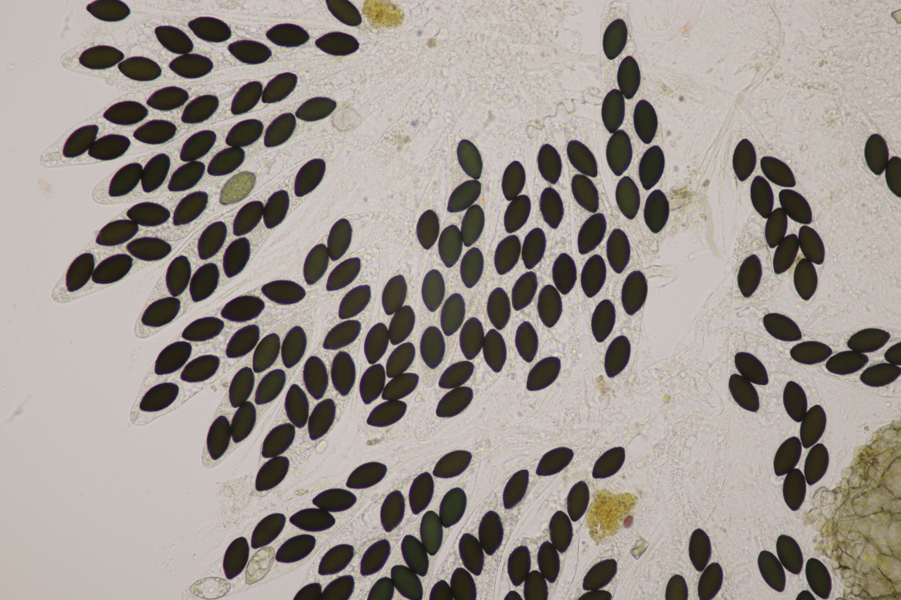 3. Ein Saccobolus mit Sporen von 14.5-16 µm x 7-8 µm. Die Sporencluster sind nur durch Druck aufgebrochen und wo eine Musterung des Epispors erkennbar ist, waren die Sporen wohl ursprünglich mal zusammengepappt. Deshalb Tendenz zu Saccobolus versicolor.