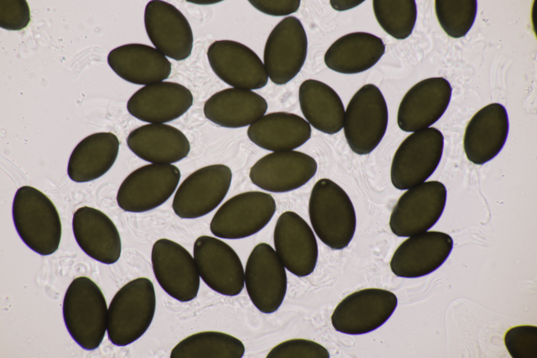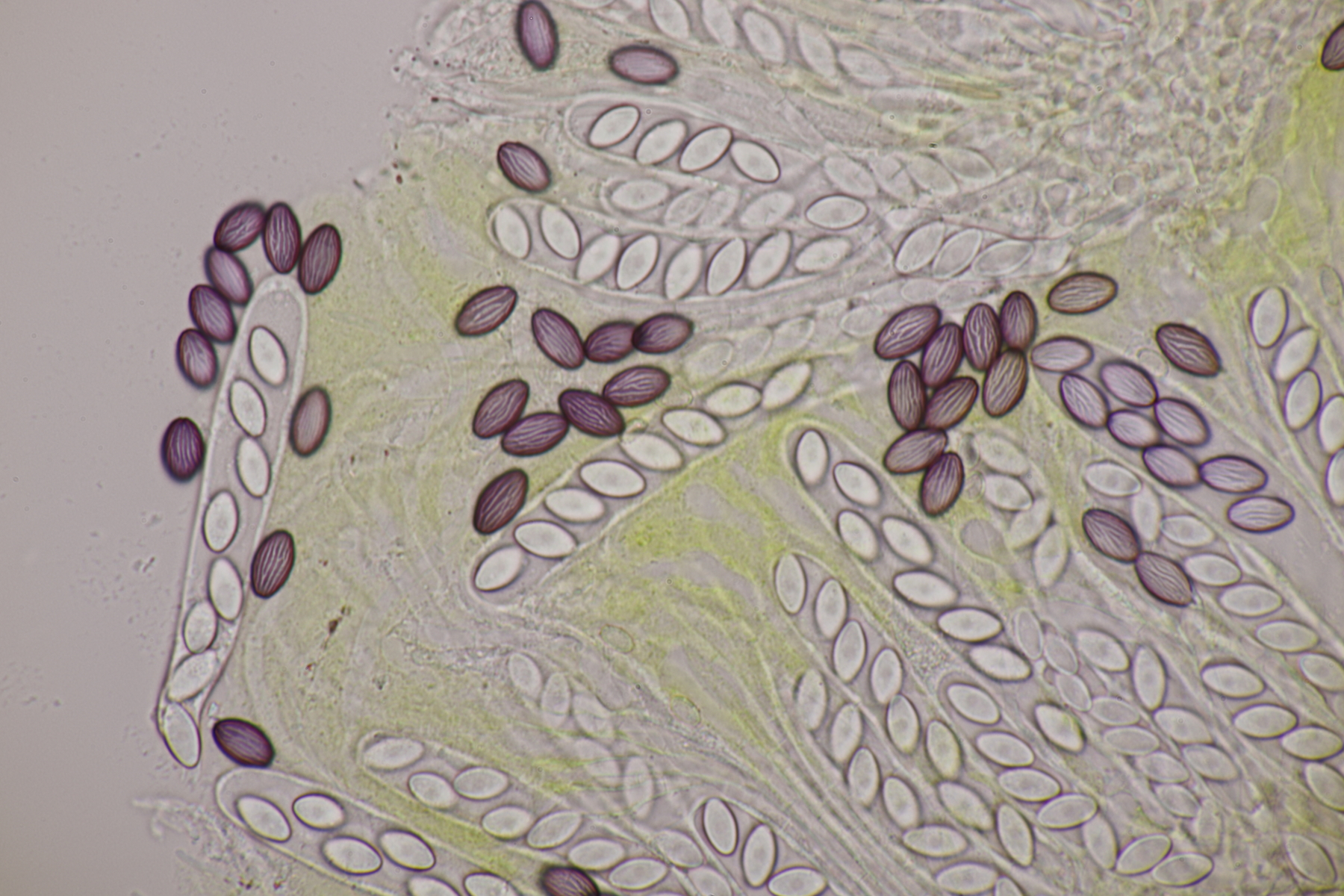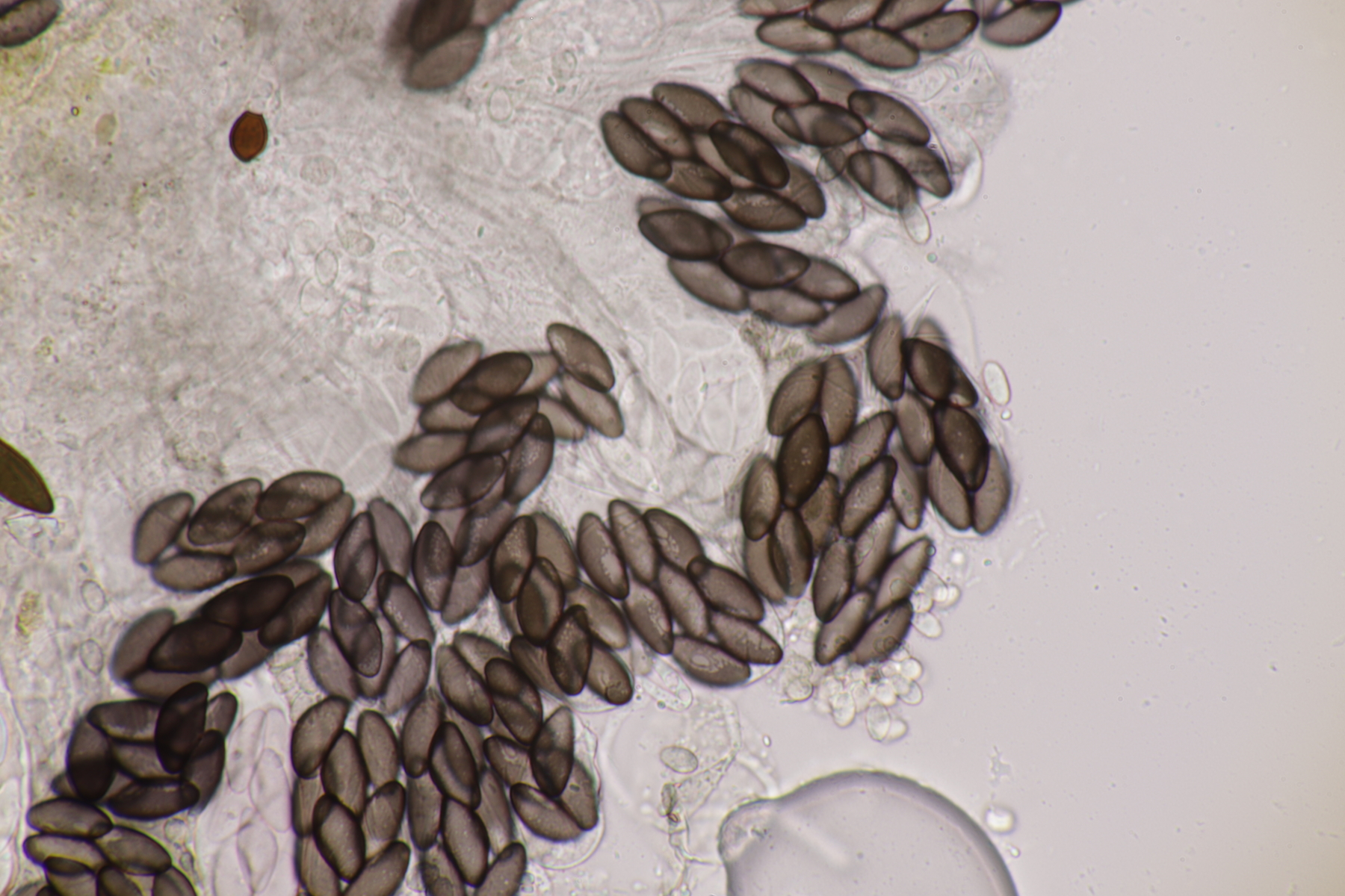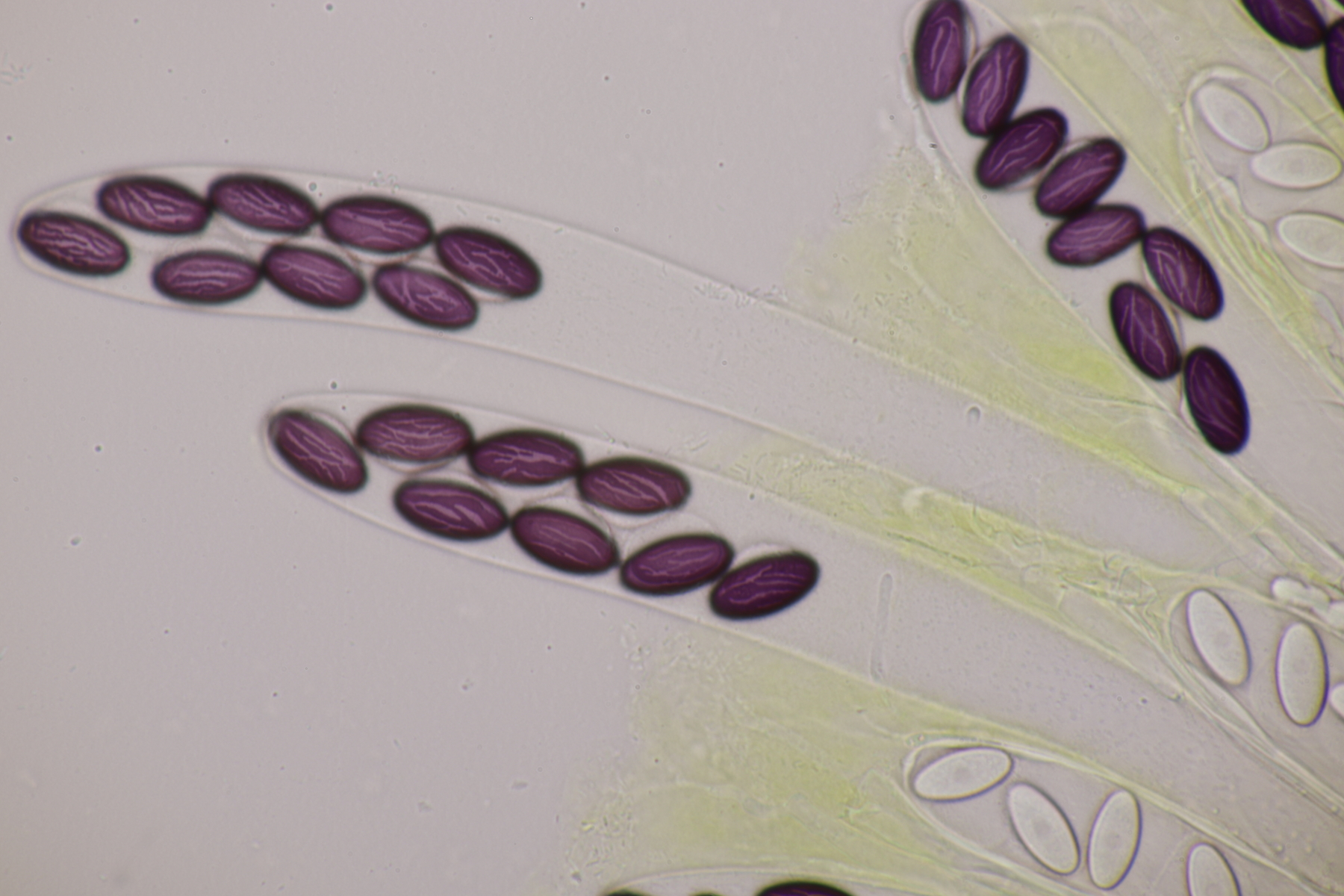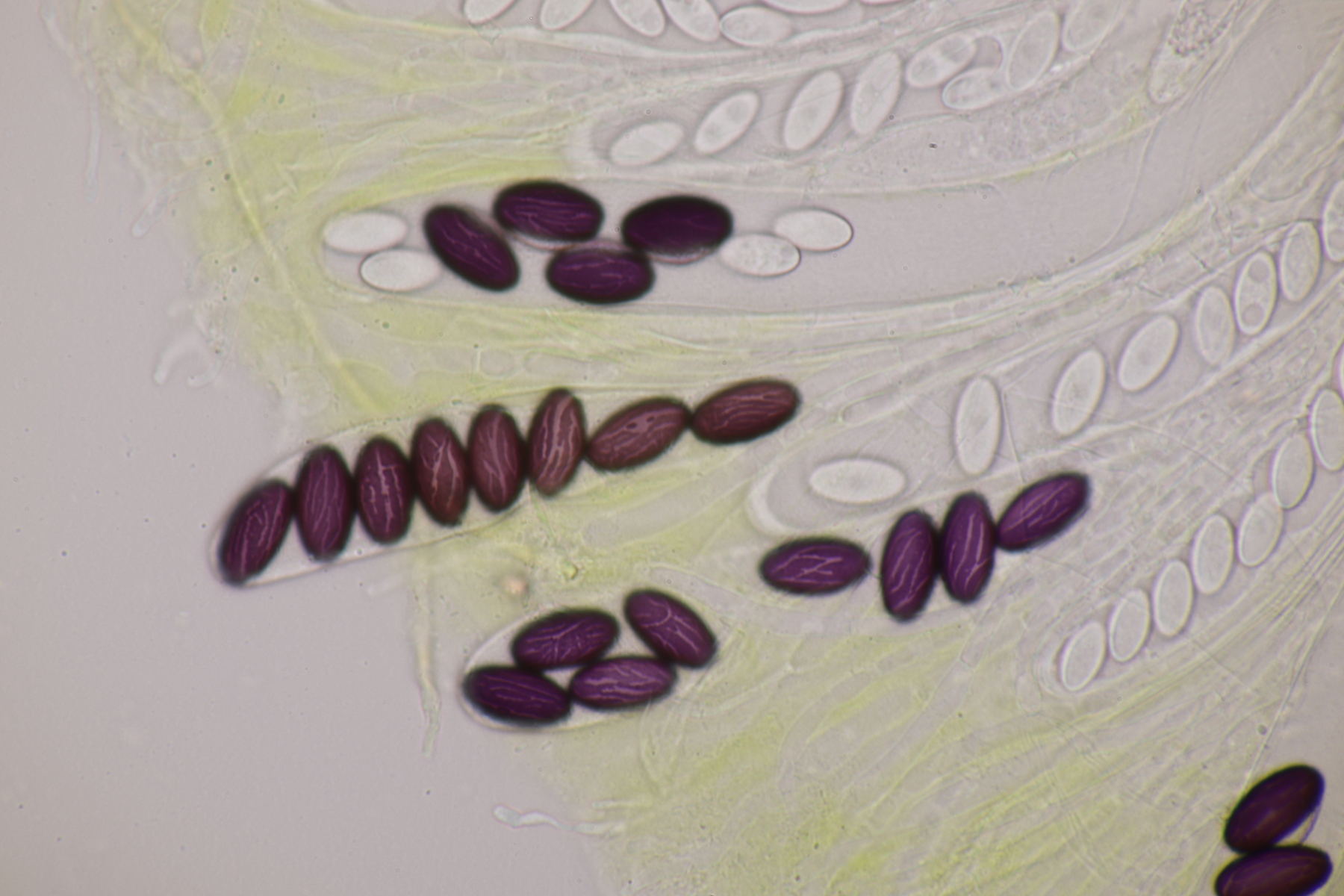 3. Ein Saccobolus mit Sporen von 14.5-16 µm x 7-8 µm. Die Sporencluster sind nur durch Druck aufgebrochen und wo eine Musterung des Epispors erkennbar ist, waren die Sporen wohl ursprünglich mal zusammengepappt. Deshalb Tendenz zu Saccobolus versicolor.