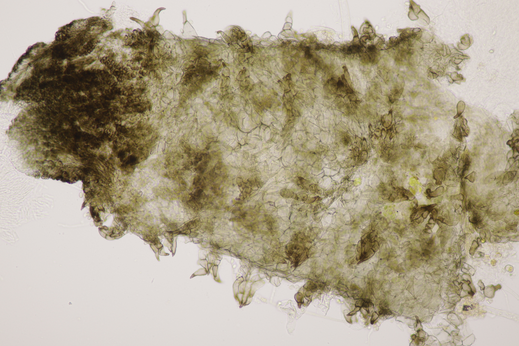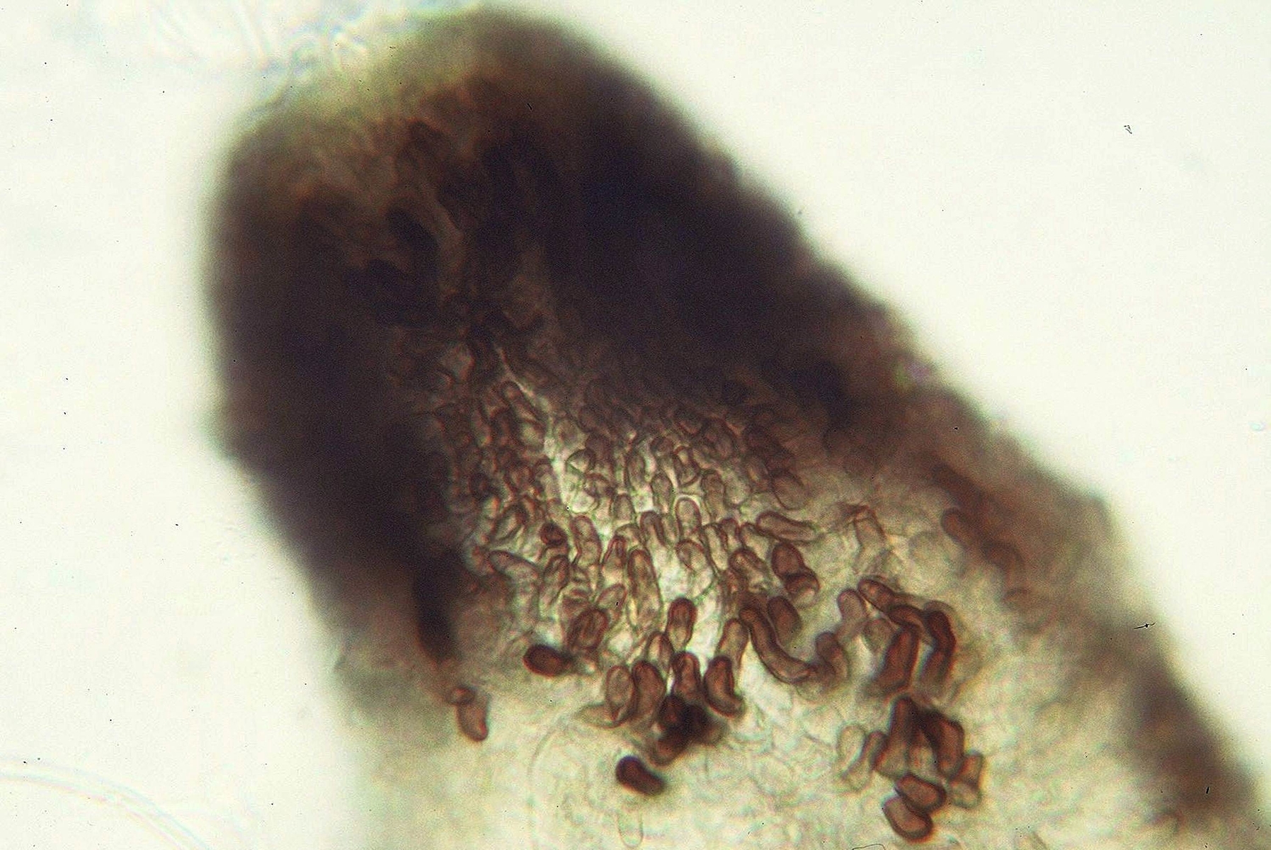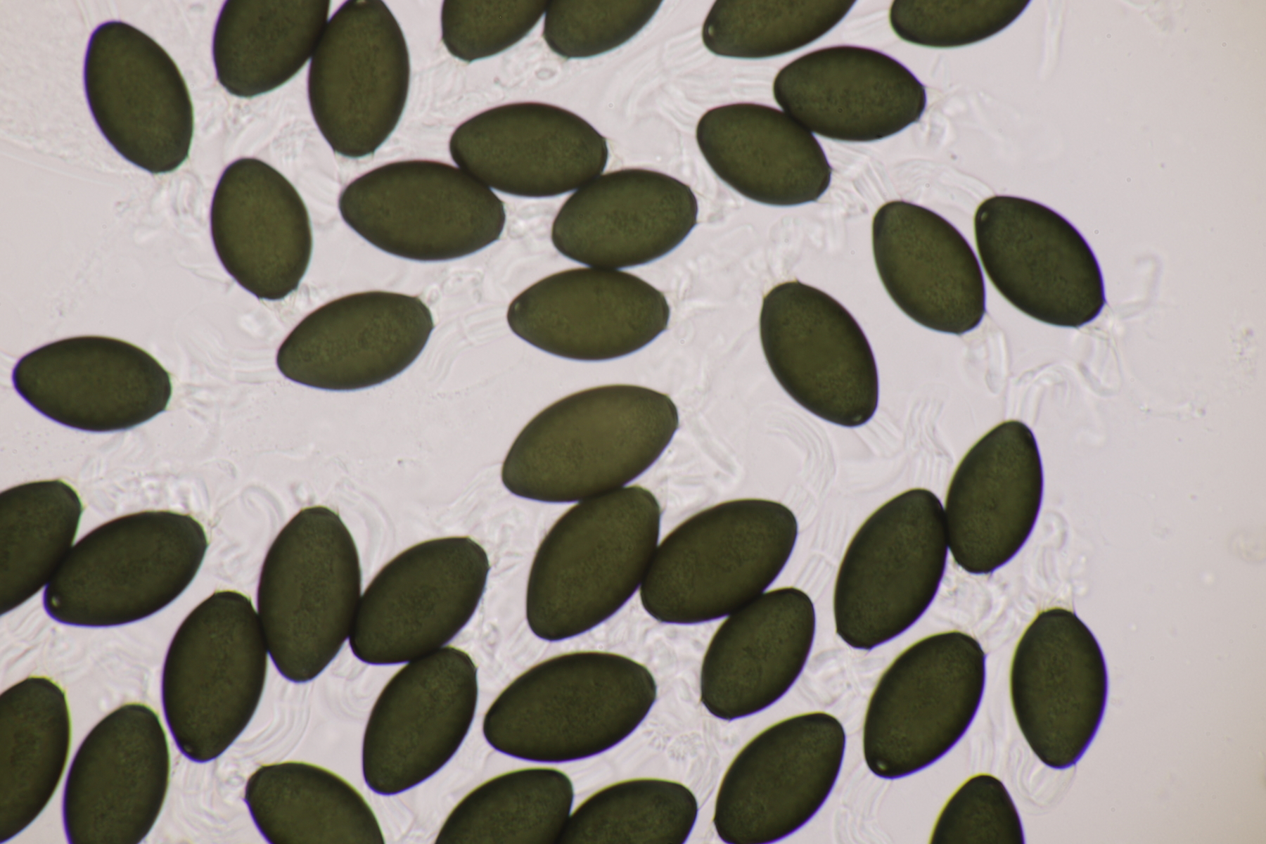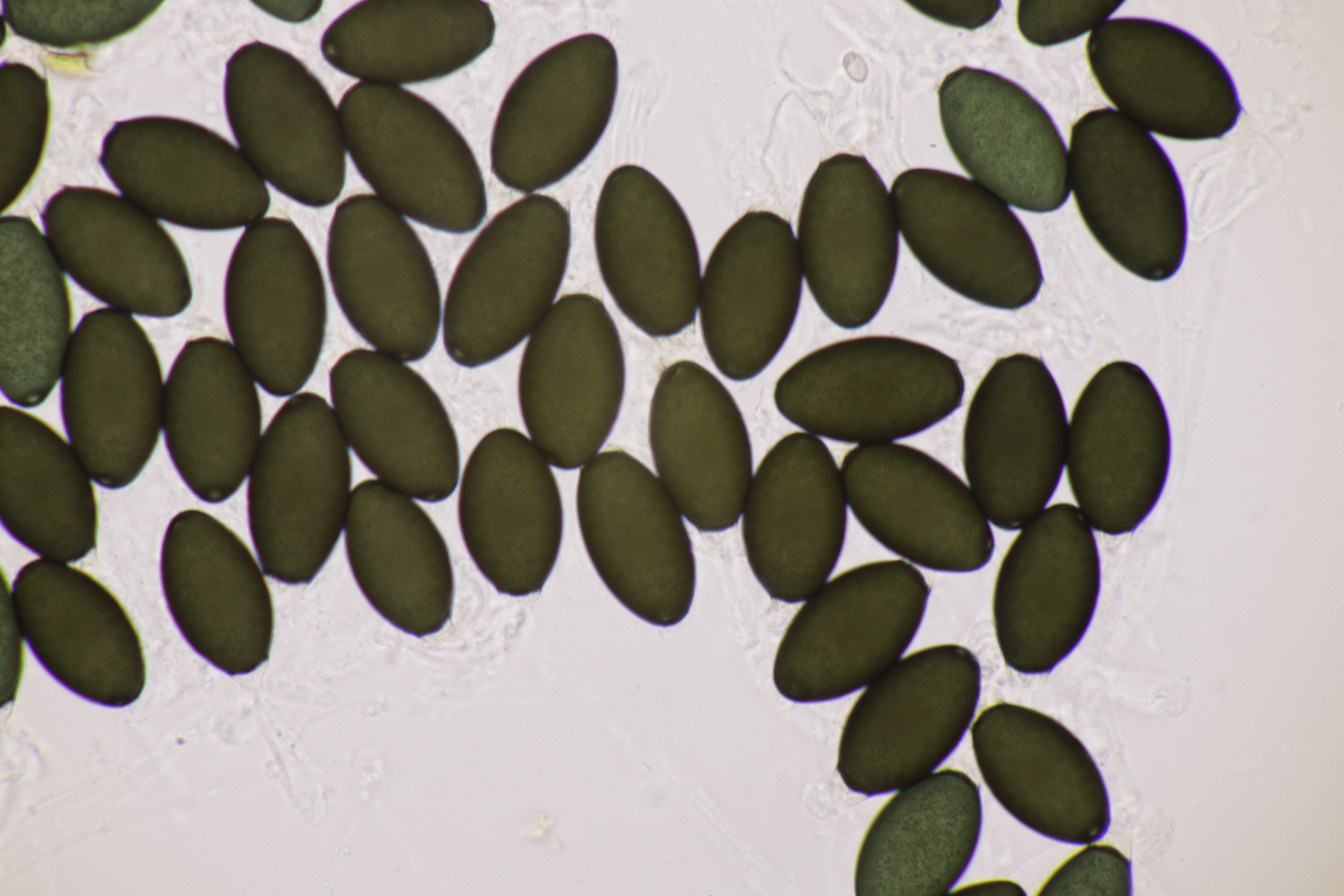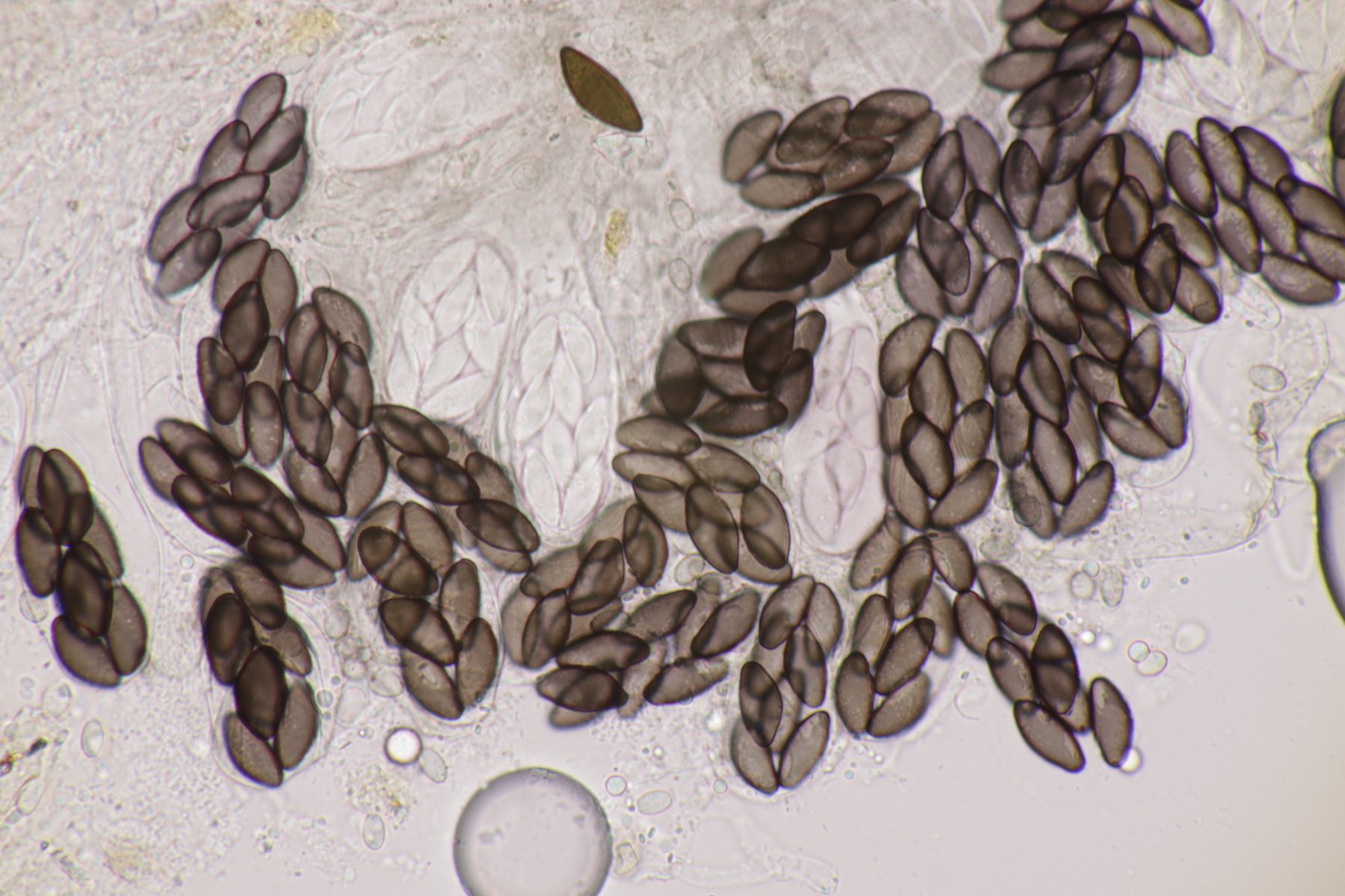 3. Ein Saccobolus mit Sporen von 14.5-16 µm x 7-8 µm. Die Sporencluster sind nur durch Druck aufgebrochen und wo eine Musterung des Epispors erkennbar ist, waren die Sporen wohl ursprünglich mal zusammengepappt. Deshalb Tendenz zu Saccobolus versicolor.