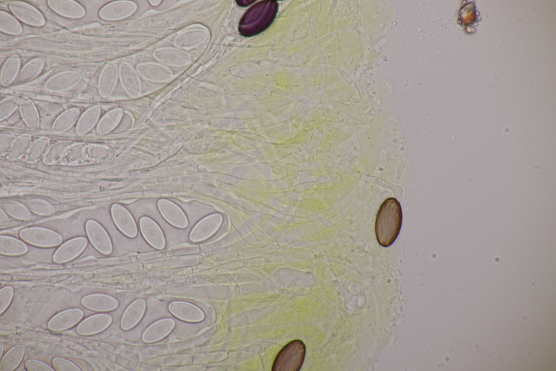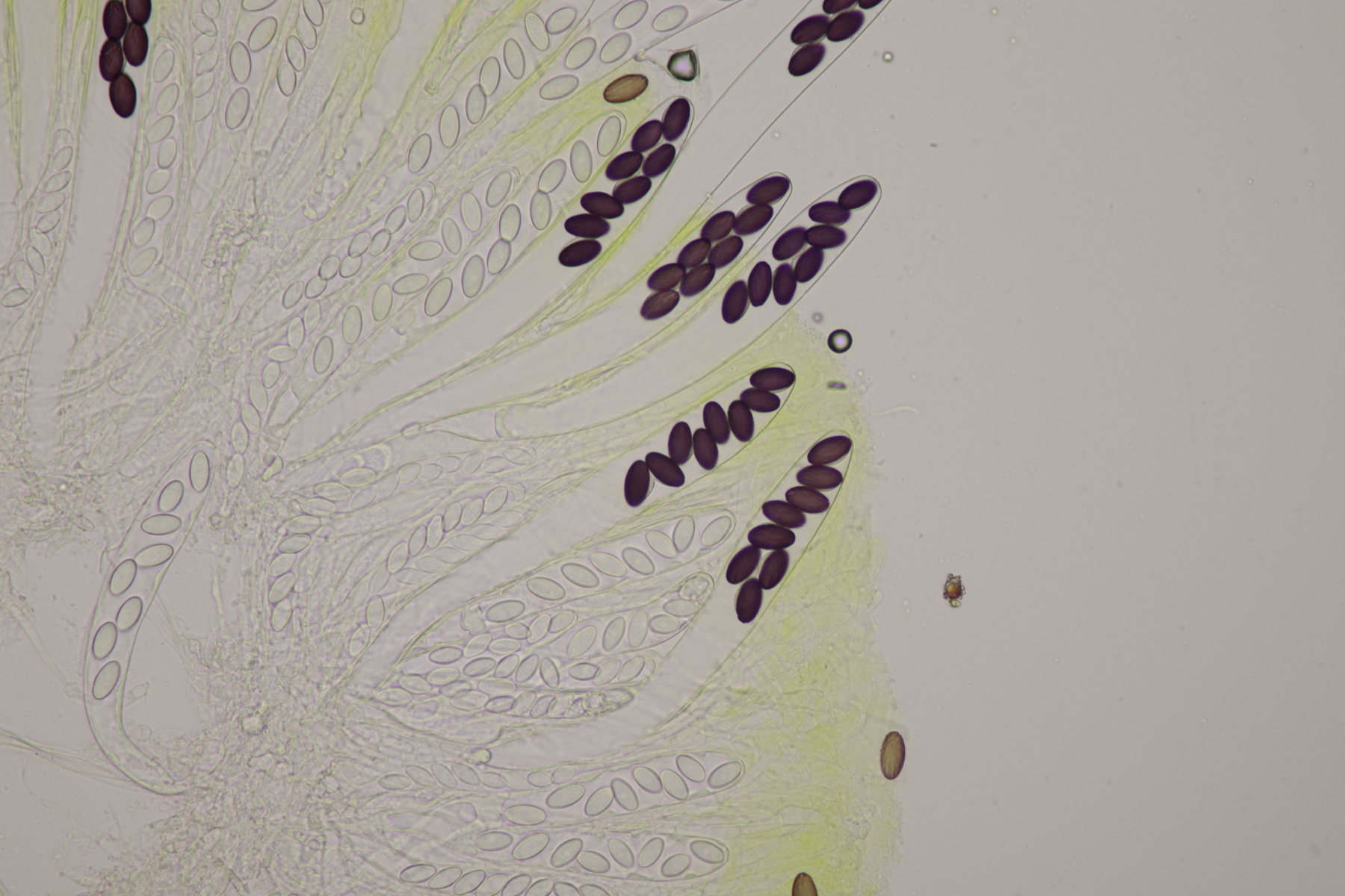 4. Ein weiterer Ascobolus, von dem ich leider kein makroskopisches Bild gemacht habe, bevor ich ihn zerlegt habe. Er war aber von mittlerer Größe (sprich irgendwo zwischen albidus und sacchariferus) und gelb. Die Sporen messen 18.5-19.3 µm x 9.7-10.5. Auffällig auch eine gelbe Schleimschicht, in die die Paraphysen eingebettet sind. Leider will van Brummelen bei den gelben Ascobolussen Dinge wissen, die ich ohne Makrobild des Fruchtkörpers nicht mehr beantworten kann...