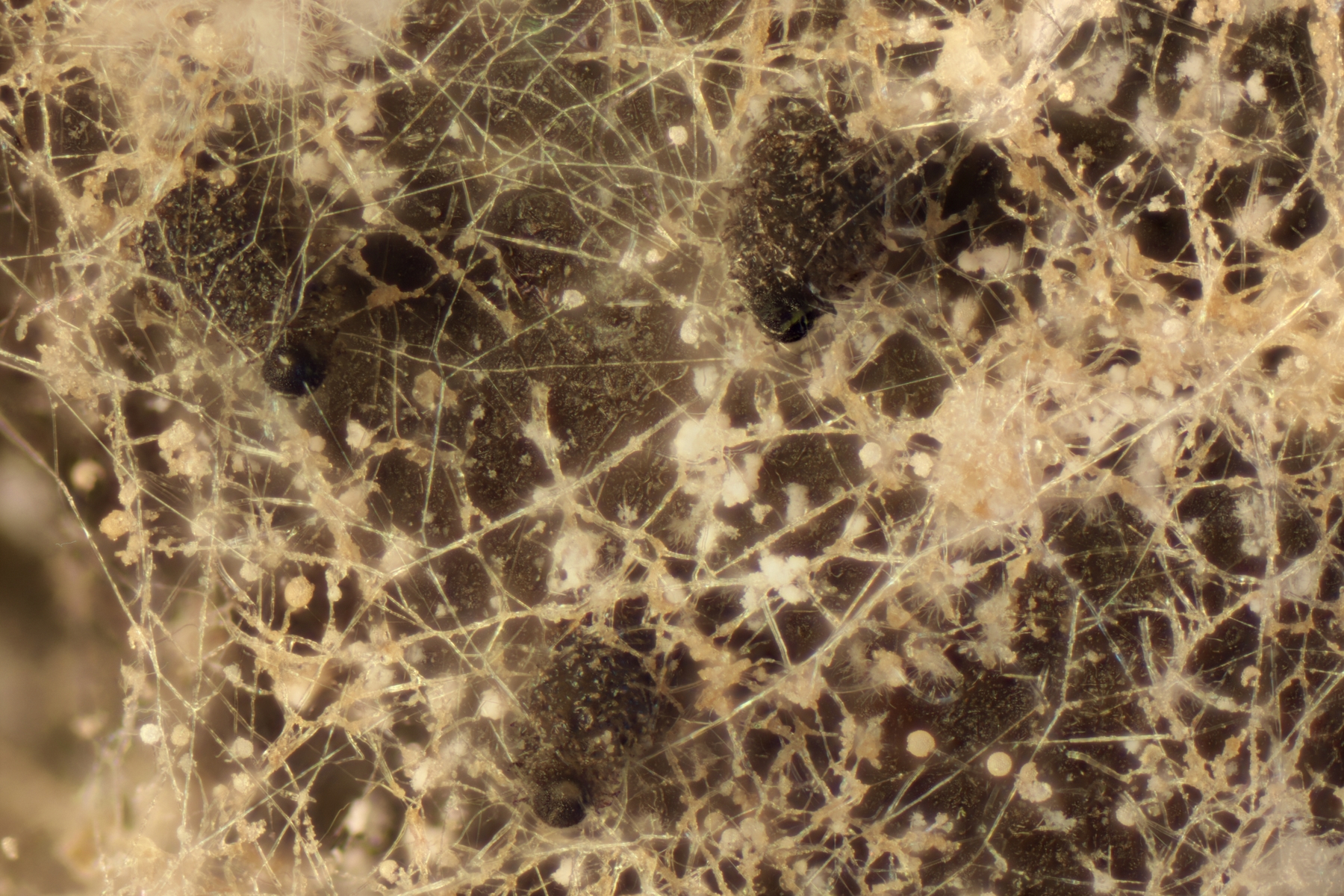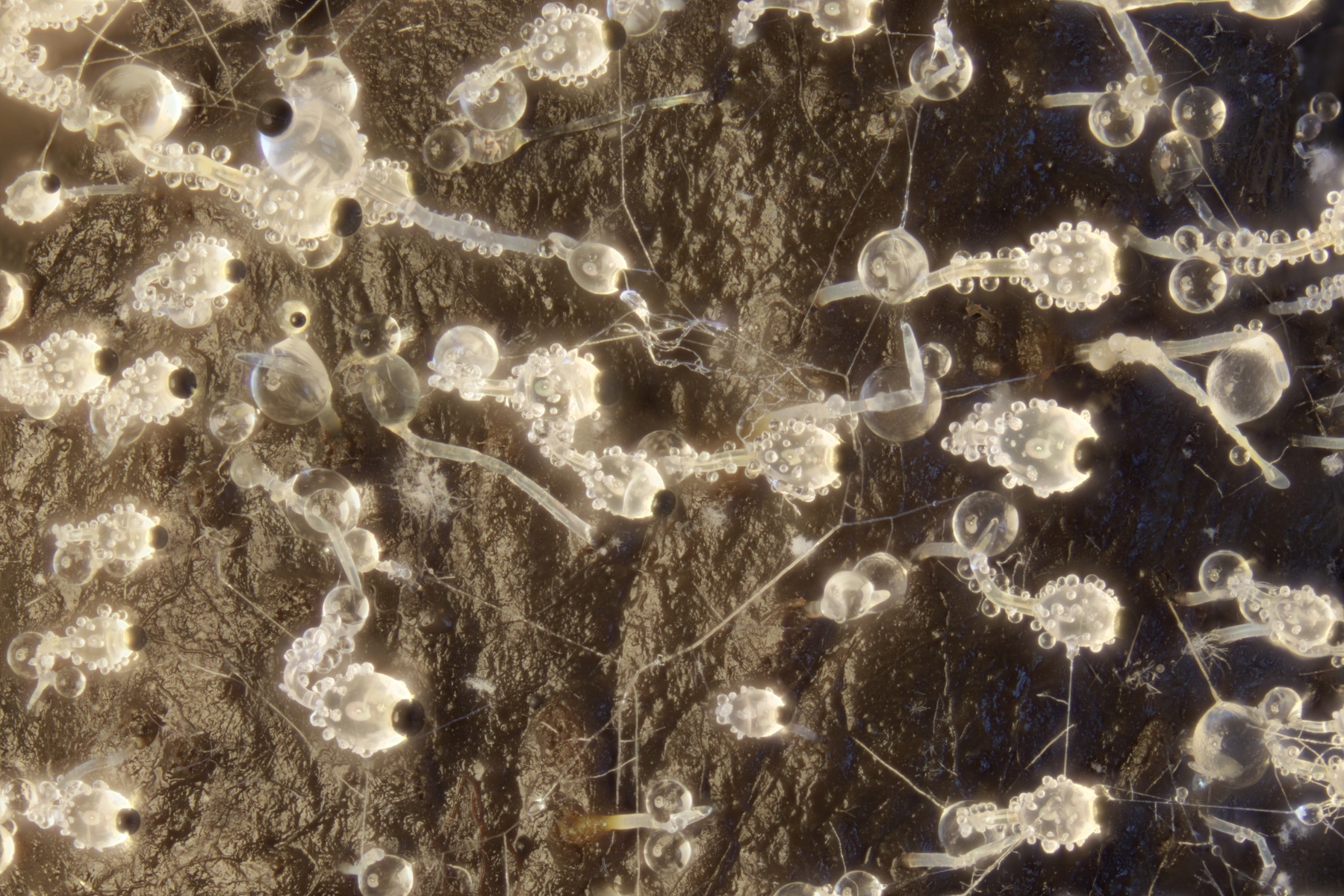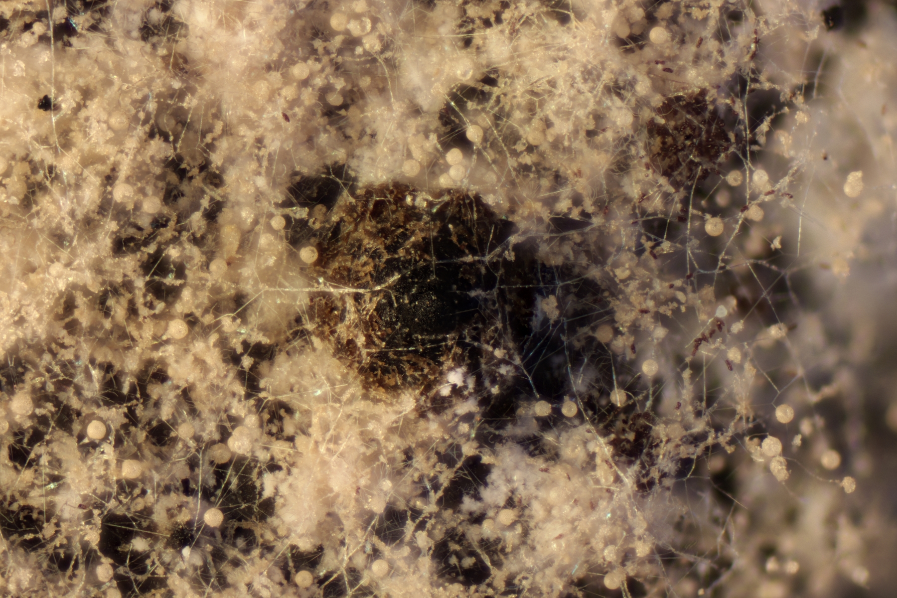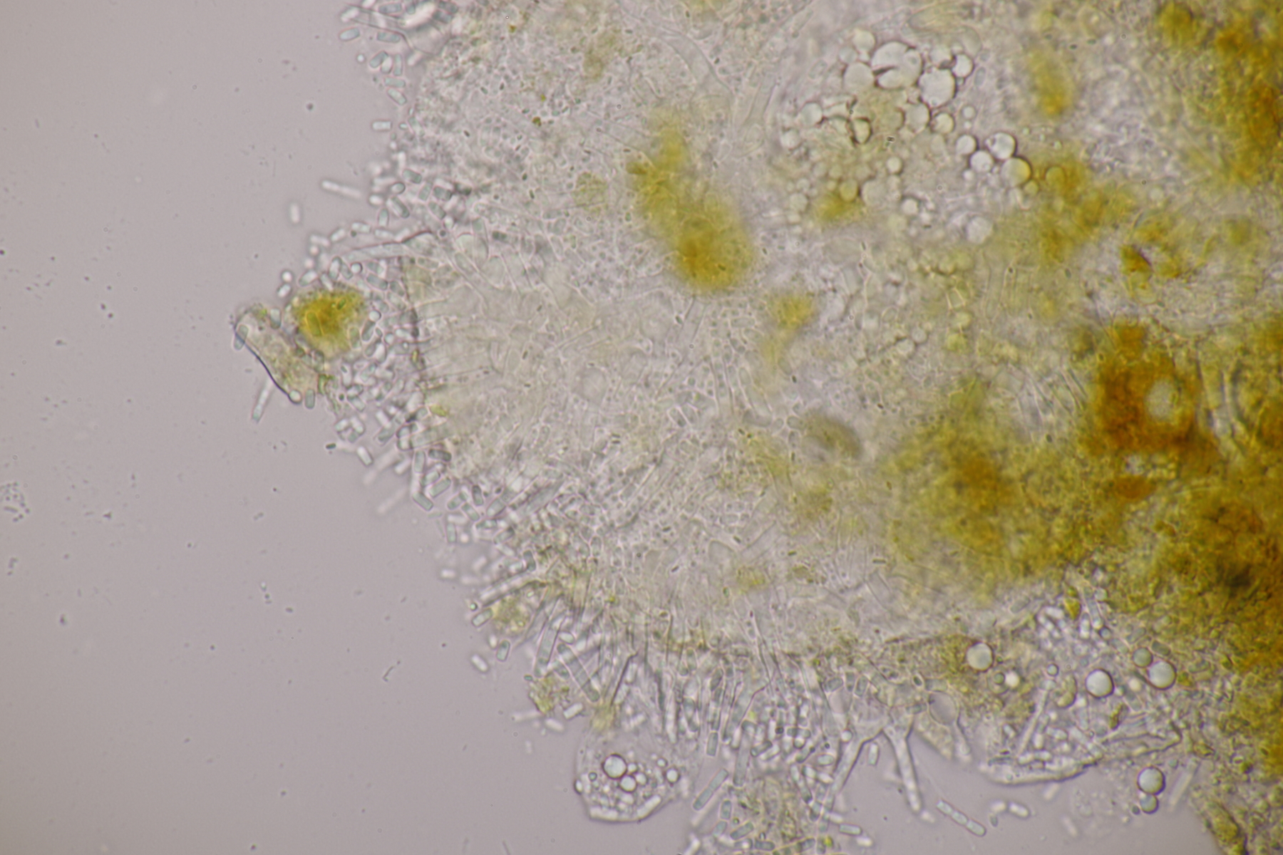 5. Dann gab es auf einem Köttel kleine hyaline Knubbelchen, die sich mikroskopisch als Anamorphe entpuppten und viele kleine Konidien an stäbchenförmigen Konidienträgern bilden.