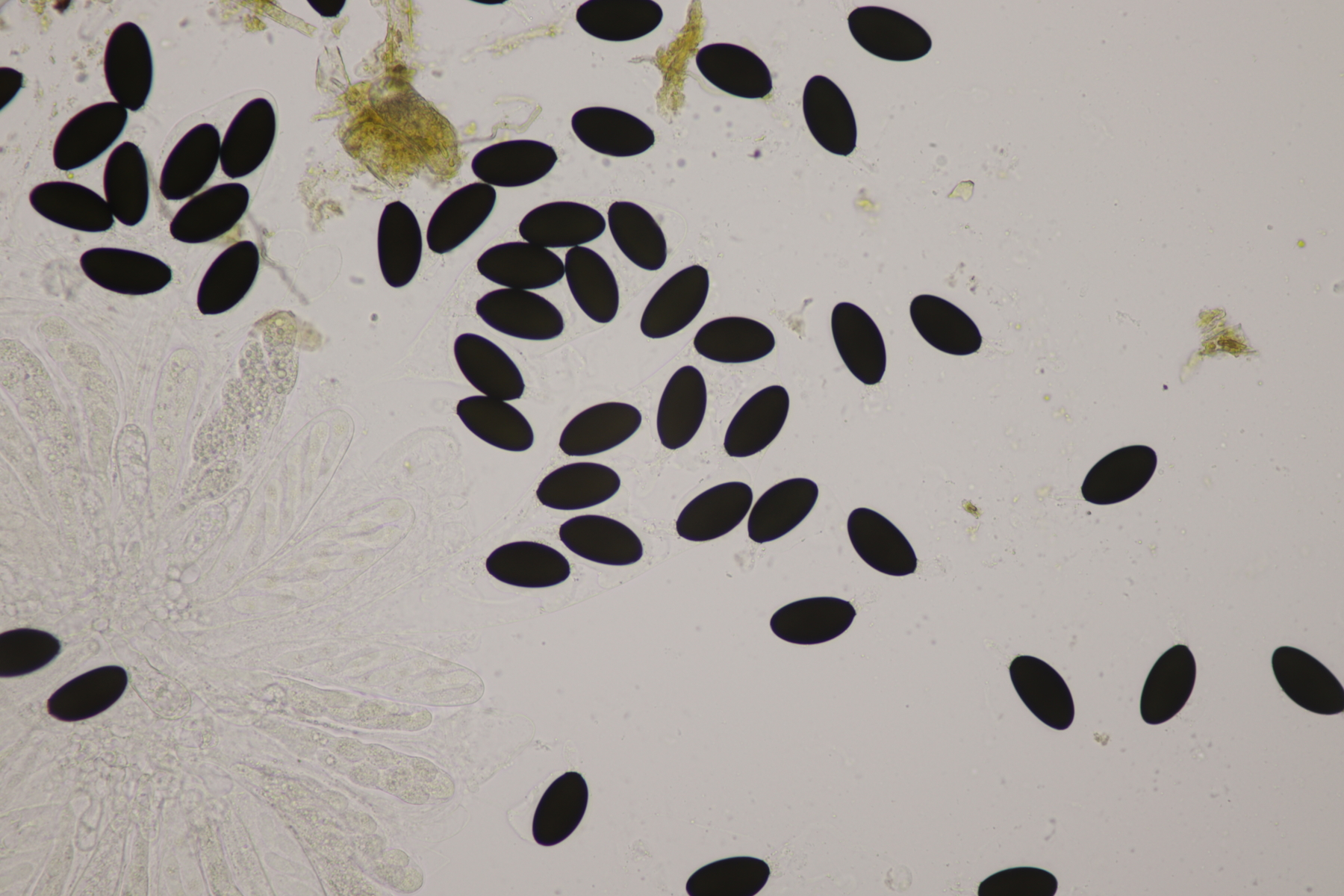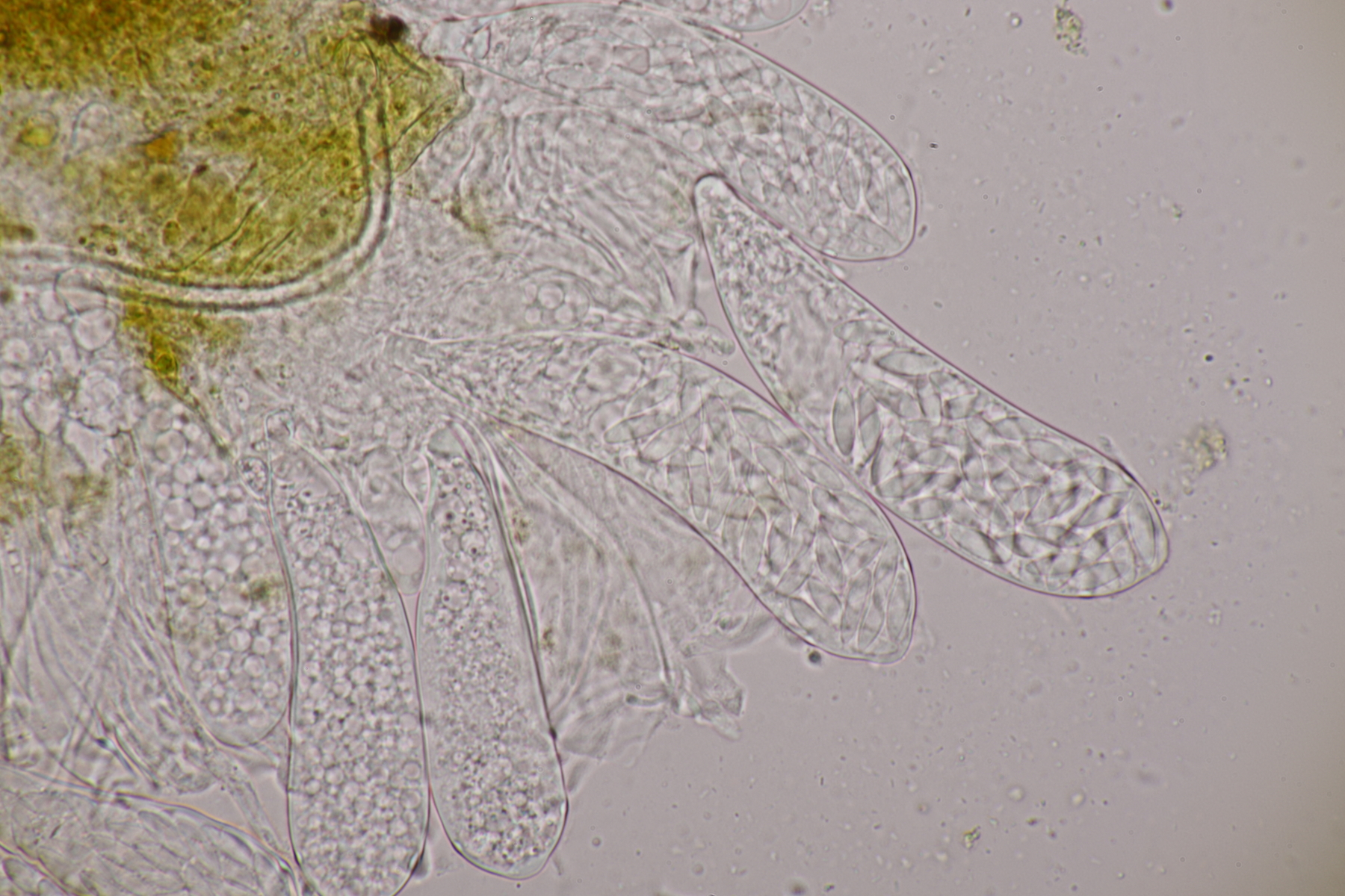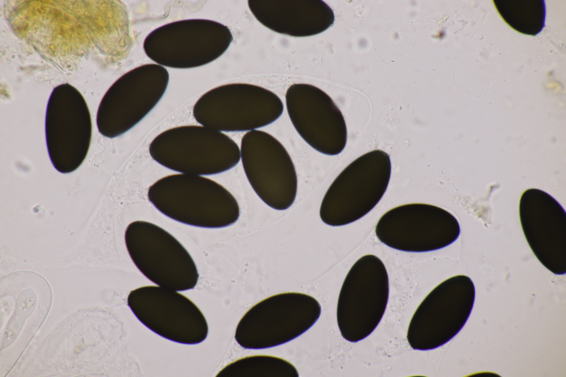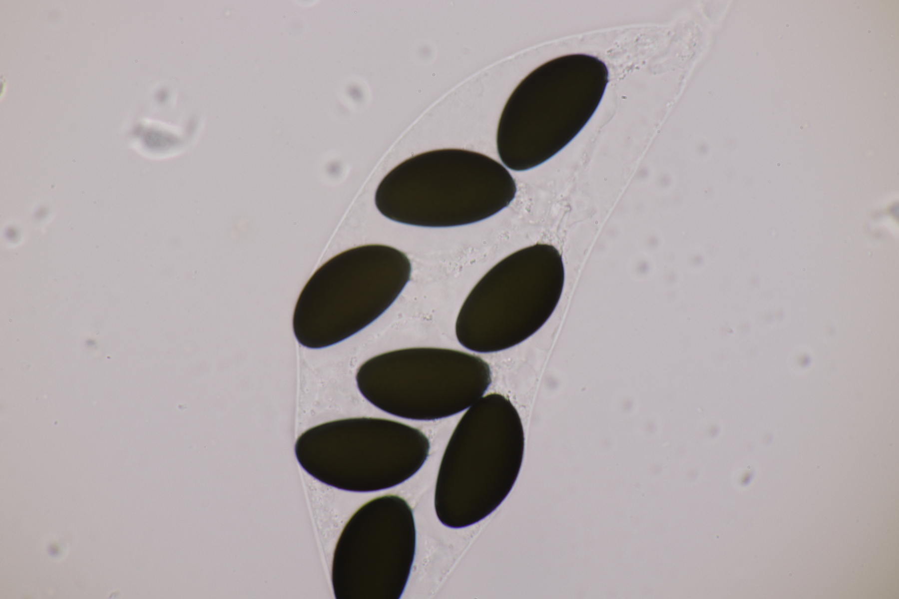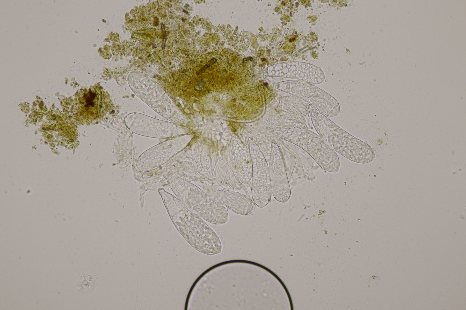 7. Ich habe zwar keine Sporen gezählt, tendiere aber zu 256 Sporen pro Ascus und damit zu Podospora curvicolla. Caudae waren definitiv nicht aus zwei Filamenten bestehend, wie das bei P. granulatostriata mit 512 Sporen der Fall ist, sondern sahen "normal" aus und waren ziemlich unscheinbar.