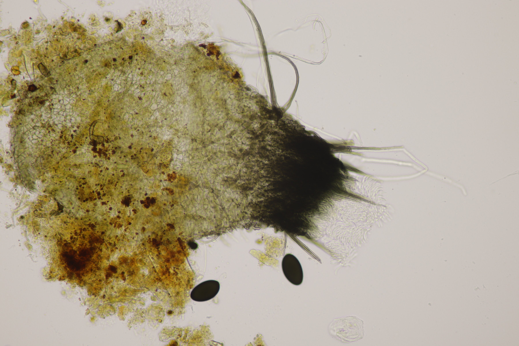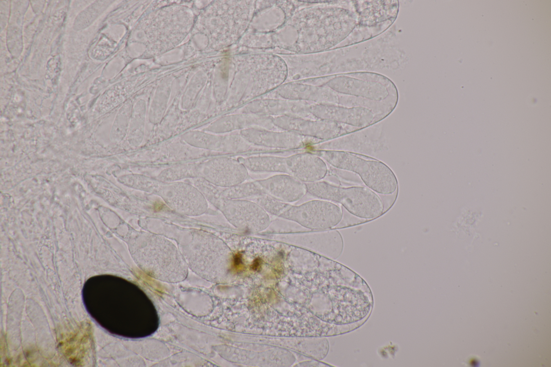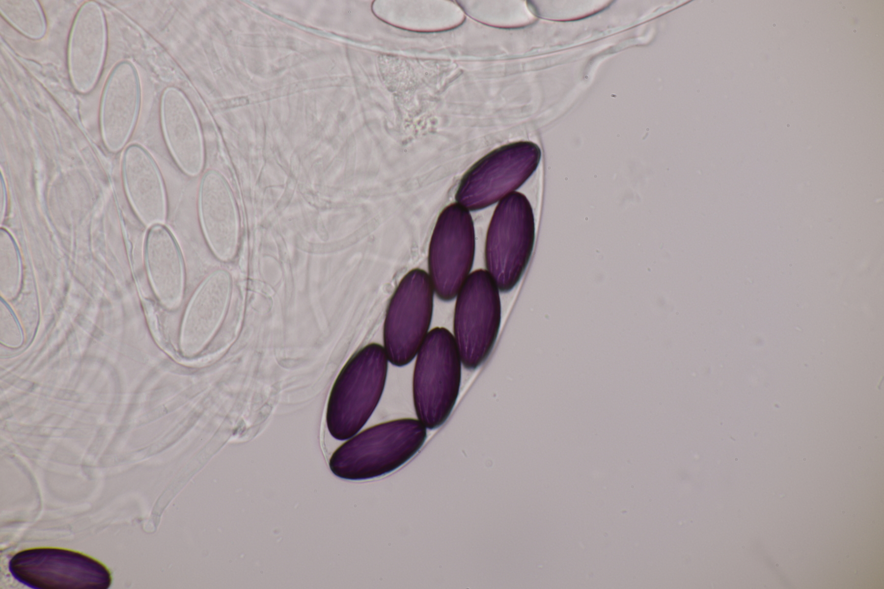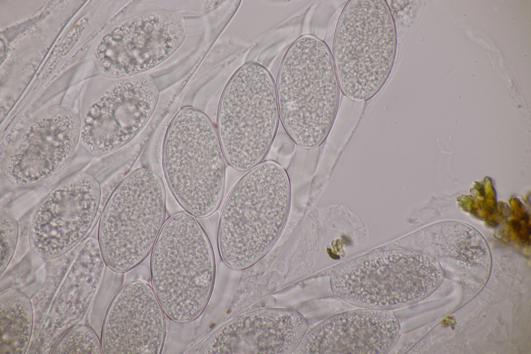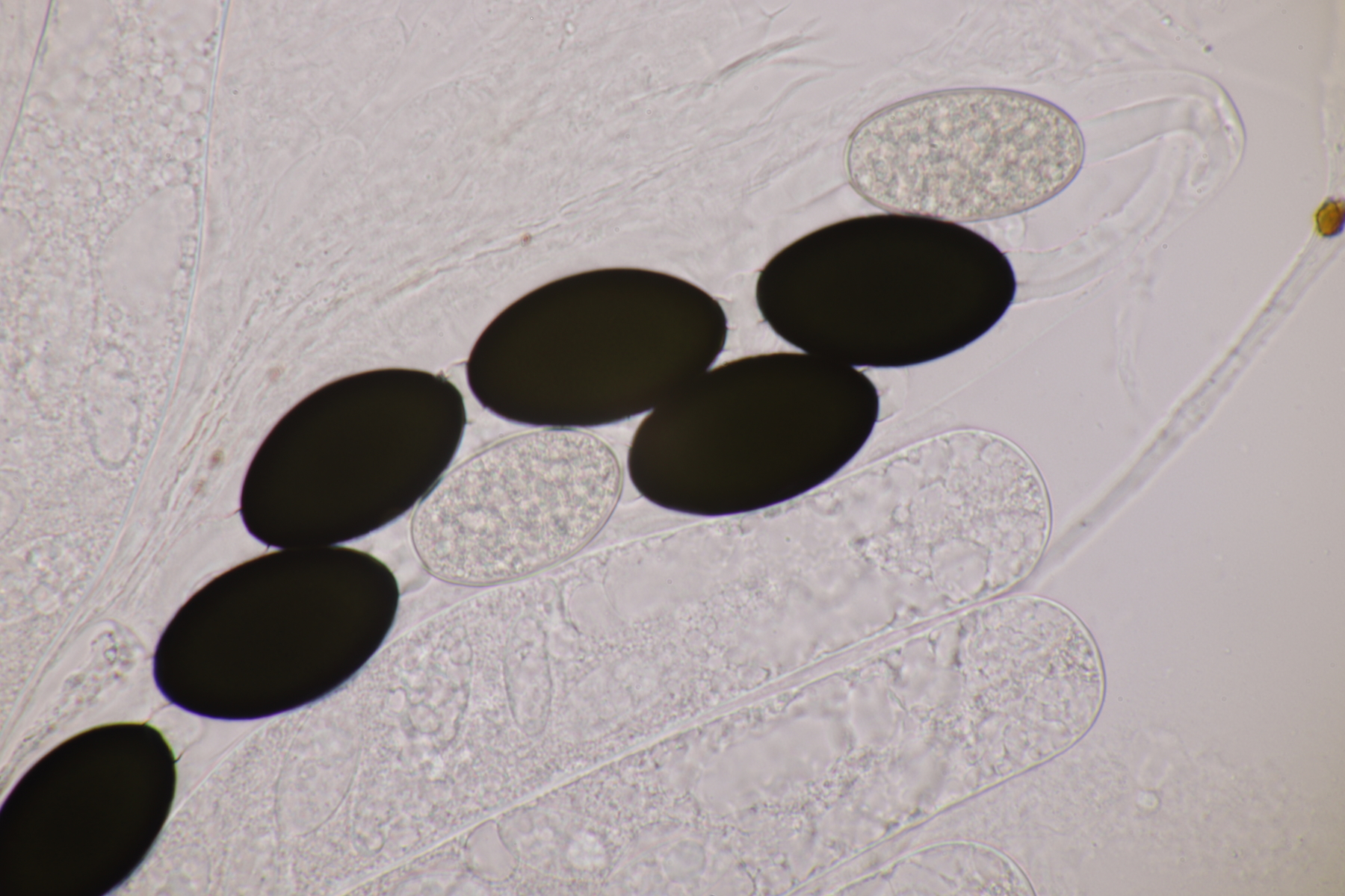 7. Ich habe zwar keine Sporen gezählt, tendiere aber zu 256 Sporen pro Ascus und damit zu Podospora curvicolla. Caudae waren definitiv nicht aus zwei Filamenten bestehend, wie das bei P. granulatostriata mit 512 Sporen der Fall ist, sondern sahen "normal" aus und waren ziemlich unscheinbar.