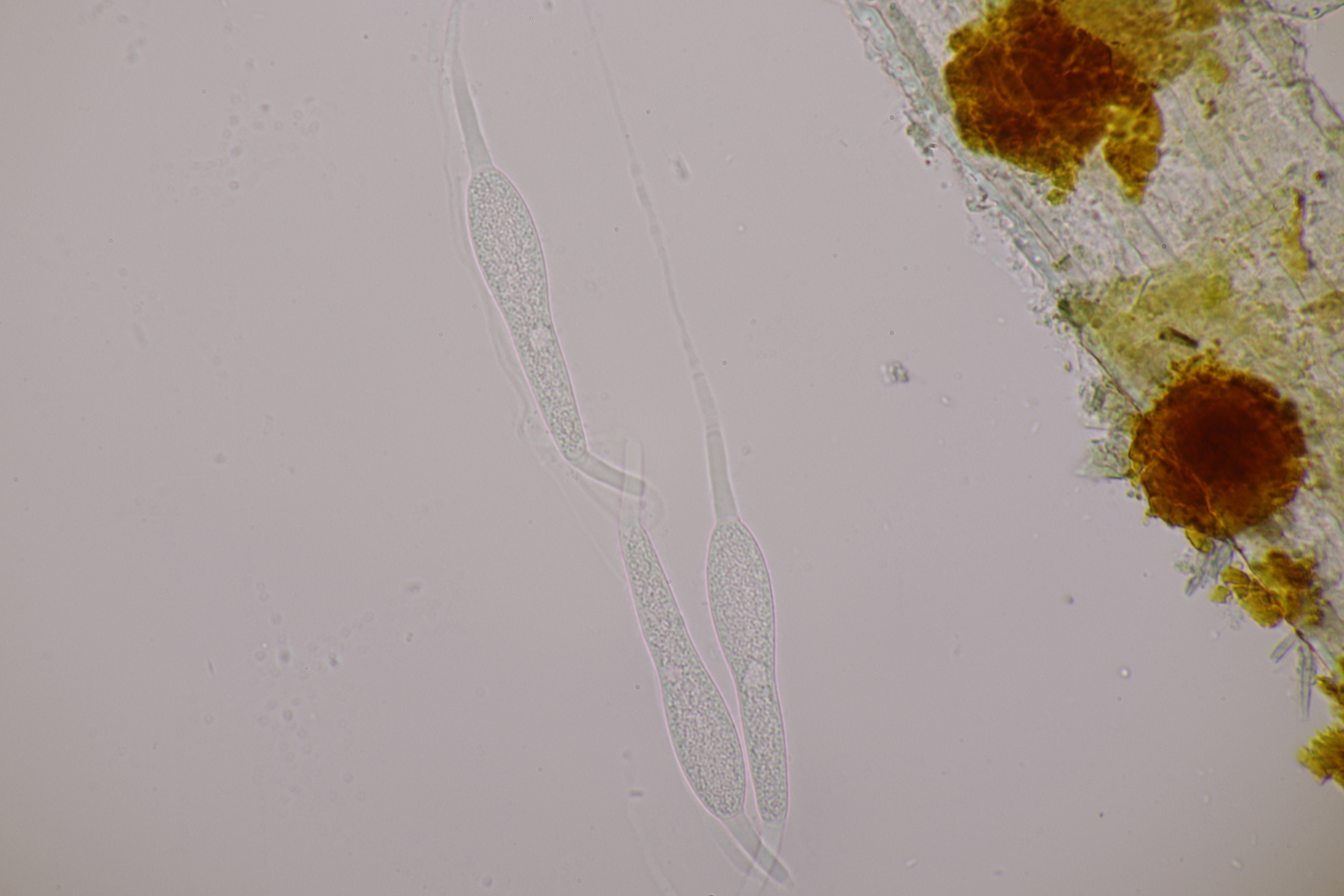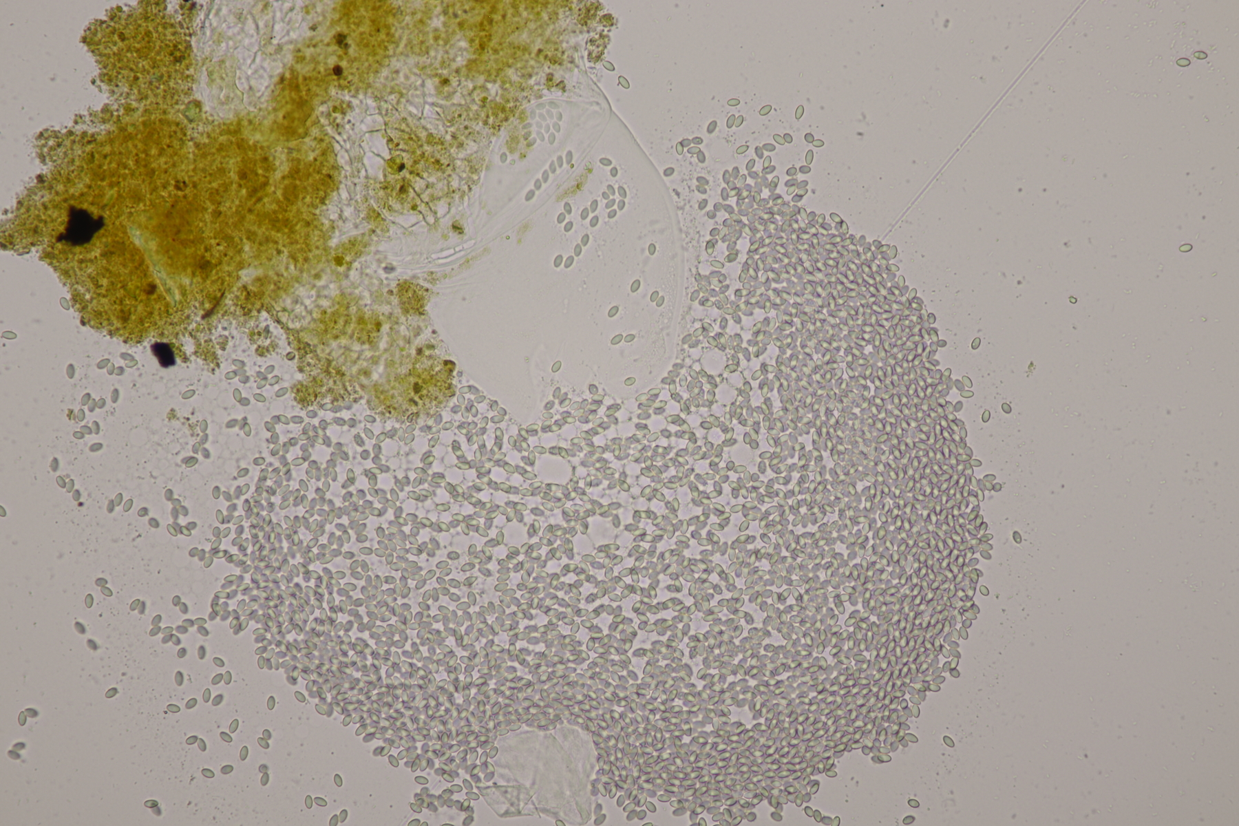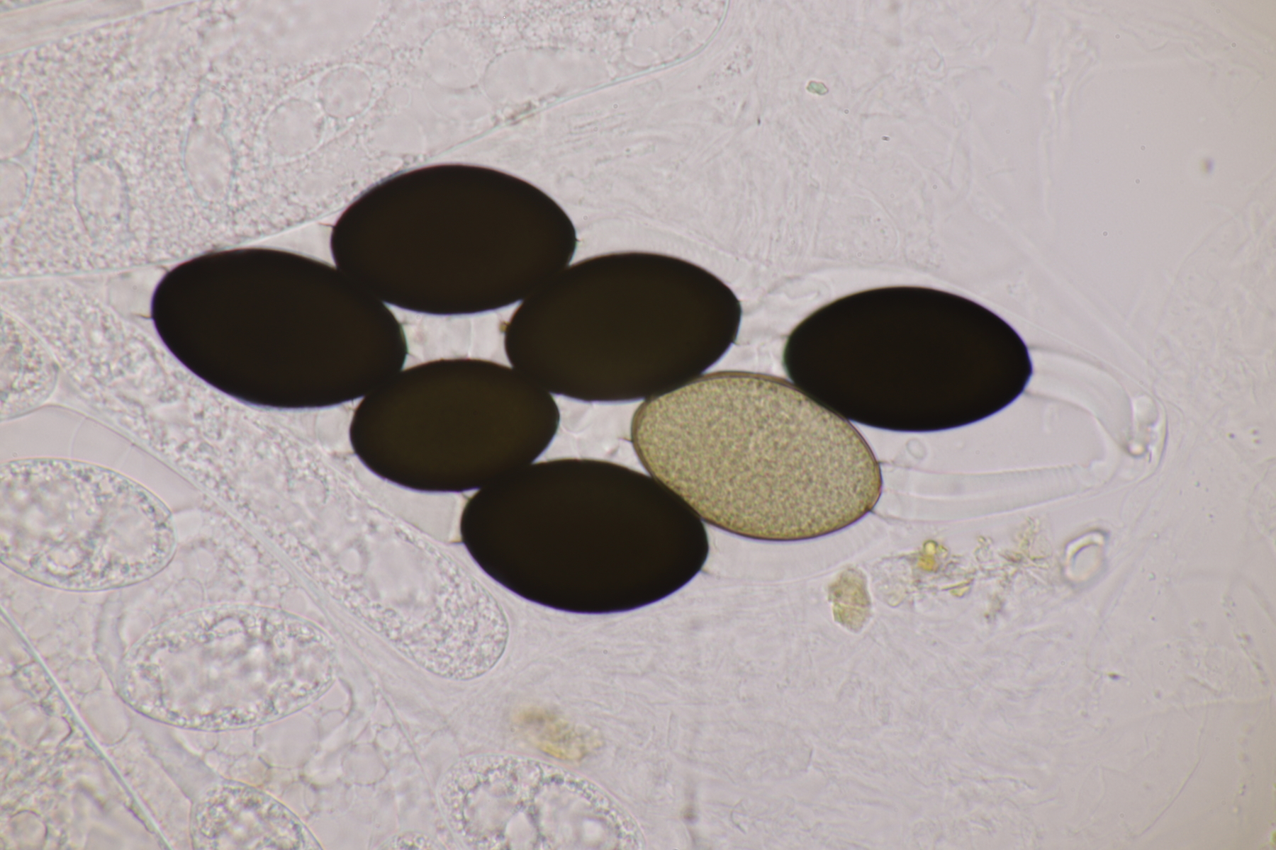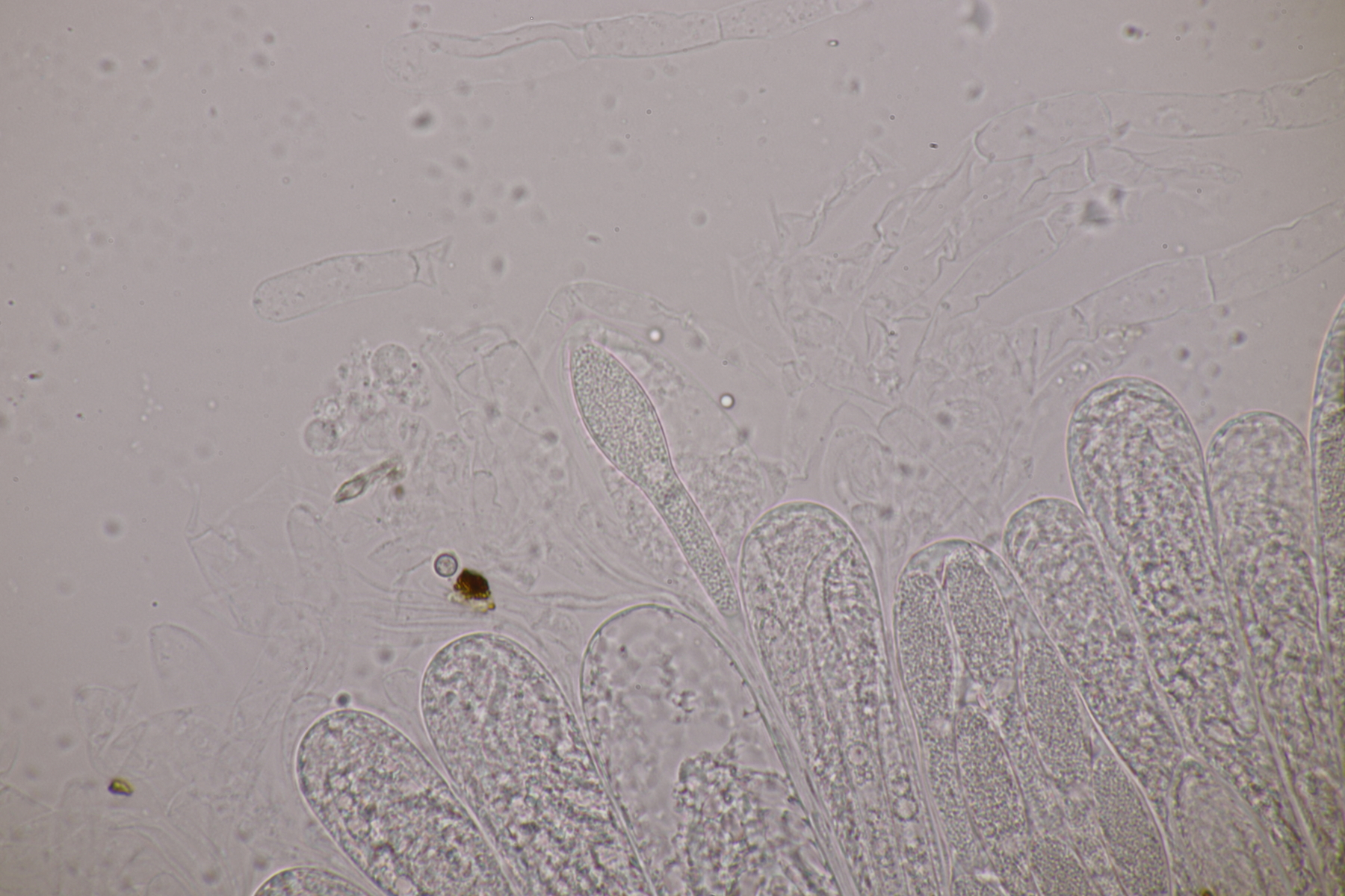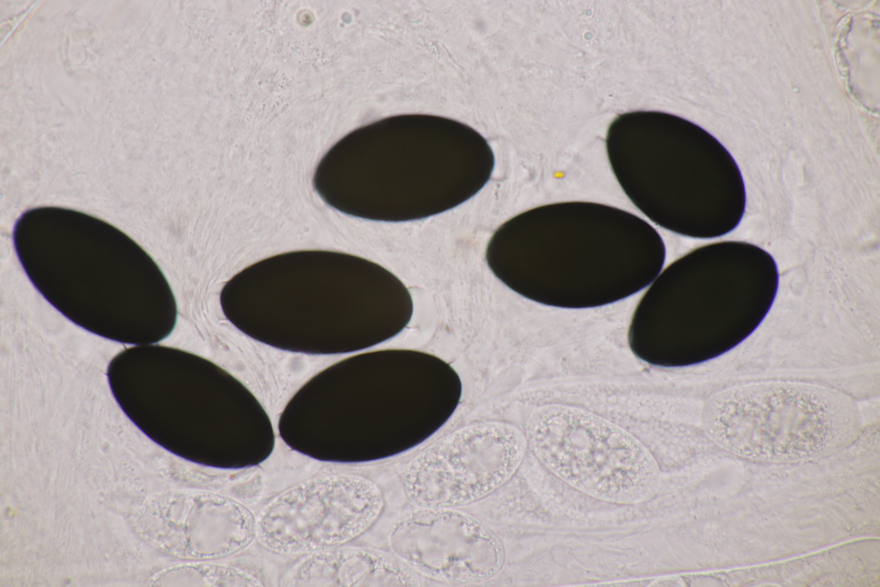 7. Ich habe zwar keine Sporen gezählt, tendiere aber zu 256 Sporen pro Ascus und damit zu Podospora curvicolla. Caudae waren definitiv nicht aus zwei Filamenten bestehend, wie das bei P. granulatostriata mit 512 Sporen der Fall ist, sondern sahen "normal" aus und waren ziemlich unscheinbar.