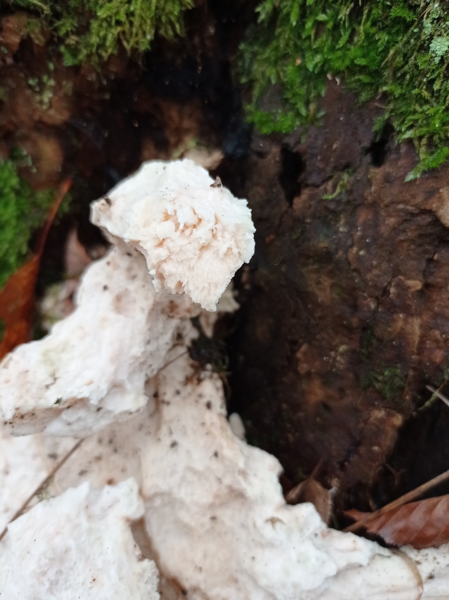 Der Weiße: Den konnte schon man aus 20m am Baum sehen. Weiß, unförmig, nichts an Stiel, Lamellen oder sonstwas zu erkennen. EInfach nur ein weißes etwas. Ich hab oben mal ein Stück angeschnitten. Sieht man auf dem Foto kaum, aber für mich auch eher nichtssagend. Ein poröses etwas.