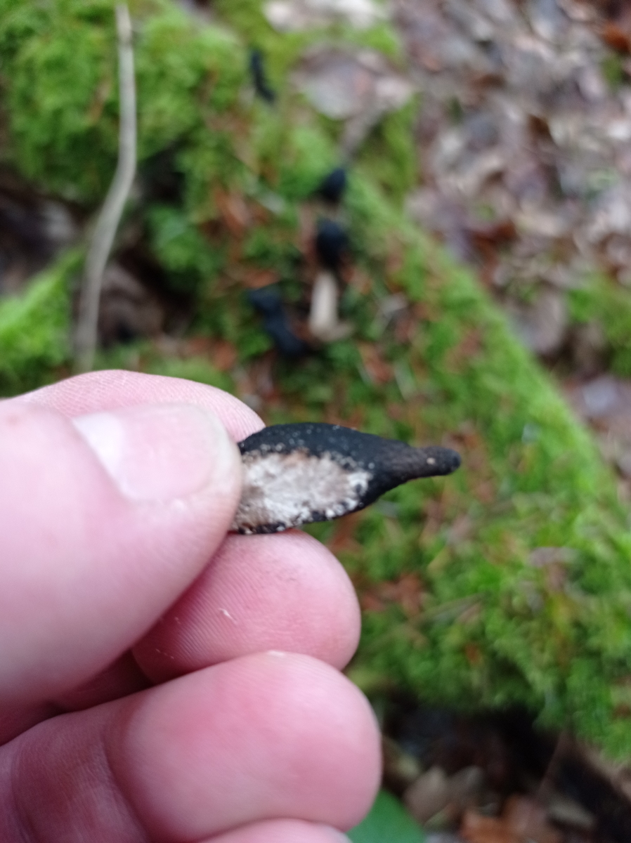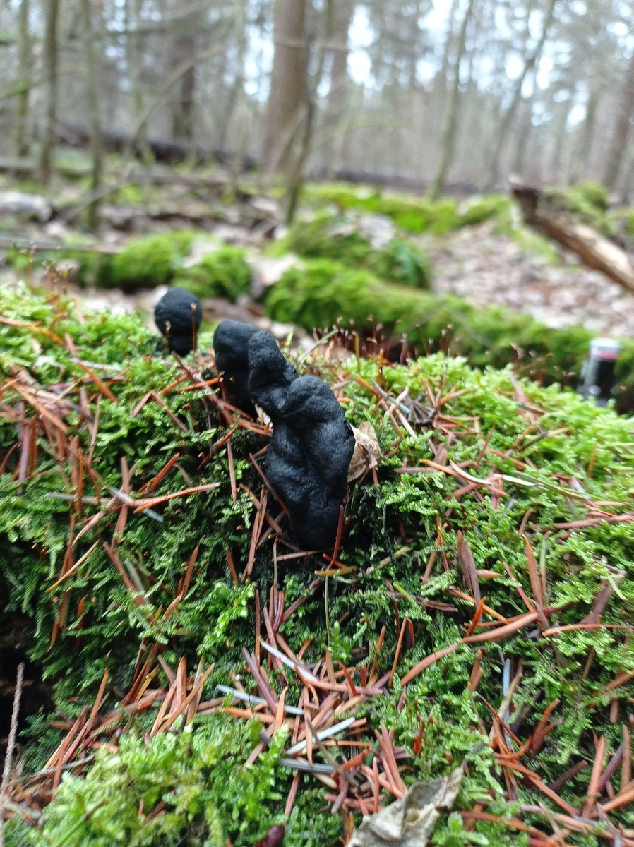 Der Kleine: Der kleine Schwarze. Habe ich zuerst für Rehlosung gehalten. Wuchs auf einem vermoosten, liegendem Baum. Hart wie Losung und innen weiß.