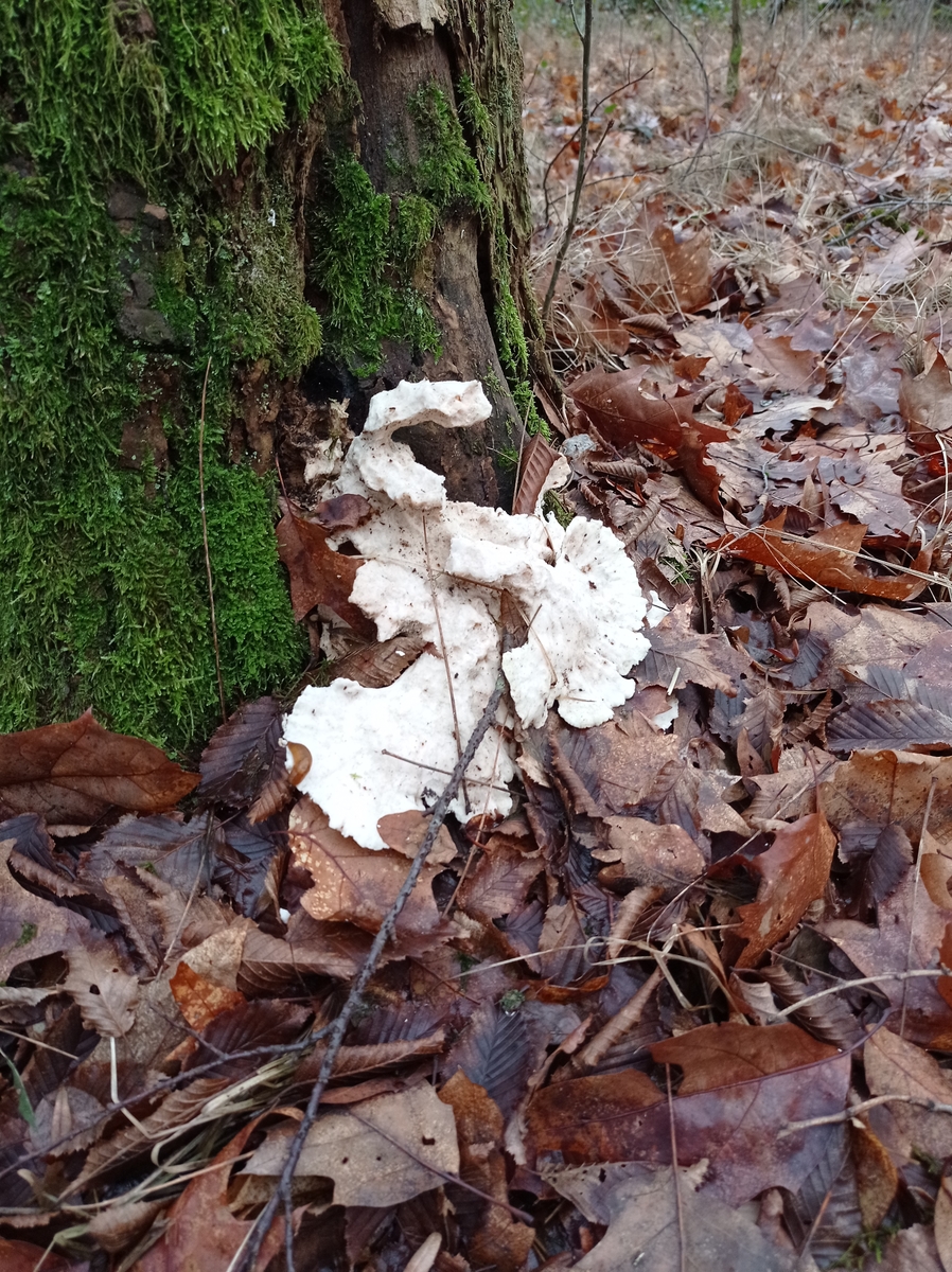 Der Weiße: Den konnte schon man aus 20m am Baum sehen. Weiß, unförmig, nichts an Stiel, Lamellen oder sonstwas zu erkennen. EInfach nur ein weißes etwas. Ich hab oben mal ein Stück angeschnitten. Sieht man auf dem Foto kaum, aber für mich auch eher nichtssagend. Ein poröses etwas.