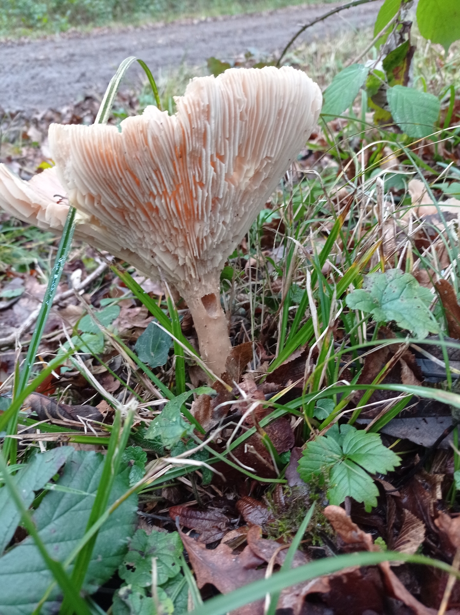 Der Große: Am Wegesrand stand der braune Lamellenpilz. Aufällig groß, zum Vergleich meinen Schlüssel beigelegt. Gerochen und geschnitten hab ich nix, da er mir zu schade und zu alt erschien. Es gibt also nur die Fotos.