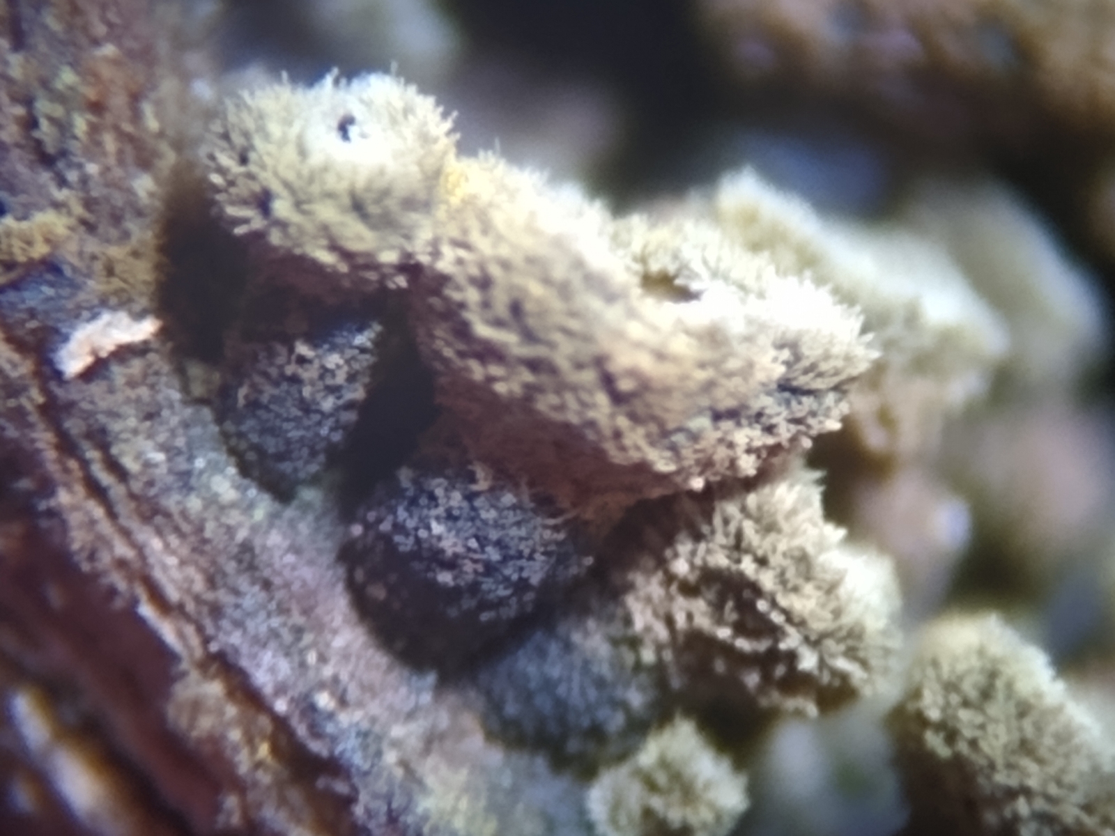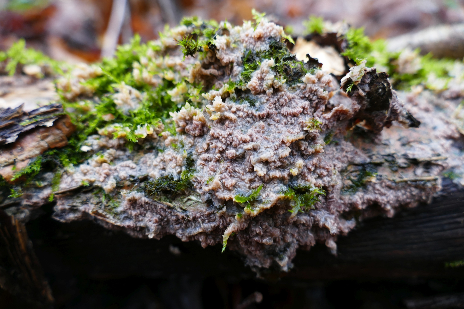 Exidia rugosa, der Stoppelige Düsling mit feinfilziger Oberseite und warziger Unterseite: