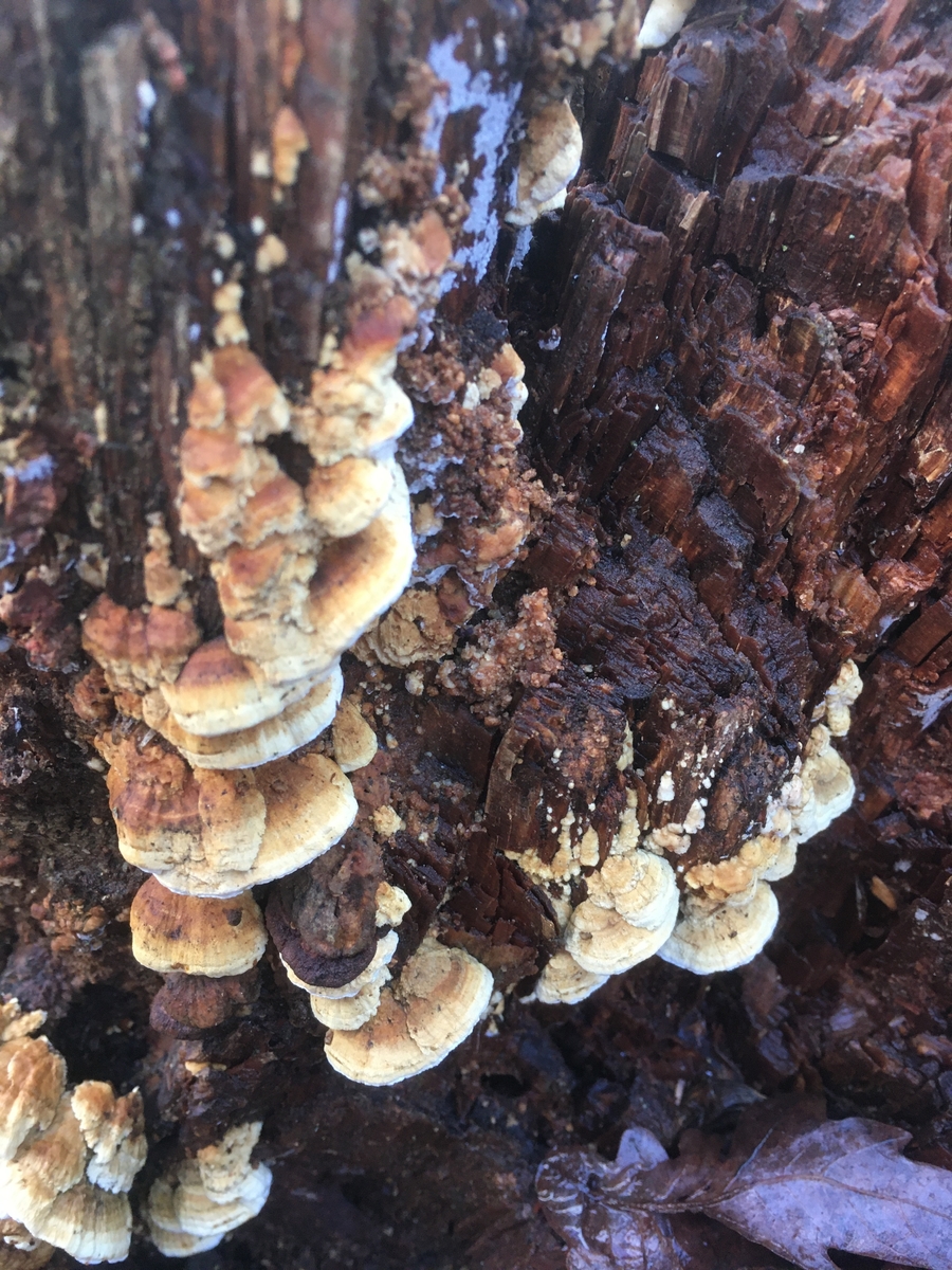 Die Fruchtkörper von Trametes ochracea sind alelrdings schon ziemlich klumpig, und vor allem im bereich der Anwuchsstelle oft krass knubbelig verdickt. Das sieht man bei deiner Kollektion schon auch, dürfte hier aber daran liegen, daß die eben oben auf der Schnittfläche gebildet wurden. In der Position macht Trametes versicolor das nämlich auch, und wenn die Bedingungen passen, dann können versicolor - Fruchtkörper auch mal relativ fettfleischig ausfallen. Übrigens besonders gerne an Weichhölzern, auch an Birken sinid mir überfettete Schmetterlinge immer wieder mal begegnet.