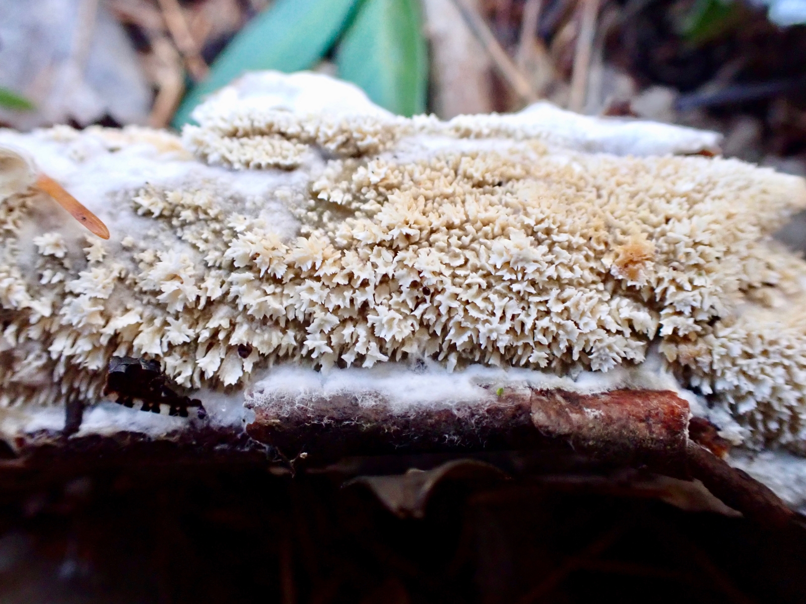 Der Pilz dürfte noch sehr jung sein. Die vergleichsweise fleischigen Fruchtkörper und der große Porenabstand (1-3 Poren/mm) ließen eher O. latemarginatus vermuten. Die Mikroskopie spricht eher für O. corticola: