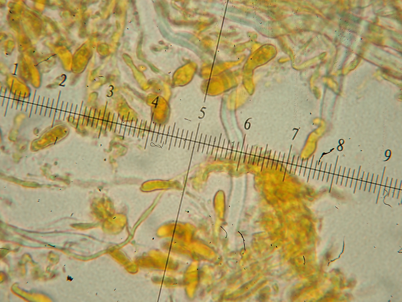 Sporen allantoid ca. 5x1,5 ym, vier Sterigmen, recht kleine keulige Basidien mit Basalschnallen, dimtische Hyphenstruktur, haben mich zu dieser Bestimmung geführt.