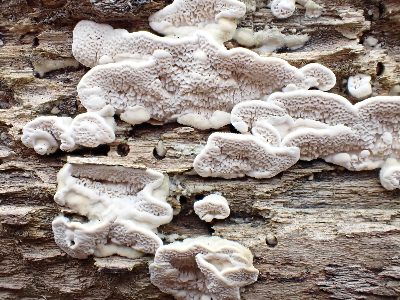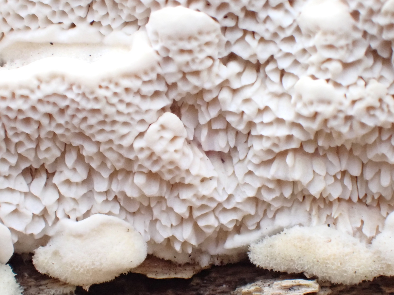 Der Pilz dürfte noch sehr jung sein. Die vergleichsweise fleischigen Fruchtkörper und der große Porenabstand (1-3 Poren/mm) ließen eher O. latemarginatus vermuten. Die Mikroskopie spricht eher für O. corticola: