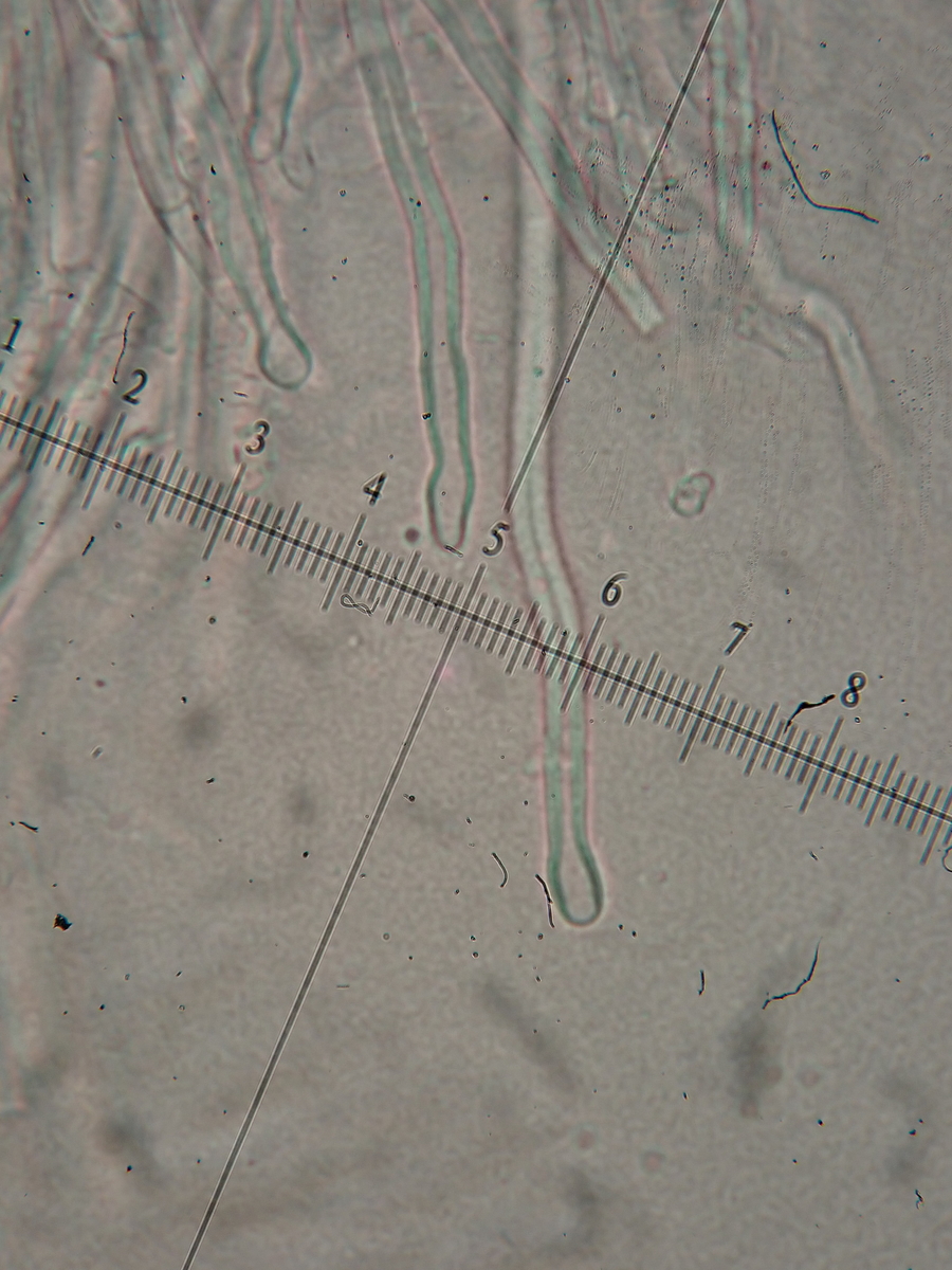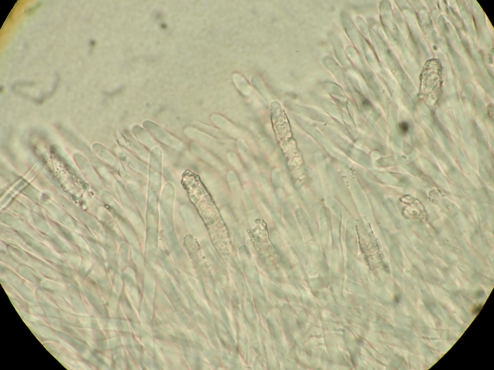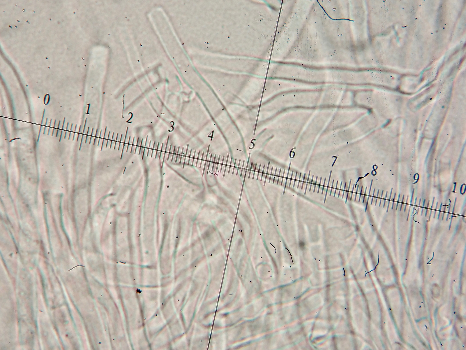Hyphen im Subikulum max. 5ym, Gloeozystiden konnte ich nicht sehen. Ich hatte allerdings kein Phloxin zum Anfärben zur Verfügung.