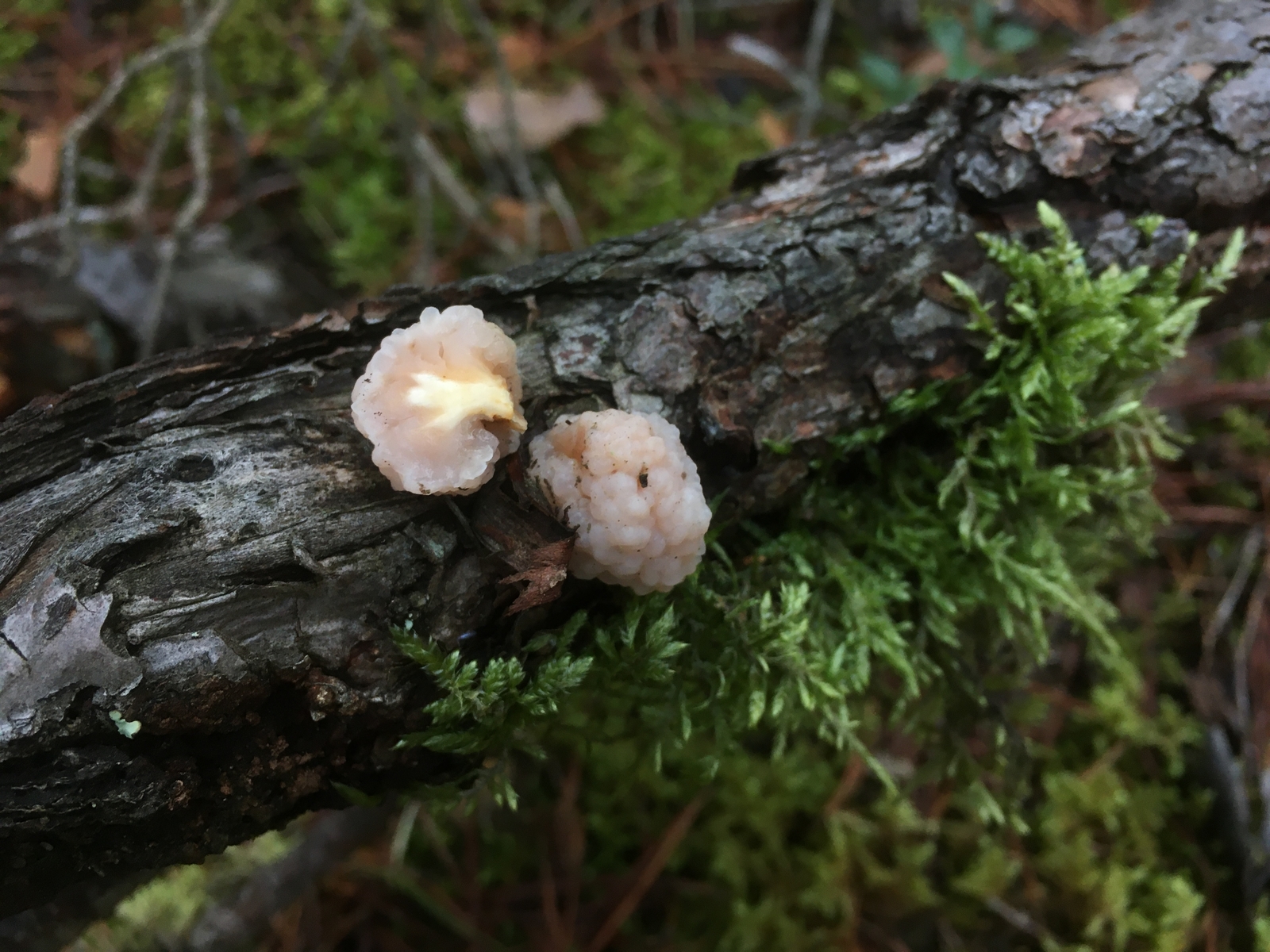 1) Zunächst fand ich an Kiefer diesen hübschen gehirnigen Zitterling, der sich nach dem Durchschneiden auch als solcher bestätigen ließ. Weil er auch im Innersten ganz ansehnlich ist habe ich ihn trotzdem auch noch unters Glas gelegt.