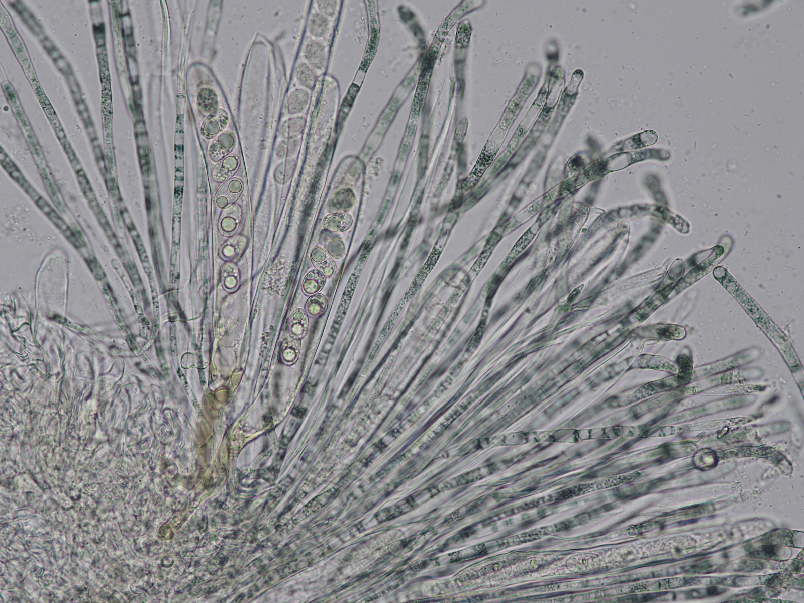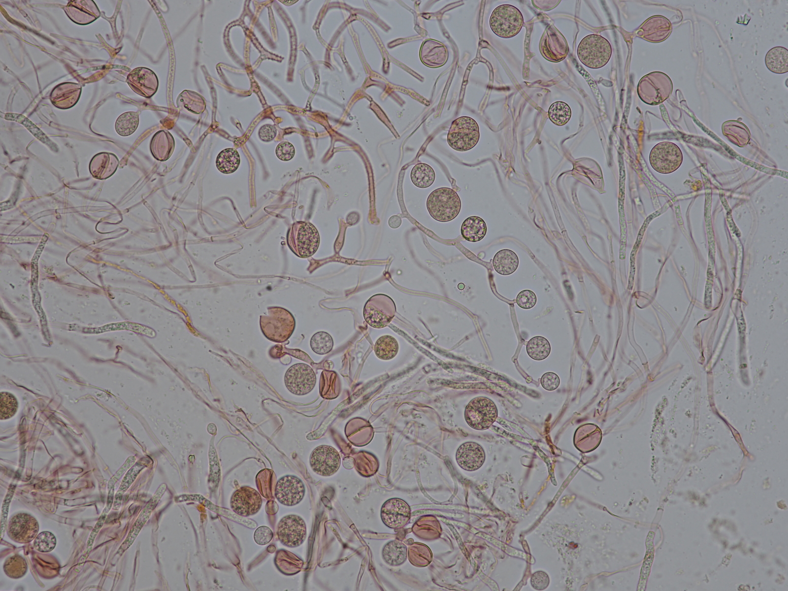Die Sporenträger die ich fand waren unseptierte Stiele mit straussartigem Sporenansatz, wogegen die Sporen aus dem Abwurf, wie ihr bemerkt habt einen deutlichen Apikulus haben. Mysteriös, denn ich habe den FK des Abwurfs mikroskopiert:/