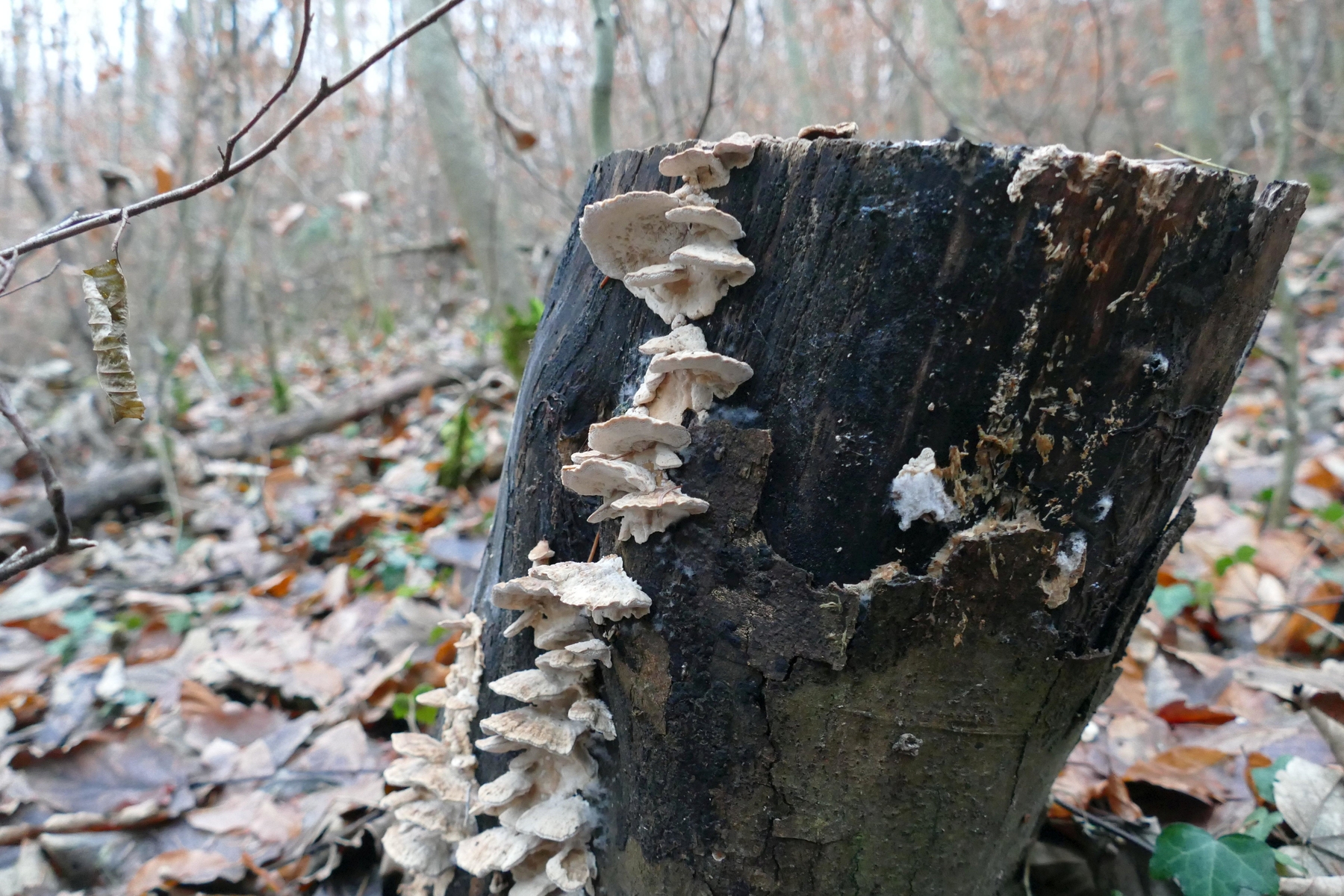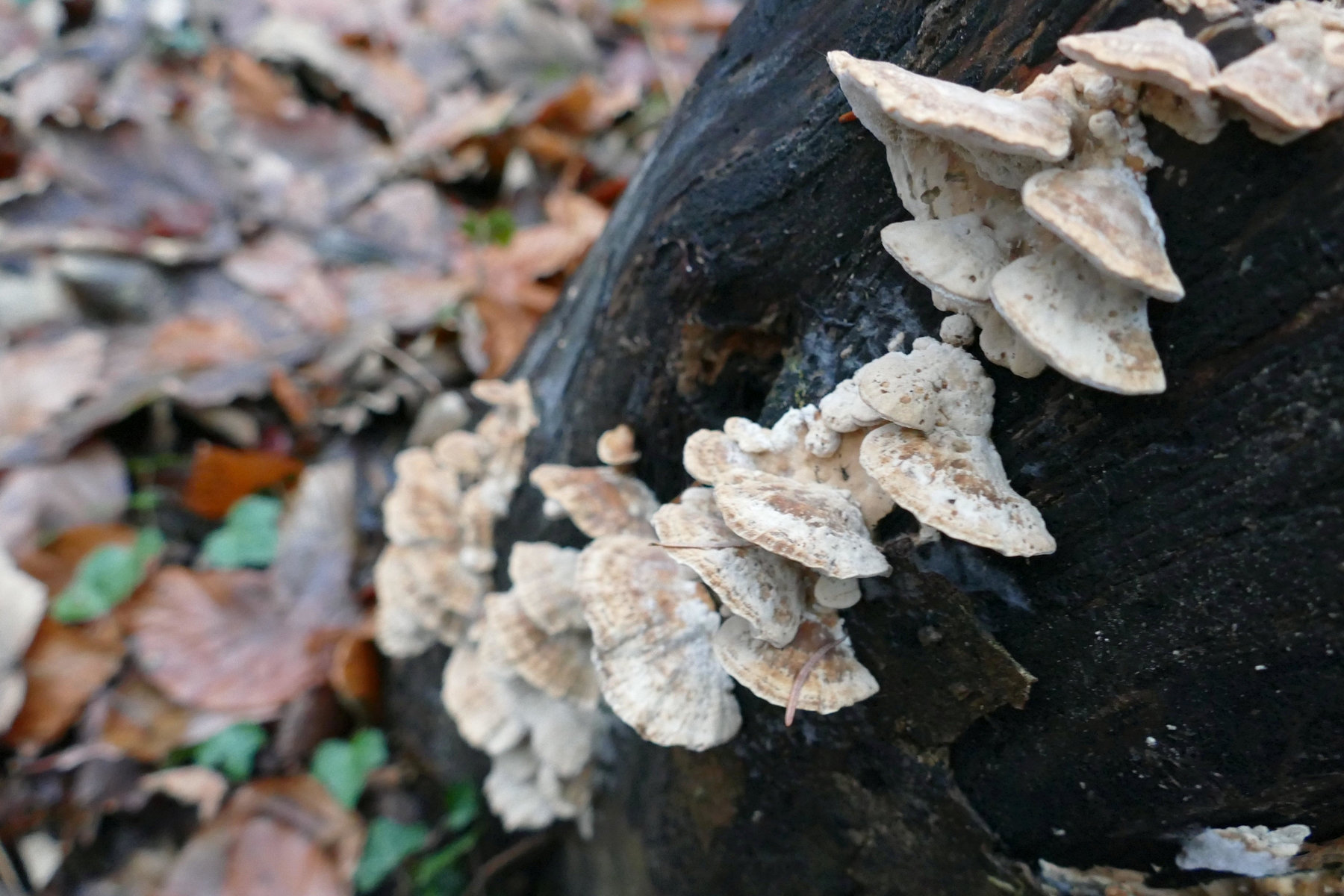 Fundumstände wie bei Pilz 1 im Buchen-Laubwald, an einem stärker zersetzten Baumstumpf.