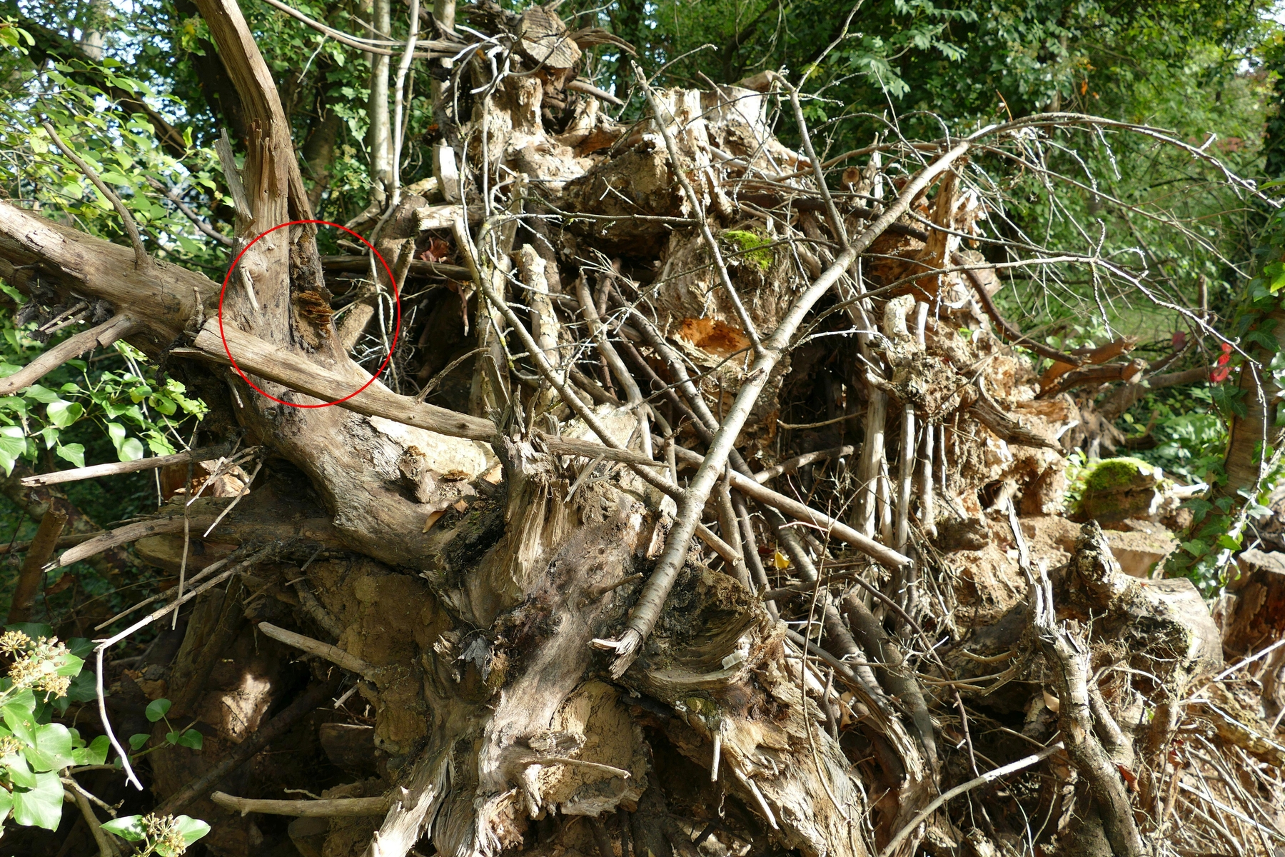 Gefunden am Waldesrand neben Obstgärten, auf einem Haufen ausgerissener Wurzelstöcke, vermutlich alter Obstbäume.