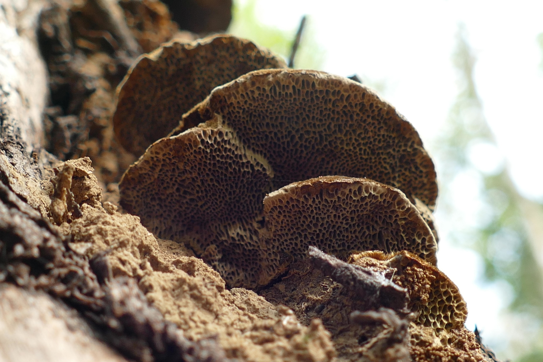 3) Ein haariger, dunkelbrauner Porling mit groben, graubraunen, unregelmäßig geformten Poren.